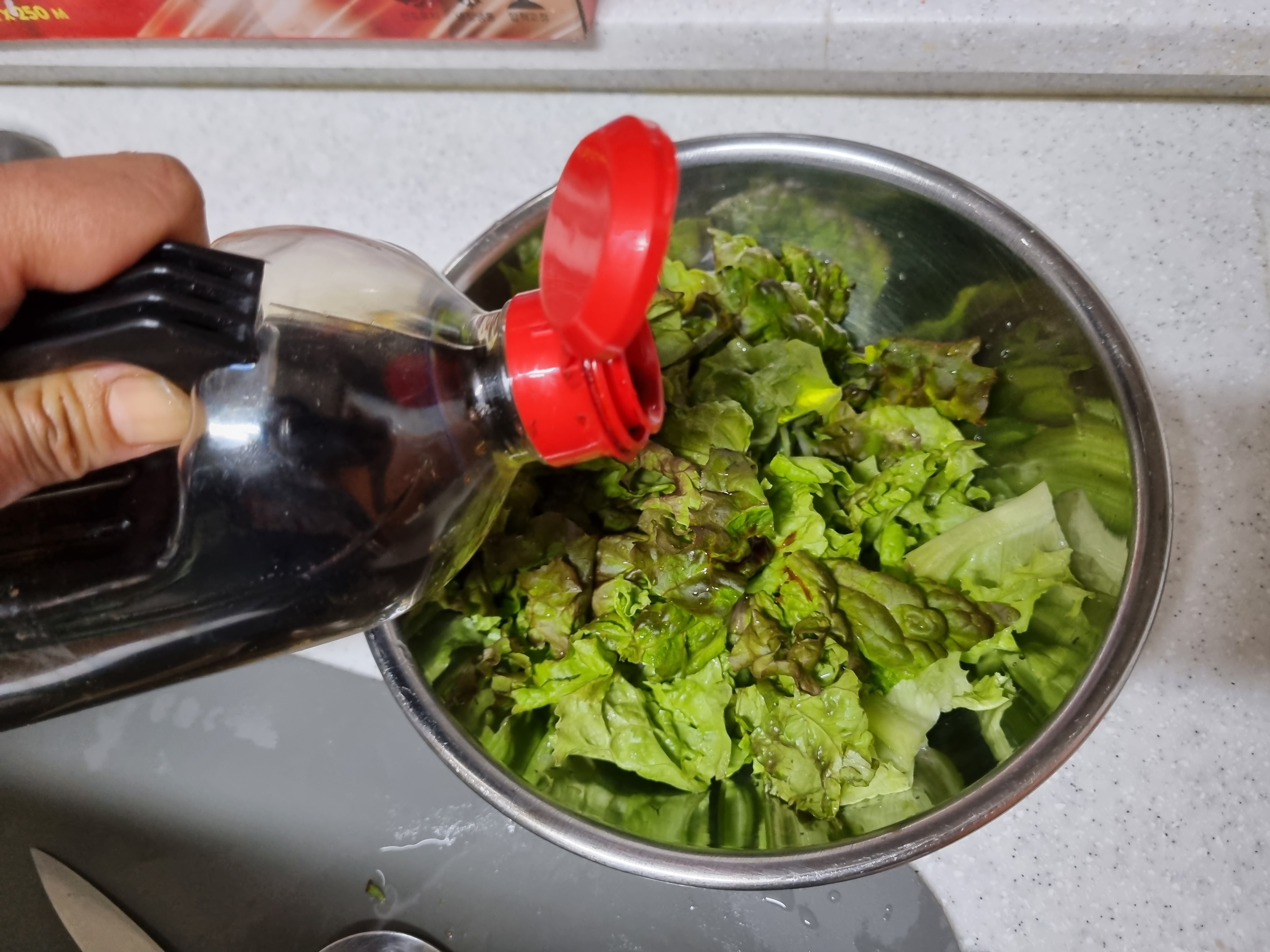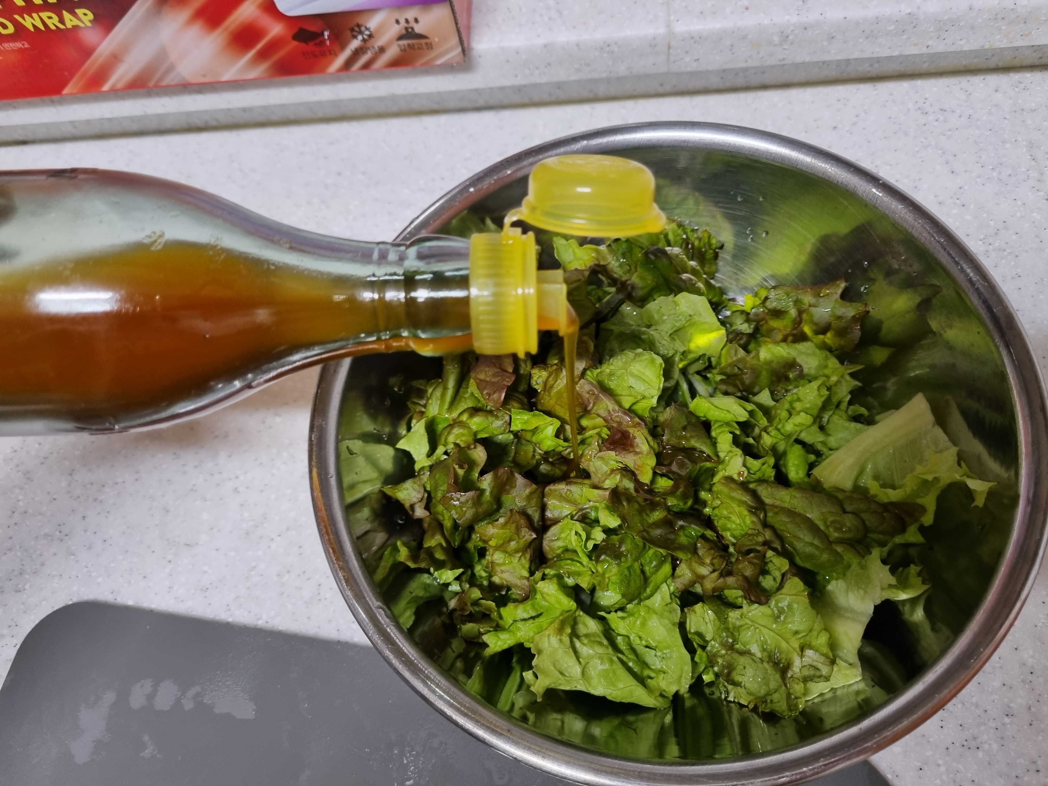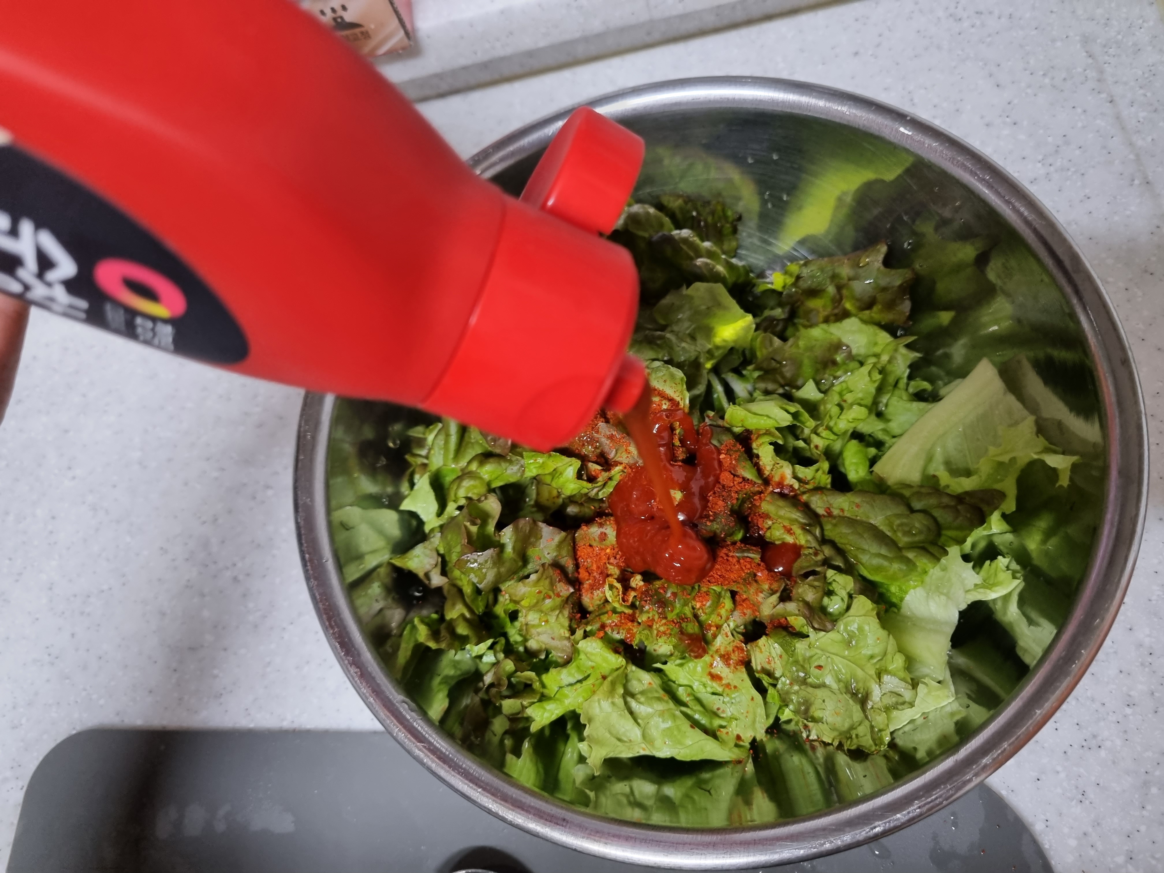 아차차! 설탕도 반 숟가락 넣어요. 그리고 버무려요. 살살 살~ 주무르면 상추가 숨이 금방 죽어요. 아주 살살 뒤적이는 정도면 충분해요.