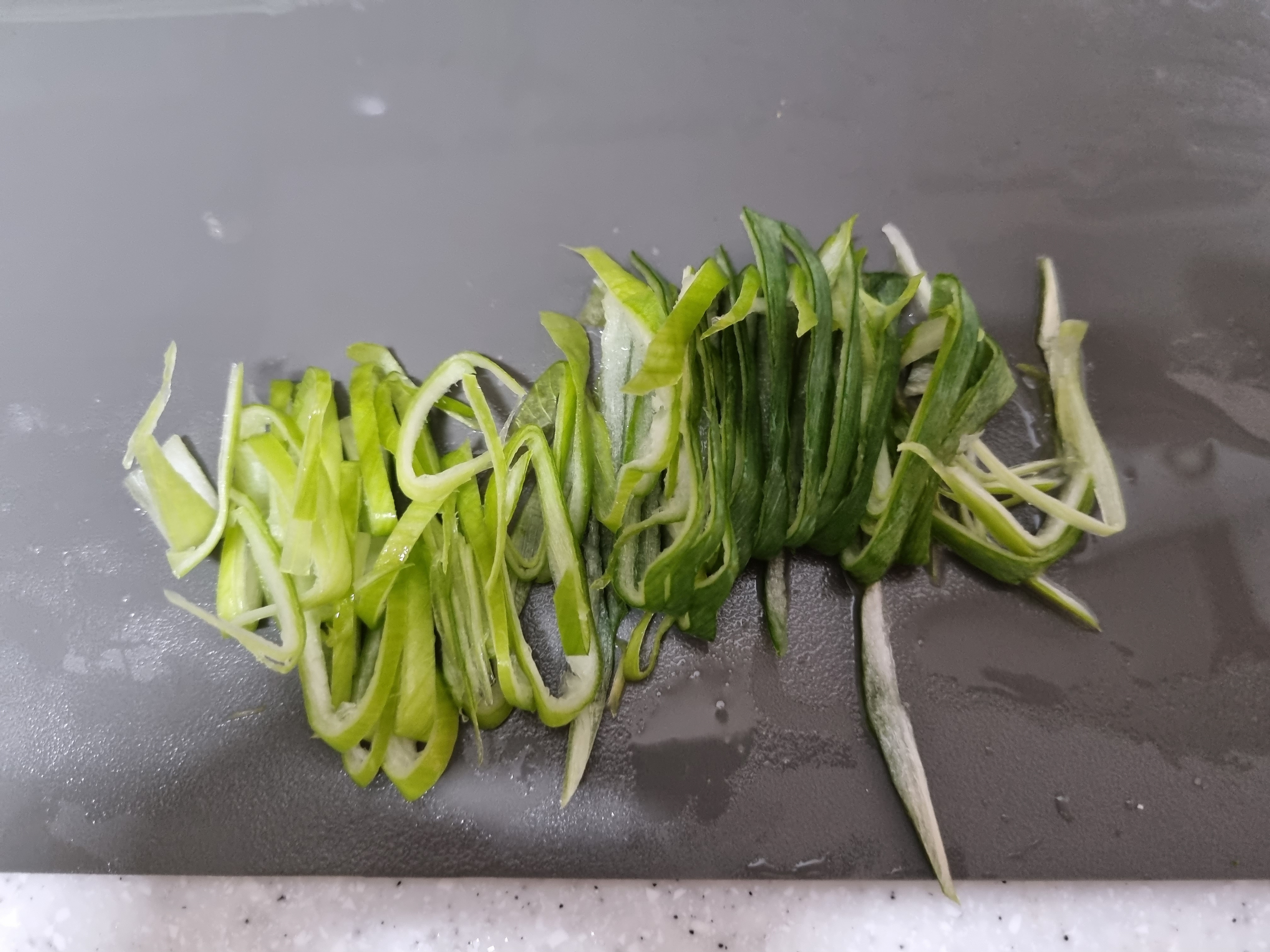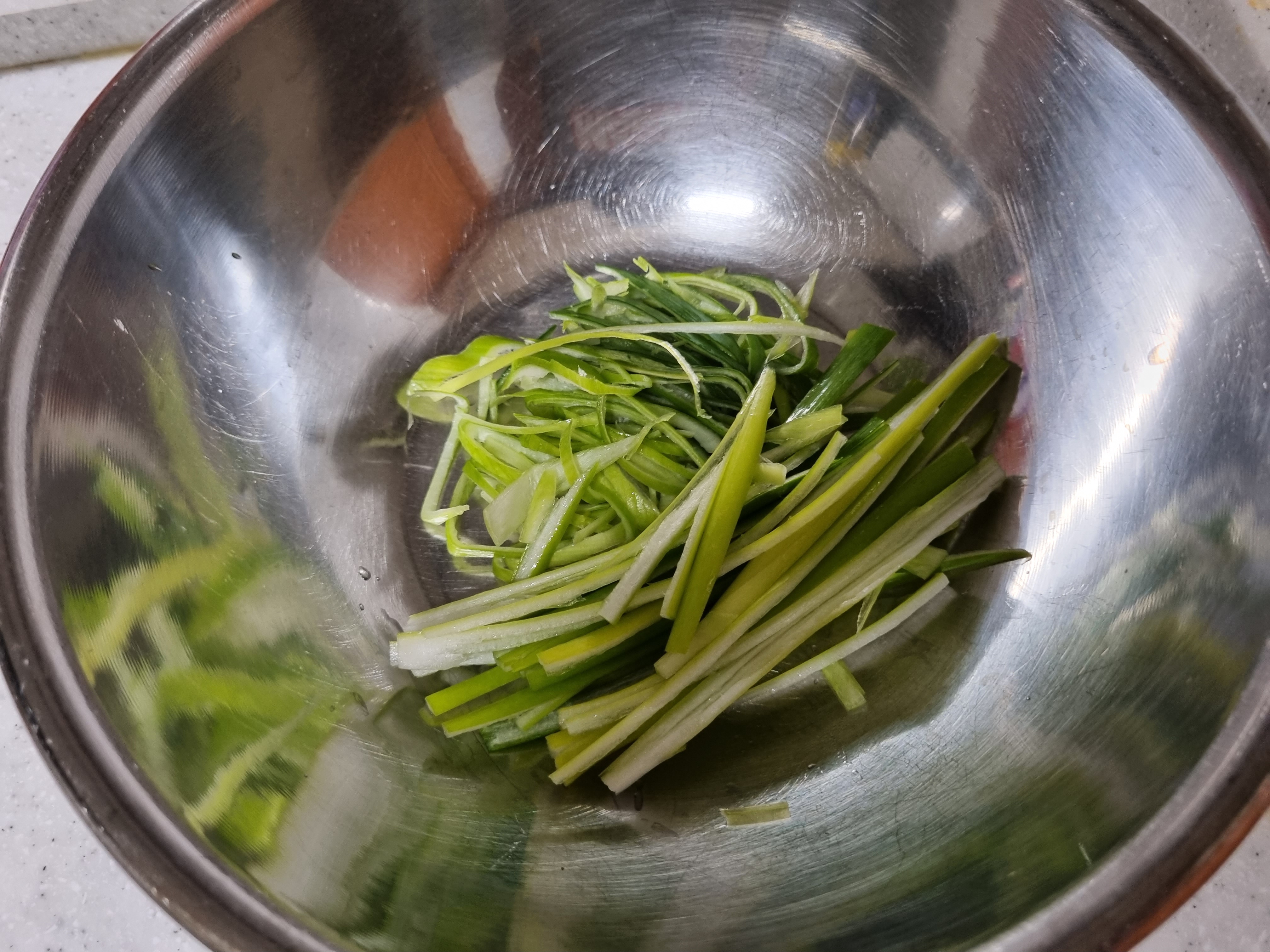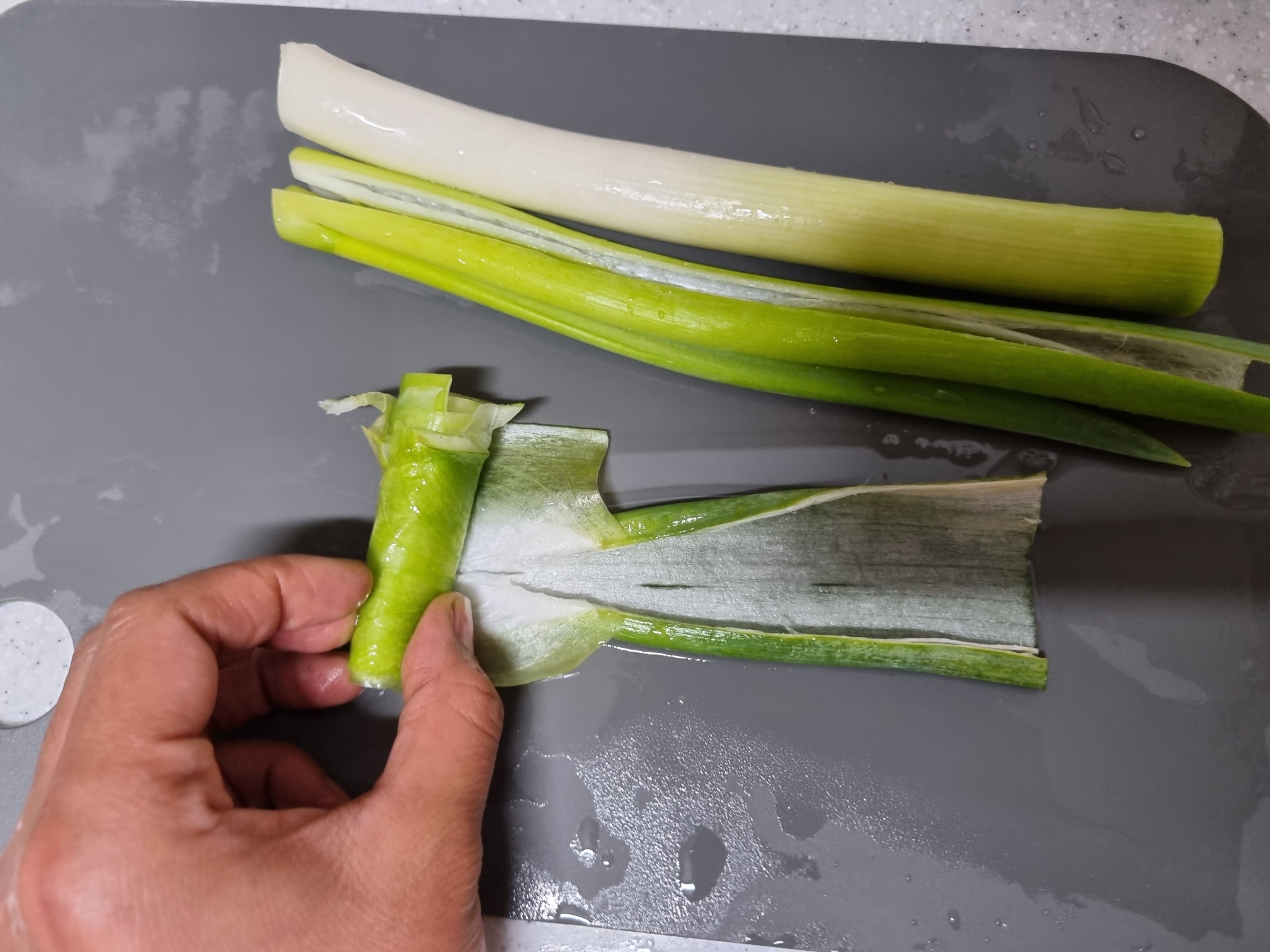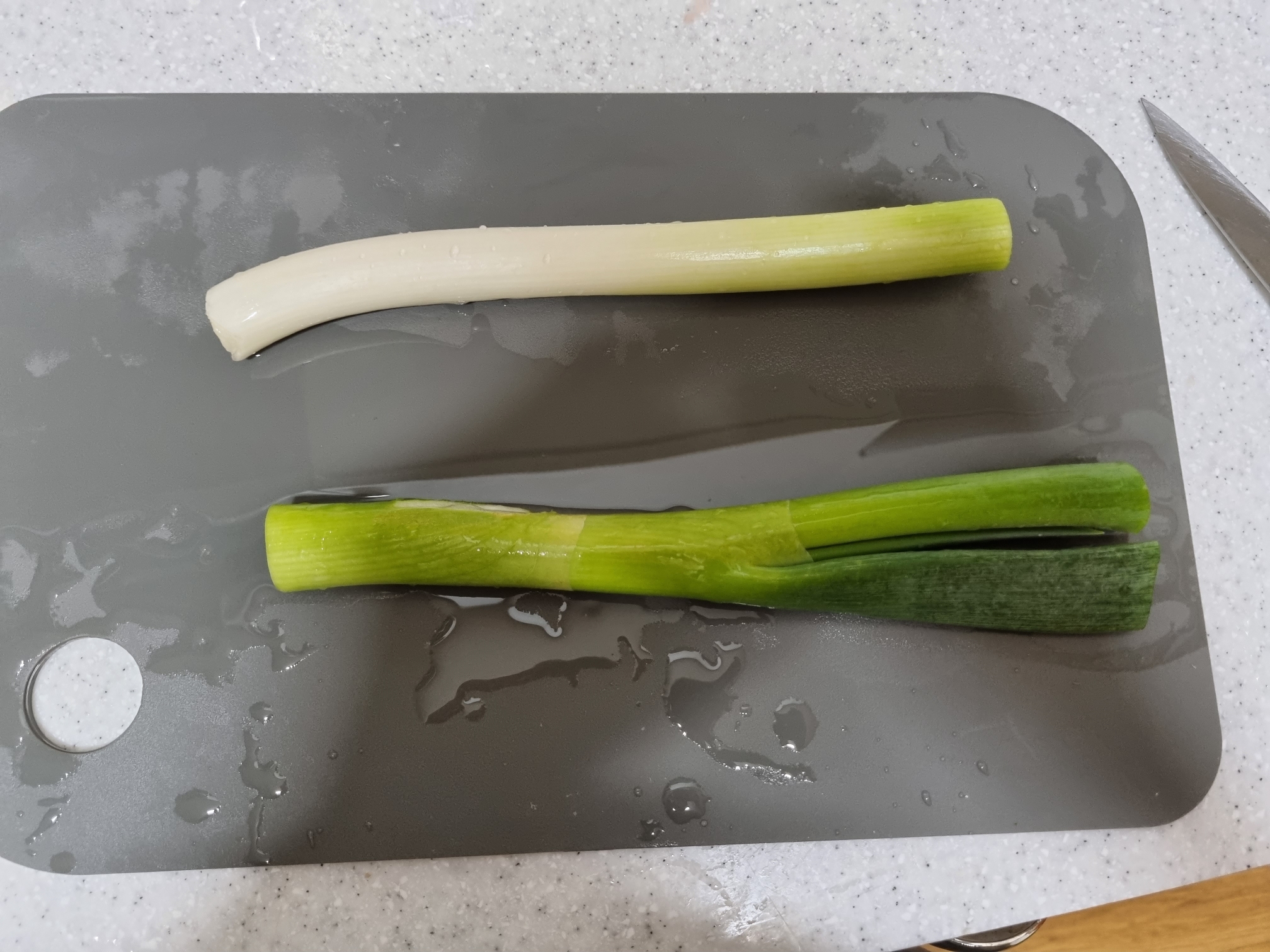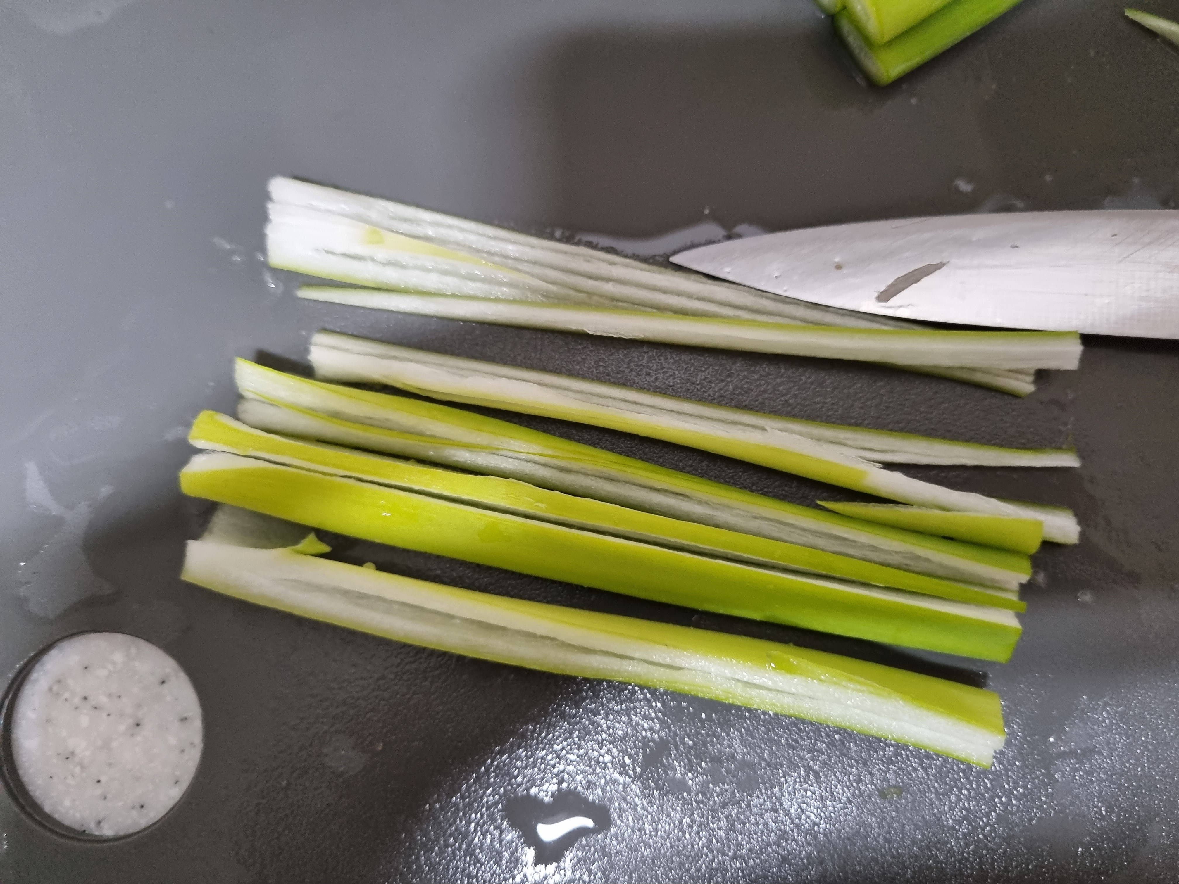 너무 싱싱해서 돌돌 말리지 않는 대파는 그냥 세로로 잘라요. 진정한 고난도 칼질이에요.