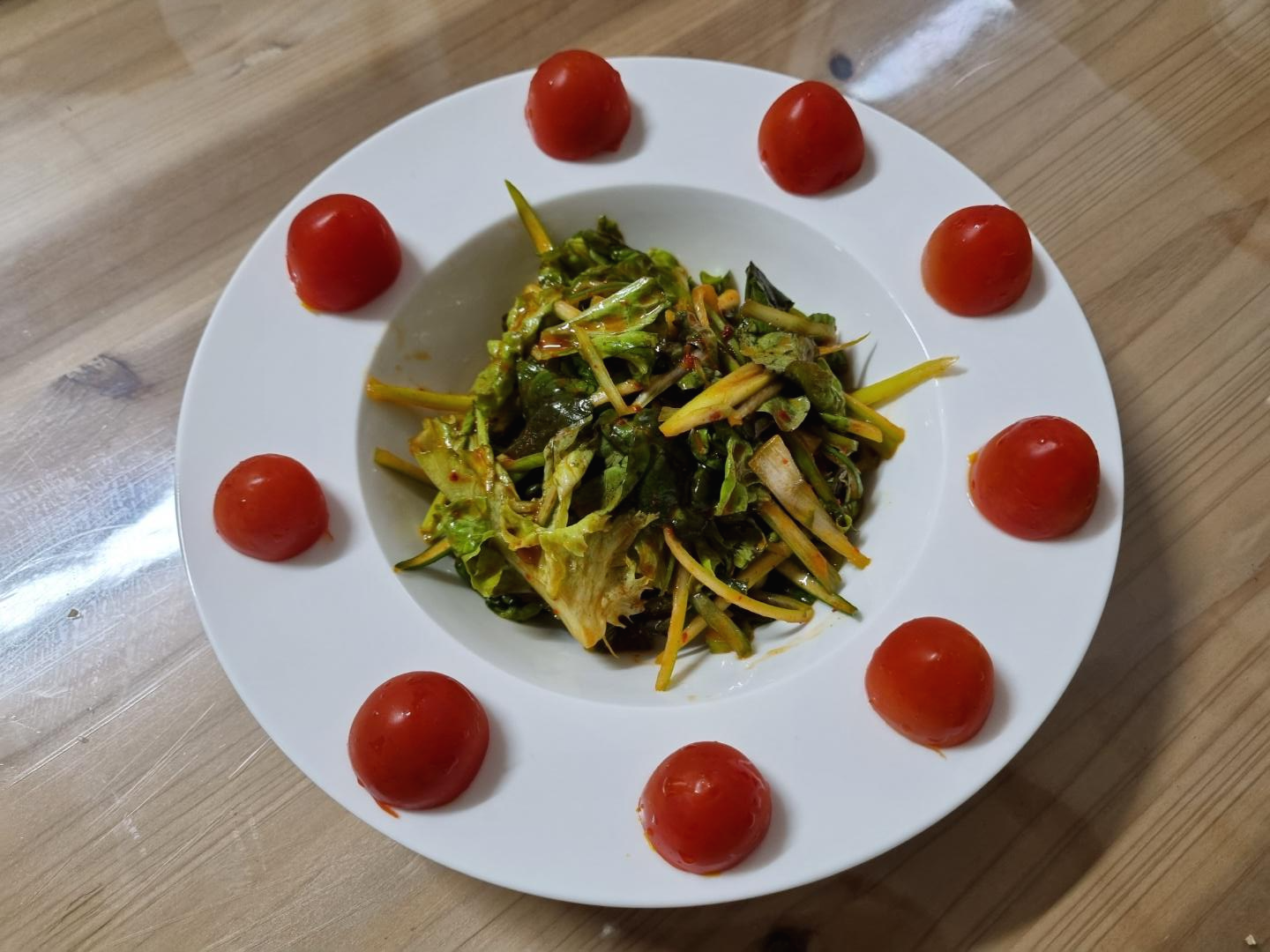아차차!!! 깻잎도 있는데. 같이 버무릴걸~ 그냥 위에 살짝 올려봐요^^ 깻잎이 미니미니 하네요. 삼겹살의 느끼함을 달래줄 상추, 파절이예요. 새콤, 달콤 맛있죠^^ 마무리는 방울토마토로 끝내요.
