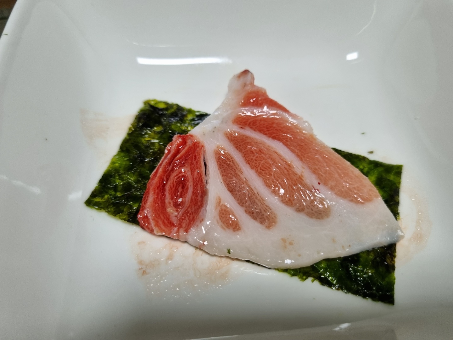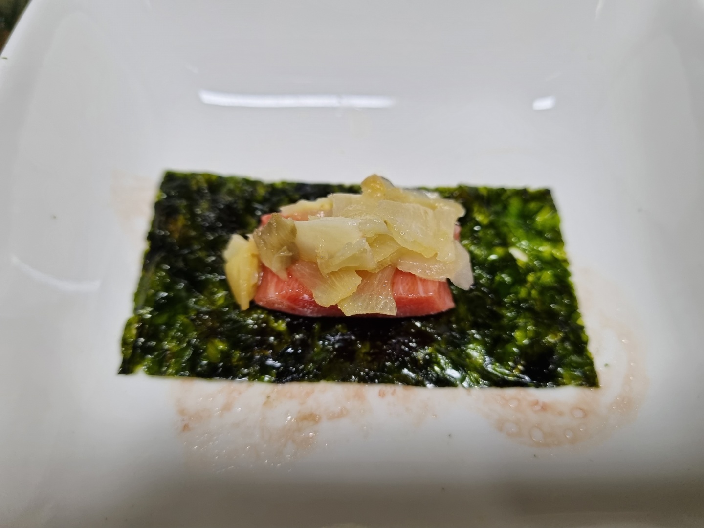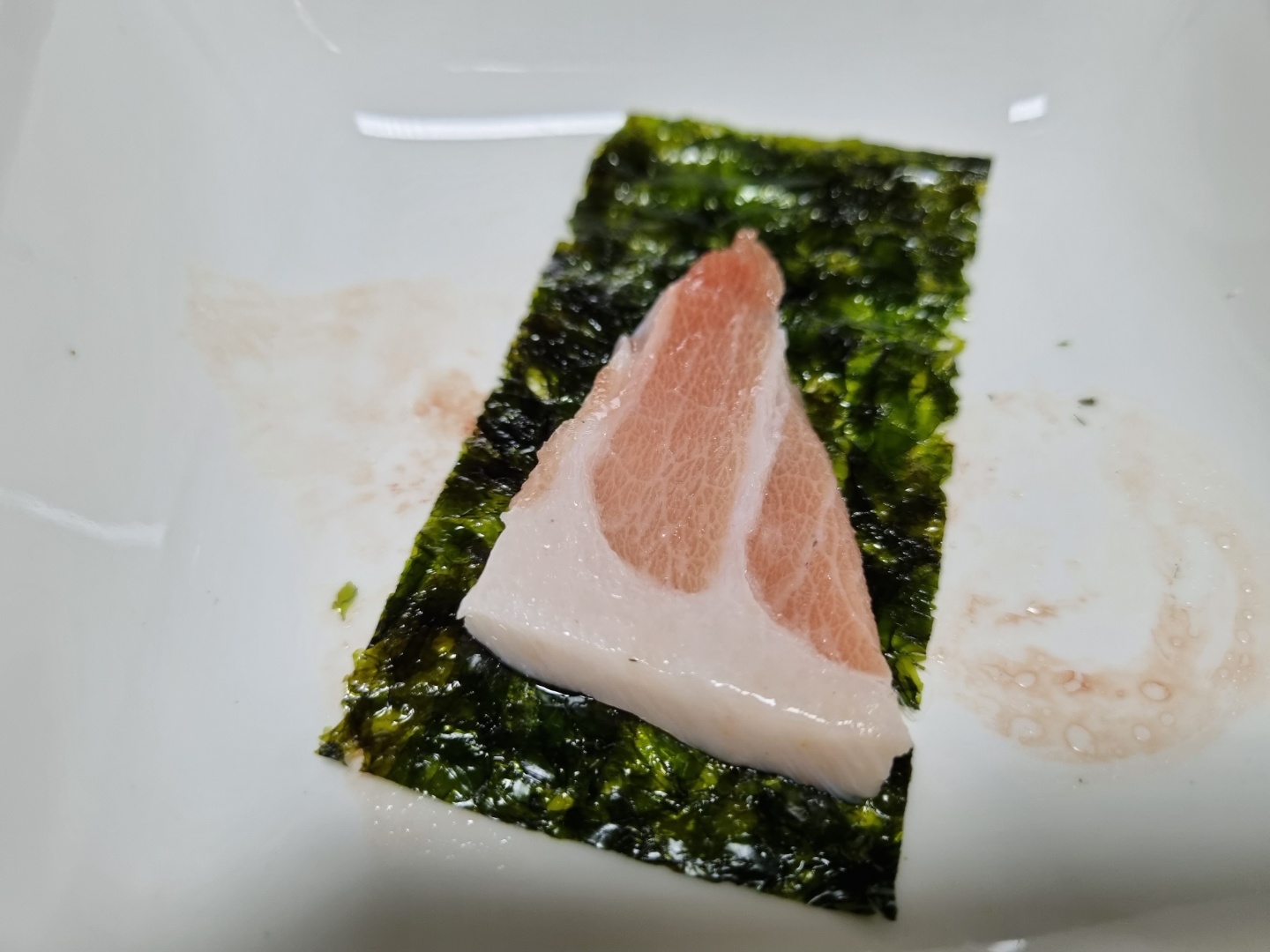 비린맛을 최대한 느끼지 않기 위해서 락교도 넣고 김에 싸서 먹어요. 입에서 기름이 팡팡 터져요. 거의 마지막에 좀 질긴 걸 느끼는데 무순이 질긴 건지 참치가 질긴 건지는 구분이 잘 안 가요. 진짜 이건 못 먹고 뱉을 뻔했어요. 기름진 참치를 좋아하는 사람이라면 배꼽살 추천해요.