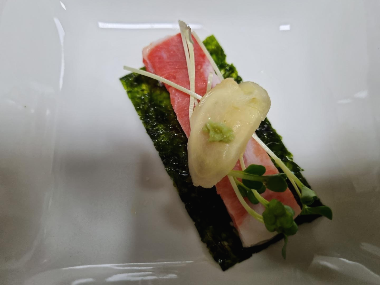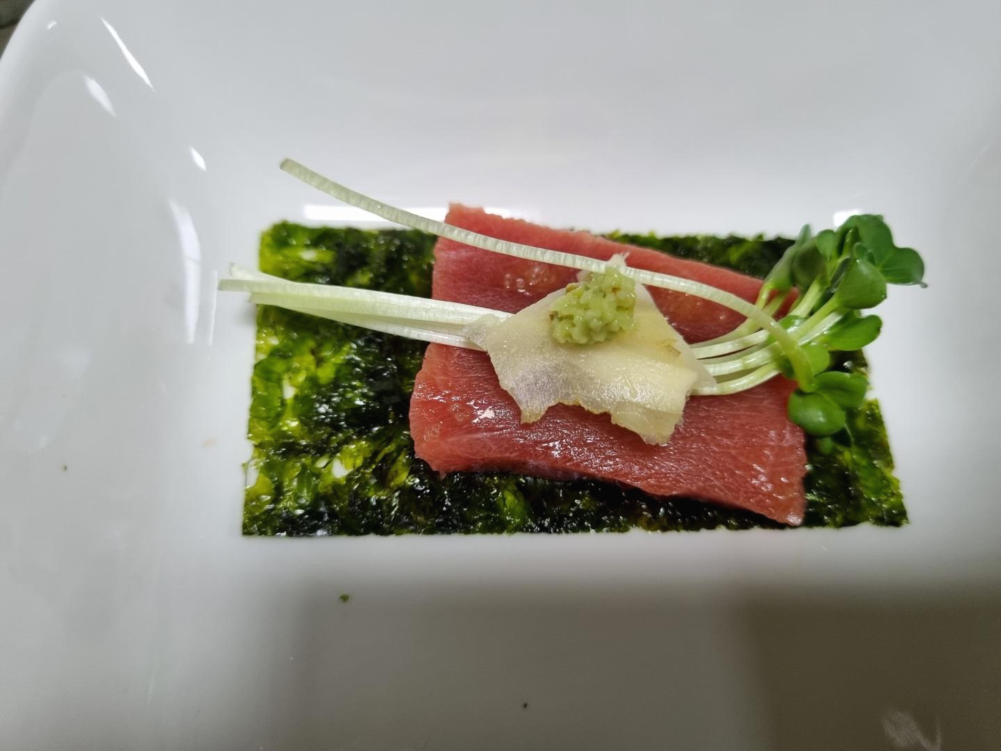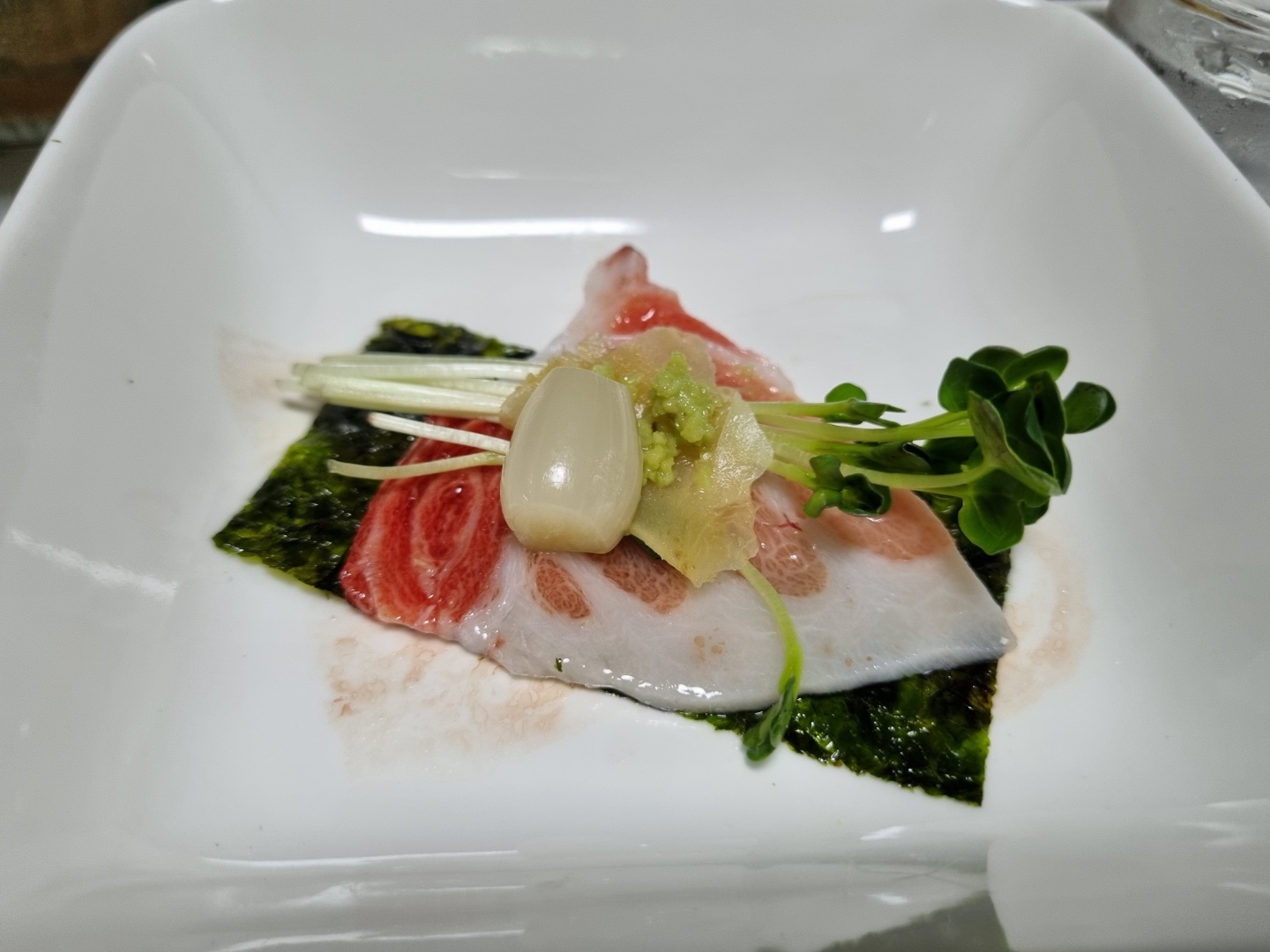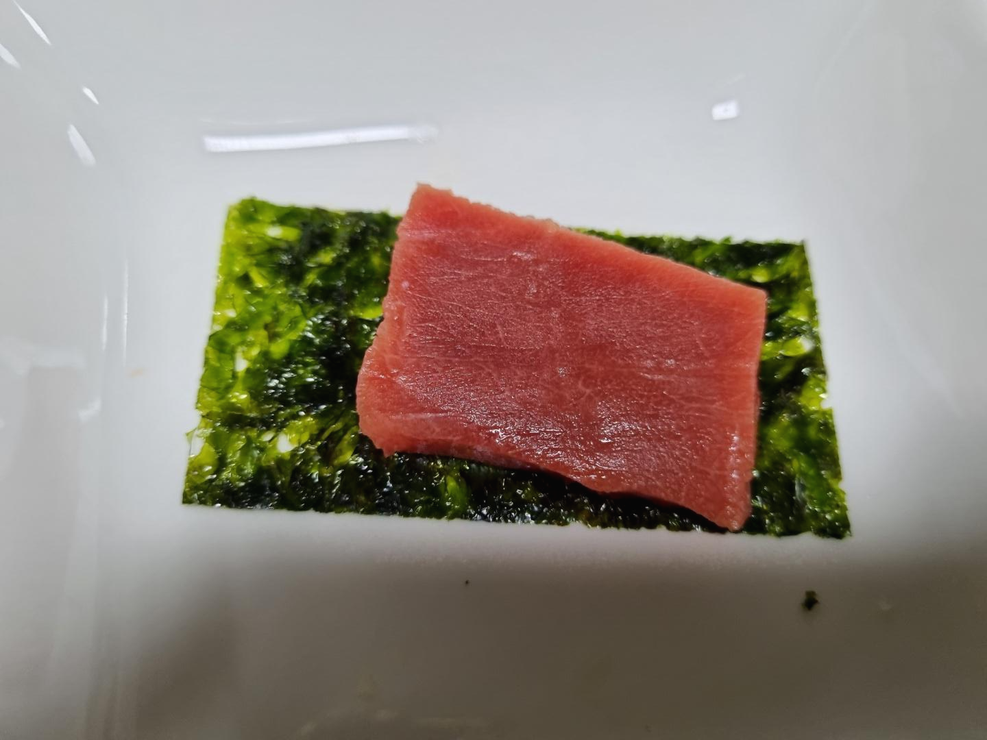 비린맛을 최대한 느끼지 않기 위해서 락교도 넣고 김에 싸서 먹어요. 입에서 기름이 팡팡 터져요. 거의 마지막에 좀 질긴 걸 느끼는데 무순이 질긴 건지 참치가 질긴 건지는 구분이 잘 안 가요. 진짜 이건 못 먹고 뱉을 뻔했어요. 기름진 참치를 좋아하는 사람이라면 배꼽살 추천해요.