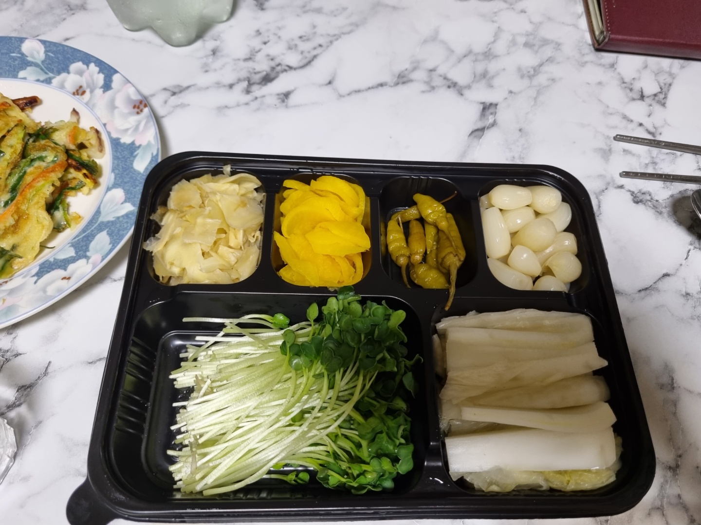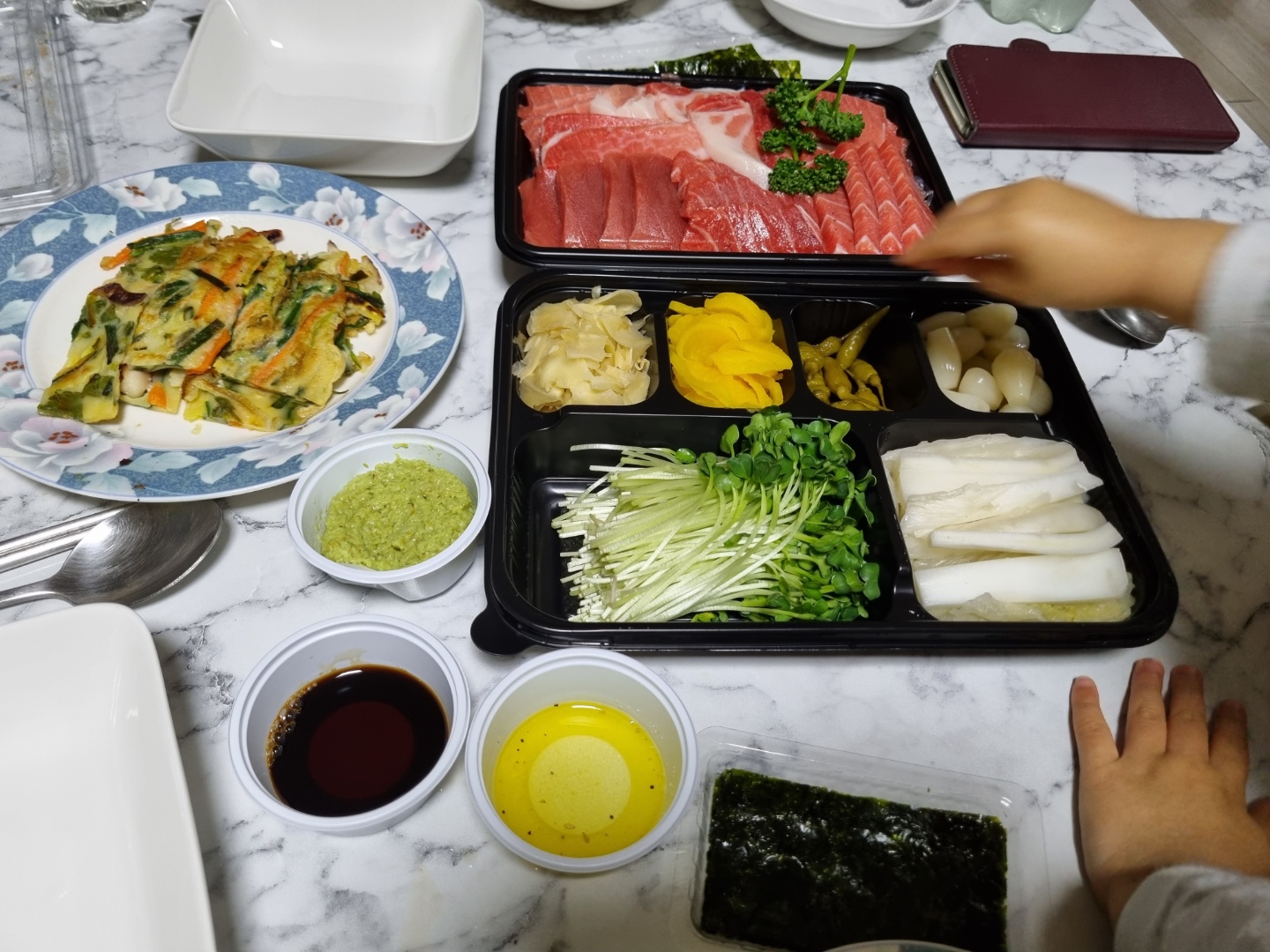일단 먹어요. 김, 와사비, 간장, 기름장, 무순, 배수, 생각, 단무지, 고추지, 락교를 함께 줬어요. 전은 그냥 먹으려고 집에서 부친 거예요.