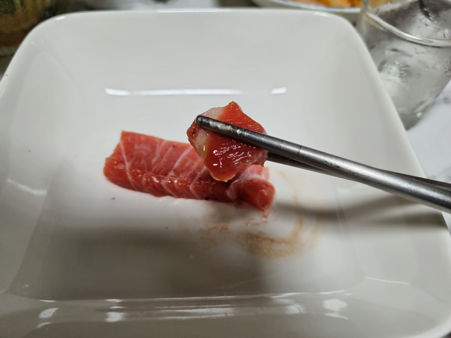 참 다랑어 뱃살 같아요. 정수리살인가?! 물론 쌈에 싸먹어야 해요. 맛있어요.