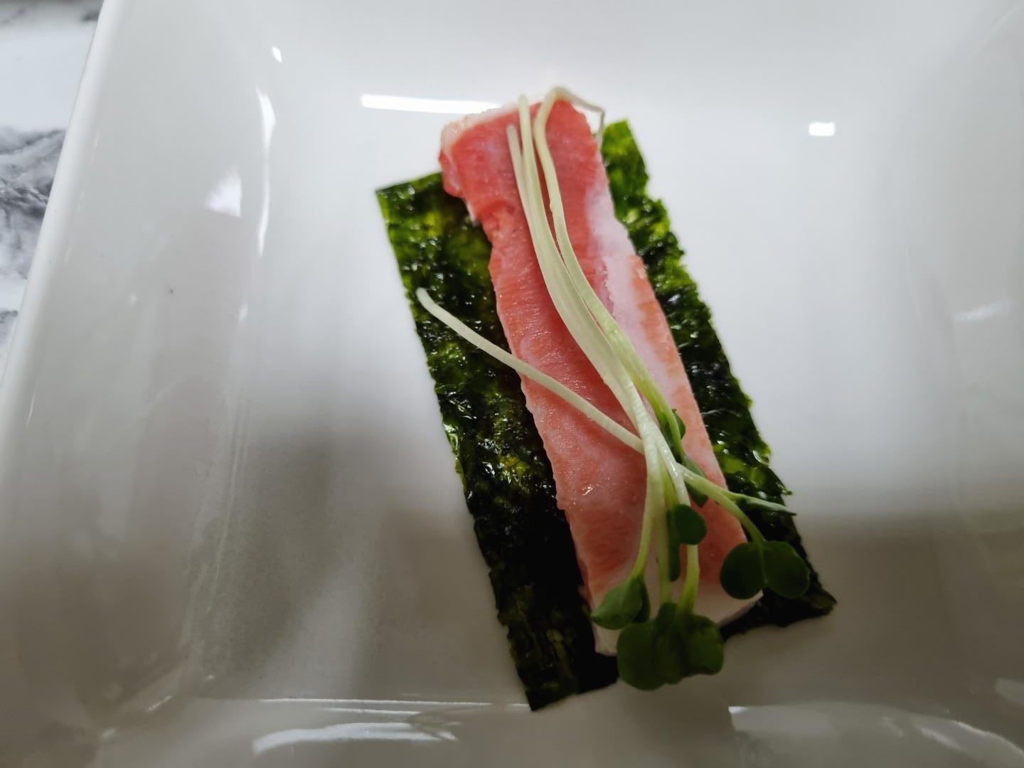 김에 싸서 무순, 생강, 와사비와 함께 먹어요. 음.... 기름이 별로 없어서 그런지 특별하지 않아요. 그냥 회의 식감과 비슷해요.