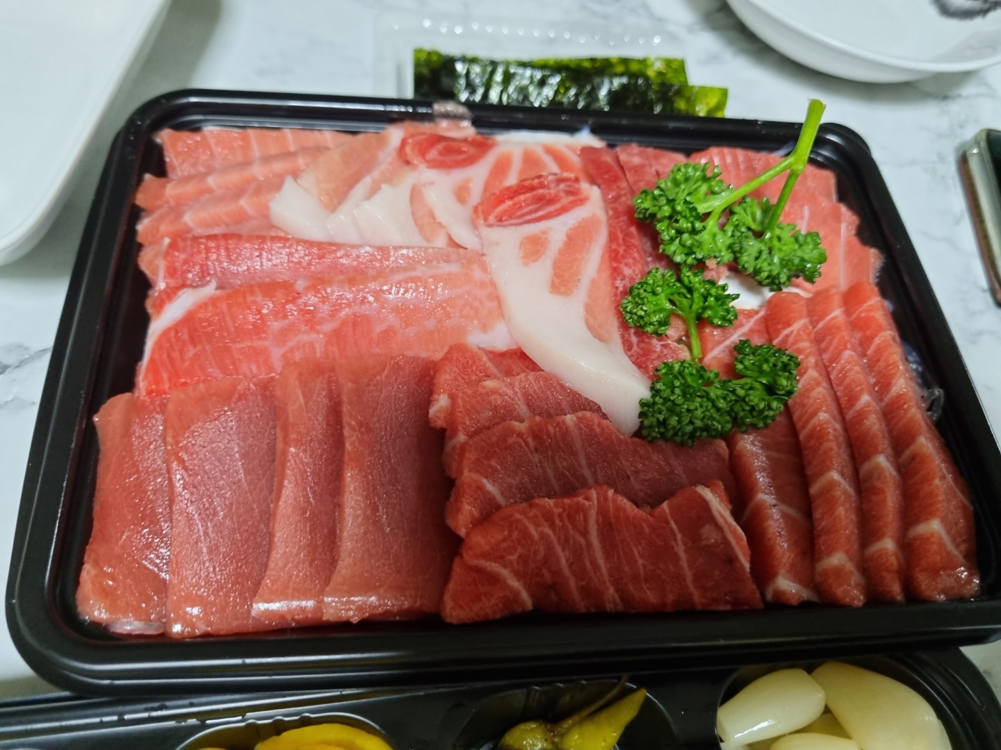 드디어 참치를 먹을 기회가 왔어요. 원래 붉은 살 생산도 싫어하고, 기름 많은 회도 싫어하고, 회도 크게 좋아하지 않아요. 그런데 사람들이 참치회, 참치회 노래를 불러요. 도대체 얼마나 맛있길래. 그래서 참치 맛있다는 집을 고르고 골라 안산 초지동에 있는 참다랑어 막주는집 참치정육점에서 배달을 했어요. 줄여서 참막 참치 정육점이라고 하네요. 배달료가 5천 원이에요. 신랑에게 "배달료가 왜 이렇게 비싸!!" 했지만 거리가 멀다고 배달해 주는 것 만으로 감사하게 생각하라고 하네요. 그래요. 참막 참치 정육점 사장님, 배달 기사님. 비도 오는데 배달해 주셔서 너무 감사드려요.