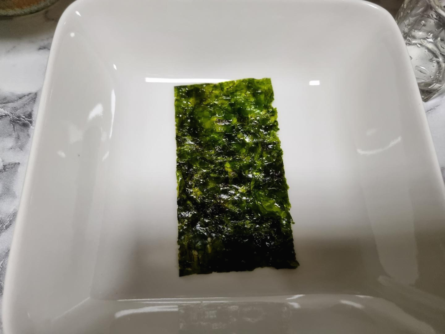 접시에 김을 한 장 올려요. 왜 참치를 김에 싸 먹는지 모르겠지만 사람들도 김에 싸 먹으니깐 나도 한번 김에 싸 봐요.
