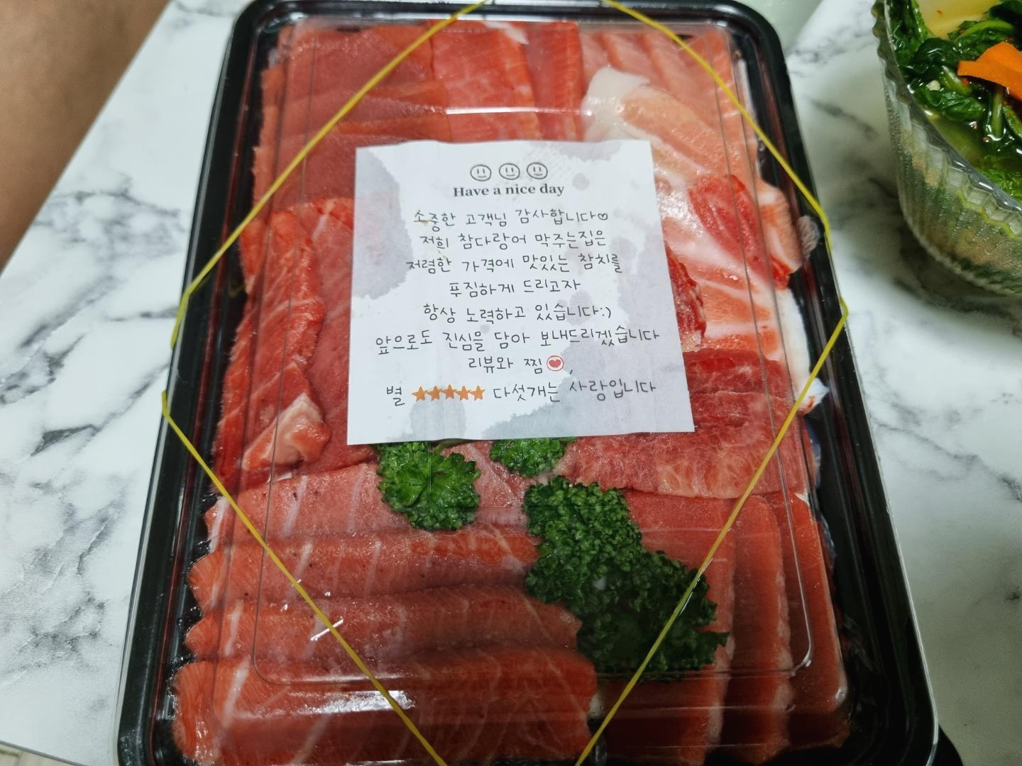 '소중한 고객님 감사합니다. 저희 참다랑어 막주는집은 저렴한 가격에 맛있는 참치를 푸짐하게 드리고자 항상 노력하고 있습니다. 앞으로도 진심을 담아 보내드리겠습니다. 리뷰와 찜♡ 별★★★★★ 다섯개는 사랑입니다.' 이렇게 적혀 있어요.