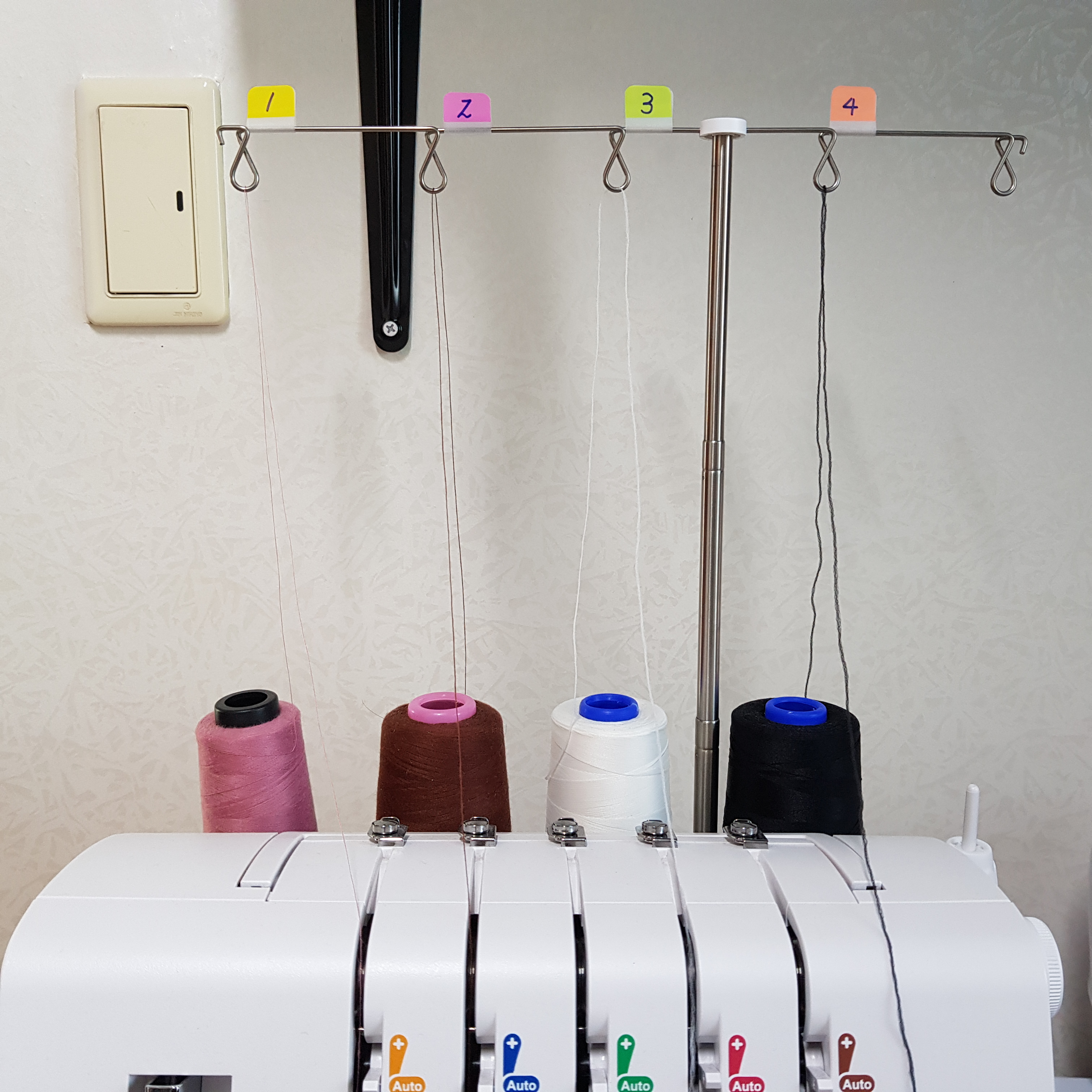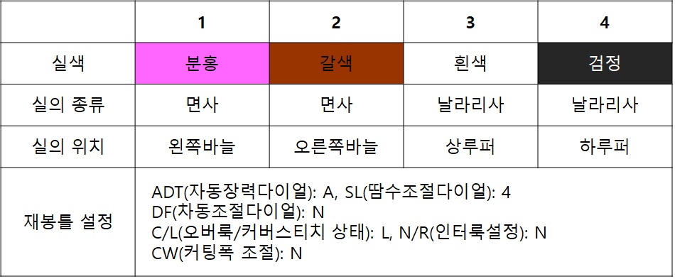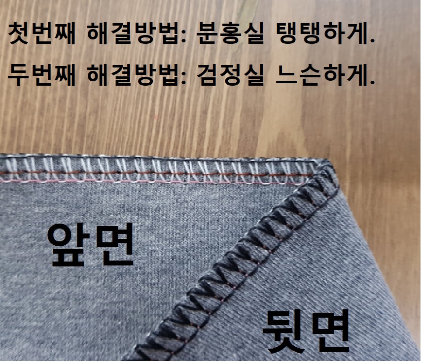 삽질을 하루 종일 한다. 그리고 해결 방법을 찾았다. 2가지가 있다. 일단 아래 사진과 같이 실을 끼우고 오버룩 재봉틀 설정을 했다. 첫 번째 분홍색 왼쪽 바늘 실을 탱탱하게 장력을 조절했다. 아래 해결방법 1 사진을 보면 바늘 실끼리(분홍색, 갈색) 점점 멀어지는 게 보인다. 계속 분홍색 실(왼쪽 바늘 실) 장력을 탱탱하게 조절했다. 결국 실이 끊어진다. 분홍색 장력을 조금만 올리고 두 번째 검정색 실(하루퍼) 장력을 느슨하게 풀었다. 오~ 드디어 시중에 판매하는 기성복 오버록과 같아졌다.