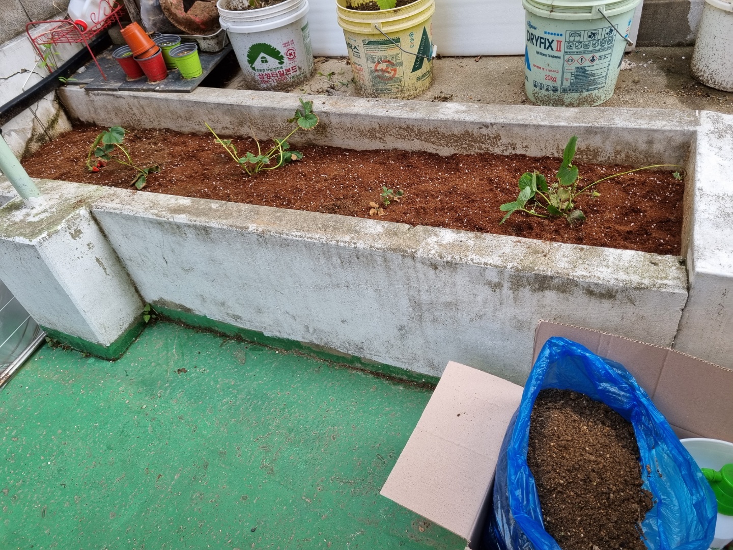 딸기 모종이 죽어가는 두 번째 이유는 비료를 너무 무식하게 많이 준 원인도 있을 것 같다. 비료를 많이 줘도 죽는다고 한다. 지난 글에서 확인할 수 있듯이 1 봉지 줘도 많은 양인데 2 봉지나 줬다. 이제 와서 어쩌겠는가?! 이미 뿌려버린 비료를 걷어 낼 수도 없고. 비료가 희석될 수 있도록 흙을 더 채워야 한다. 분갈이가 아닌 흙갈이를 해야 한다.