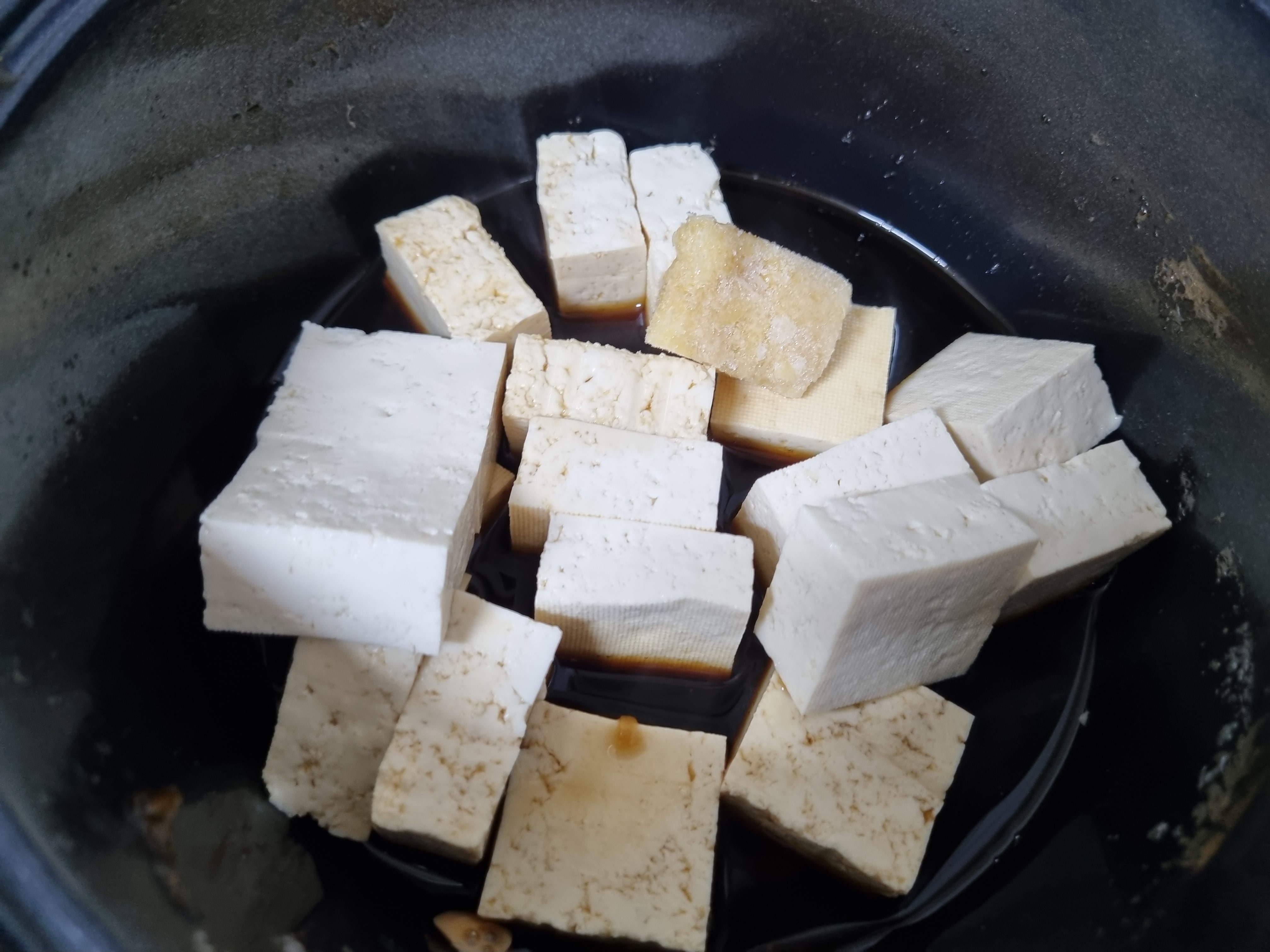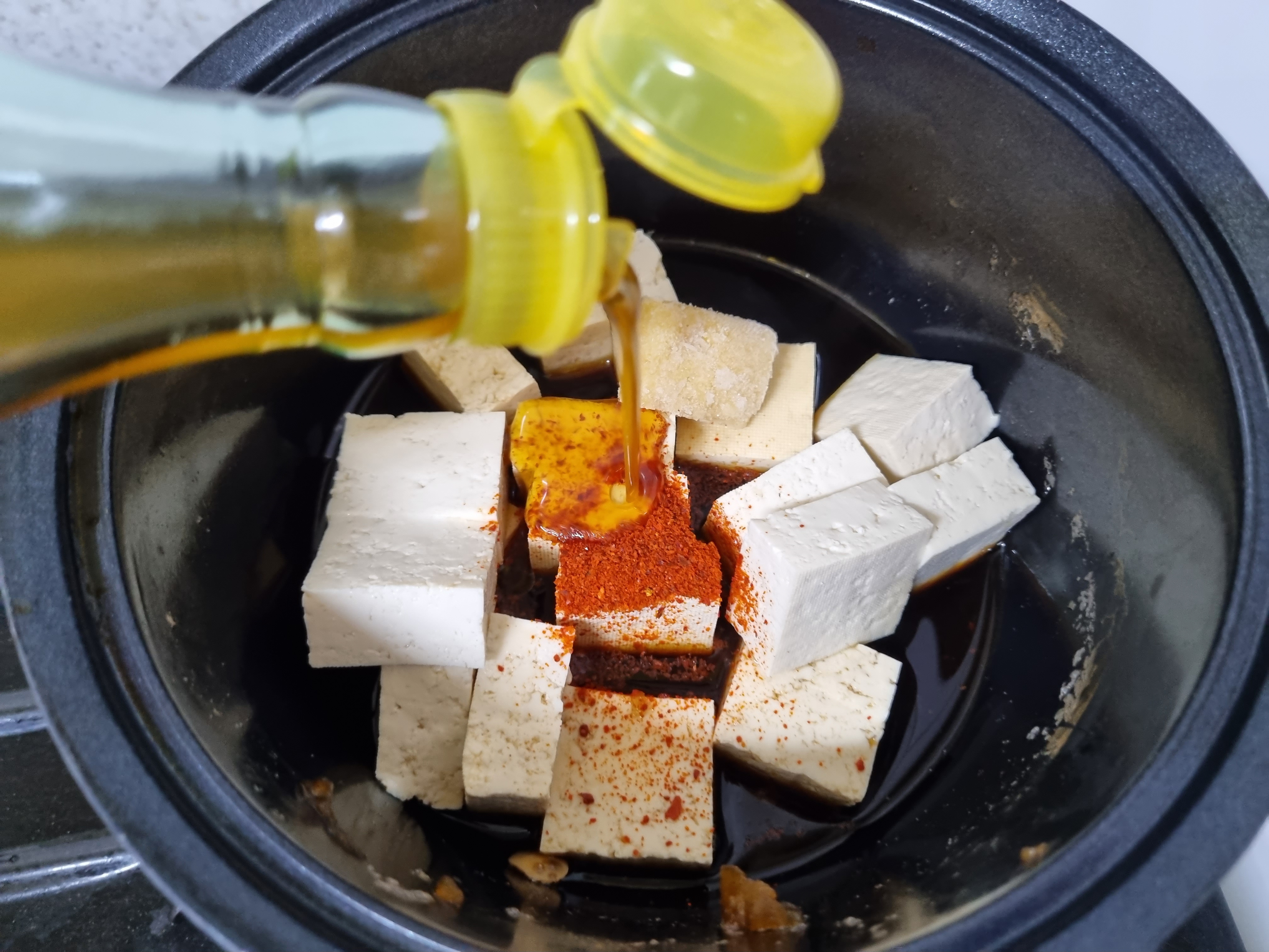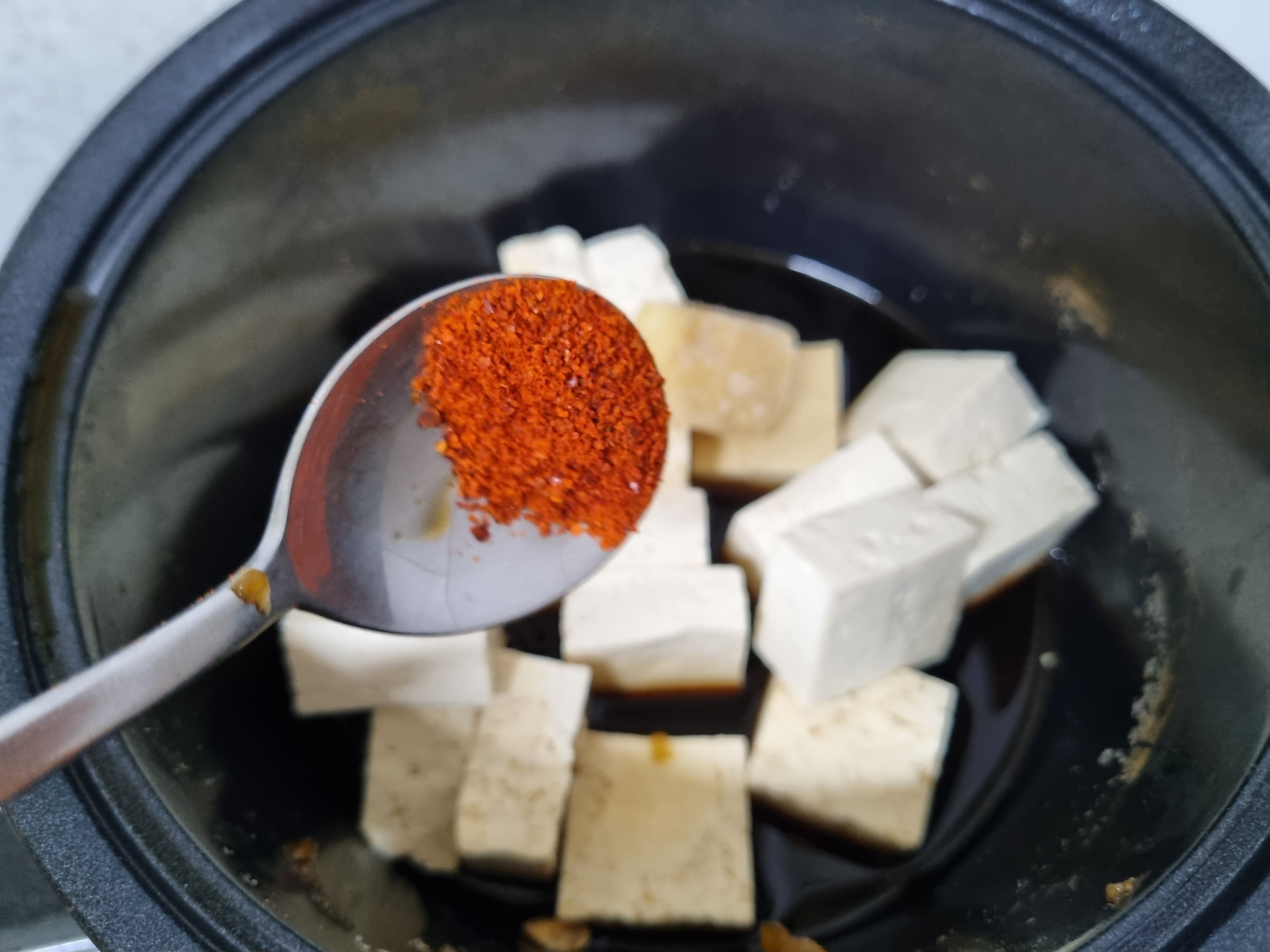 계란 장조림을 꺼내고 남은 간장에 두부를 넣어요.