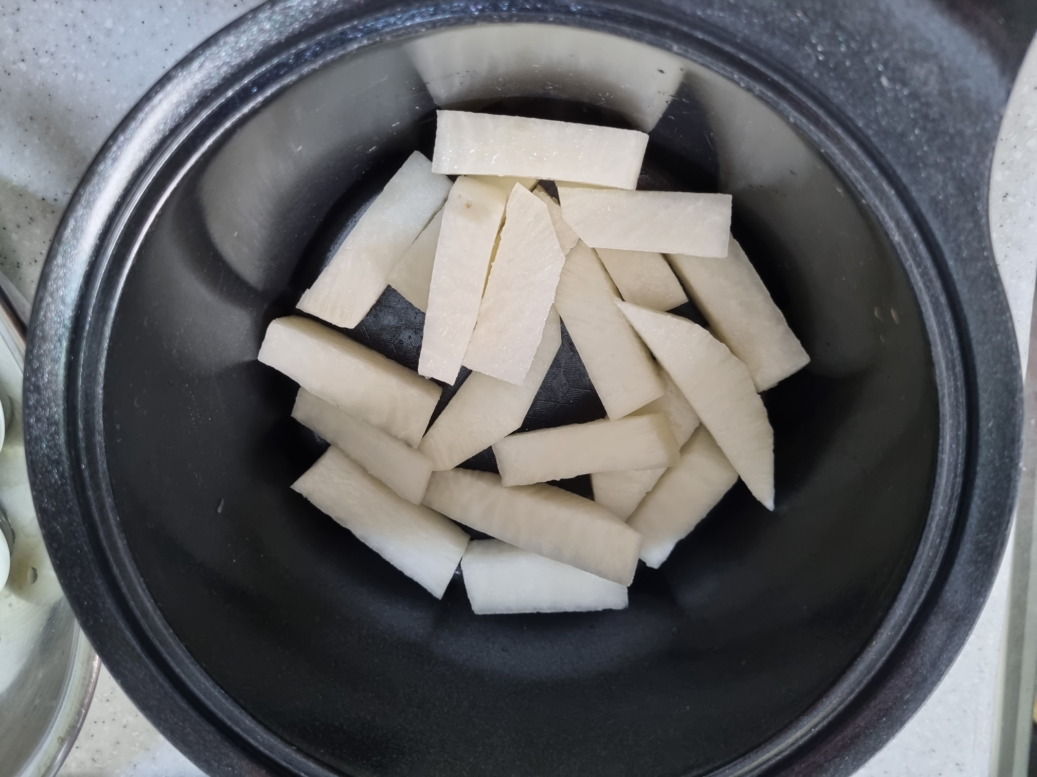 무, 계란 장조림을 하기 위해 썰어둔 무를 냄비에 넣어요.