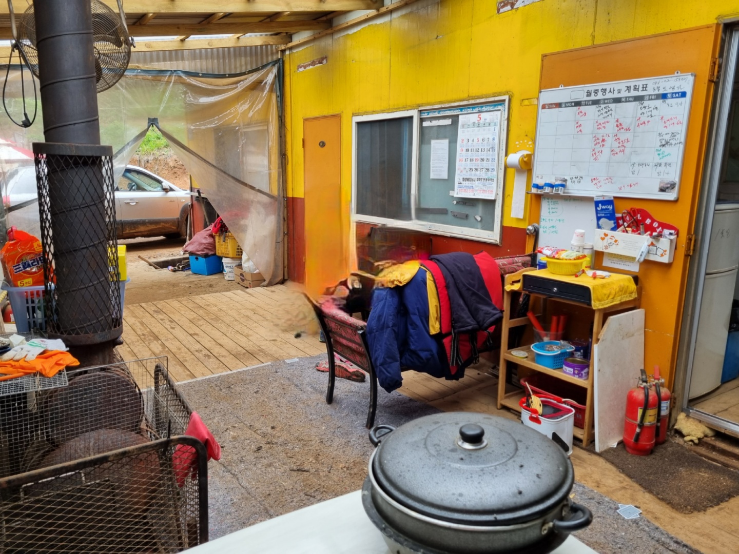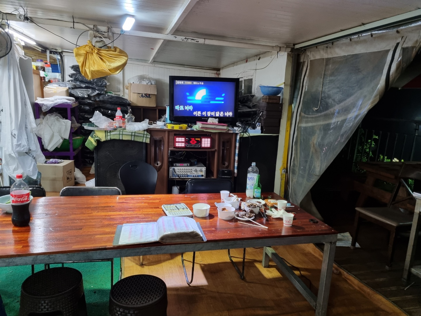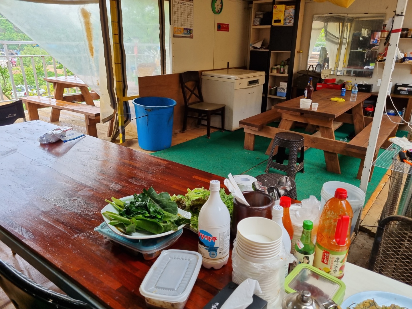 저녁엔 숯을 피워서 삼겹살을 먹으려고 하는데 주인아주머니가 말린 광어 4마리와 말린 가자미 한 마리를 주셨어요. "같이 궈 먹어~" 그리곤 쿨하게 퇴장하셨죠^^