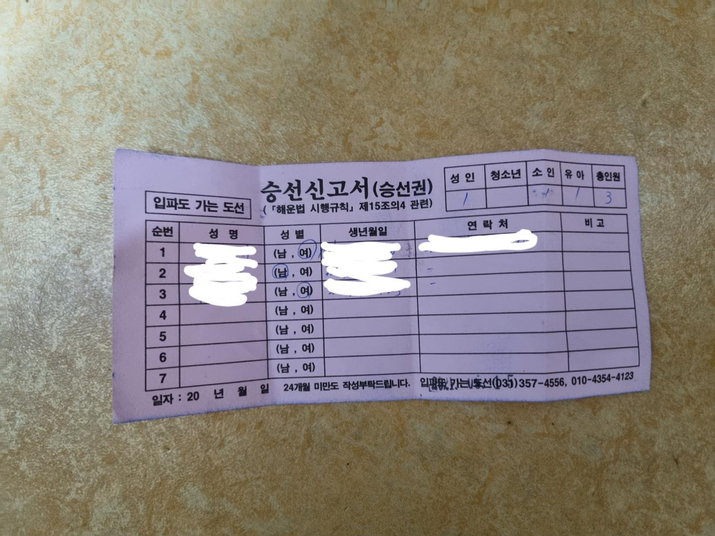 일단, 매표소에서 표를 사려면 승선신고서를 작성해야 하고 신분증도 있어야 해요. 신분증이 없는 아동은 등본을 준비해야 해요. 승선신고서와 신분증을 확인하고 결제를 하면 왕복 승선권 2장을 줘요. 갈땐 파란색 승선권 제출. 올 땐 빨간색 승선권 제출. 24개월 미만 유아는 무료지만 승선신고서에 이름은 써야 해요. 소인은 성인 요금의 50%에요.