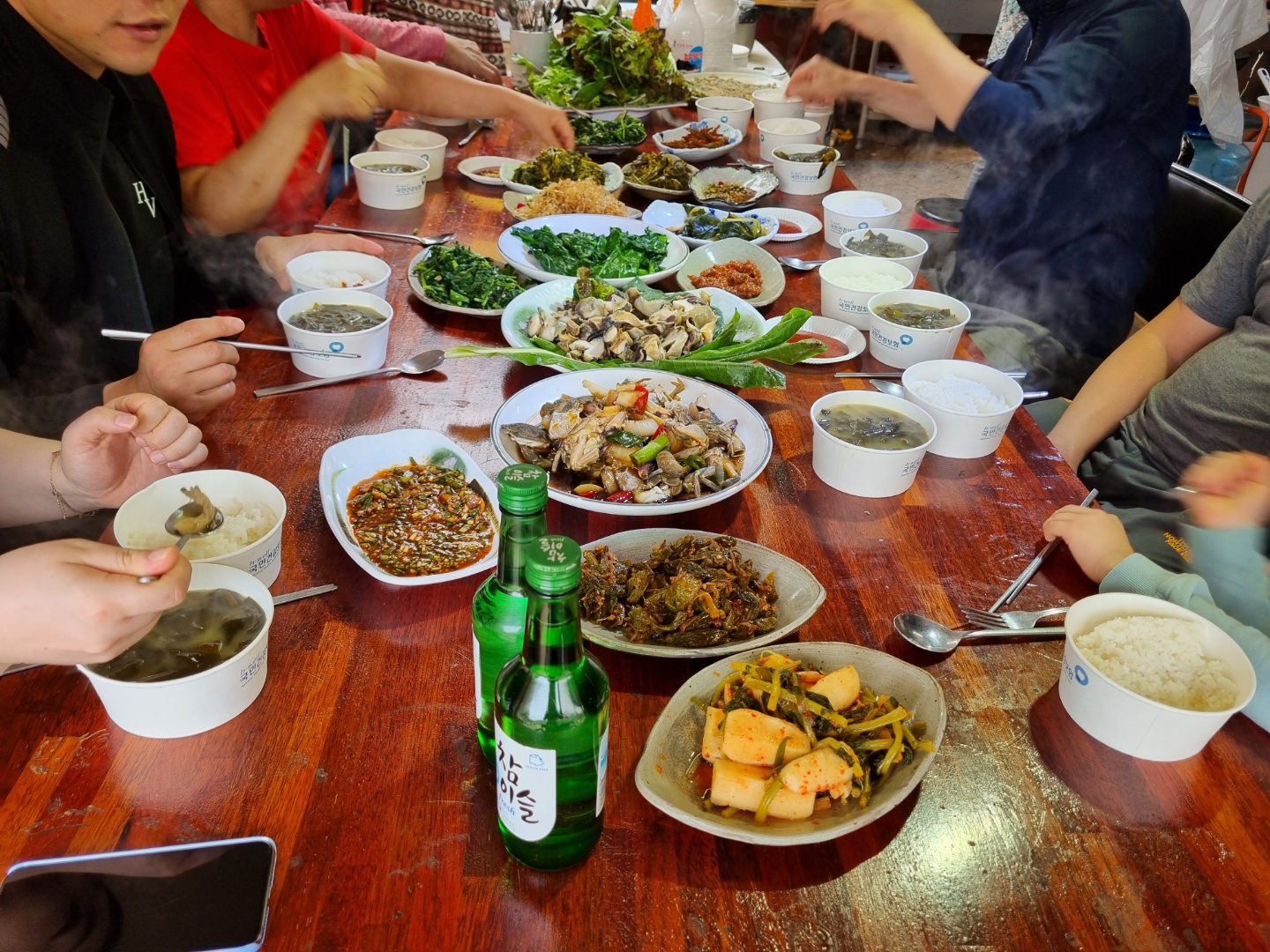 점심을 거하게 한상 차려주셨어요. 간장게장, 소라찜, 밥, 국. 반찬도 넉넉히 많이 주시고 맛있어요. 원래 전도 주셨는데 사진은 없어요. 영우네 민박을 처음 알게 된 계기는 요트 타고 밥을 먹으러 왔다가 알게 됐어요. 그리고 밥도 너무 맛있고 풍경도 정겨워서 다시 놀러 왔죠. 점심에도 또또 술을 마셔요. 소라찜이 있는데 소주가 빠질 수 없죠.
