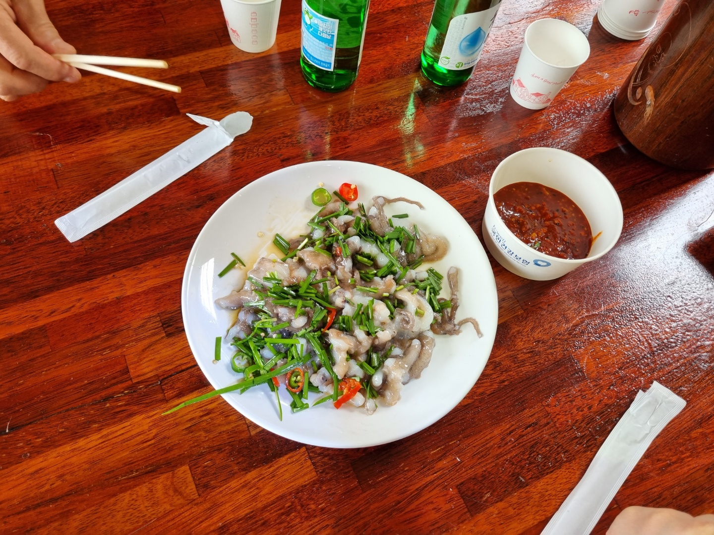 웰컴 드링크 아니고 웰컴 푸드로 낙지 탕탕이를 주셨어요. 인심이 넉넉하세요. 이런 건 메뉴에 있는 것도 아니고 원래 주는 것도 아니고 지난밤 낙지가 잡혔으면 낙지 탕탕이 주고 소라가 있으면 소라를 주시고 없으면 안 주고 그러는 것 같아요. 아침부터 낙지 탕탕이에 소주를 2병이나 먹었어요.