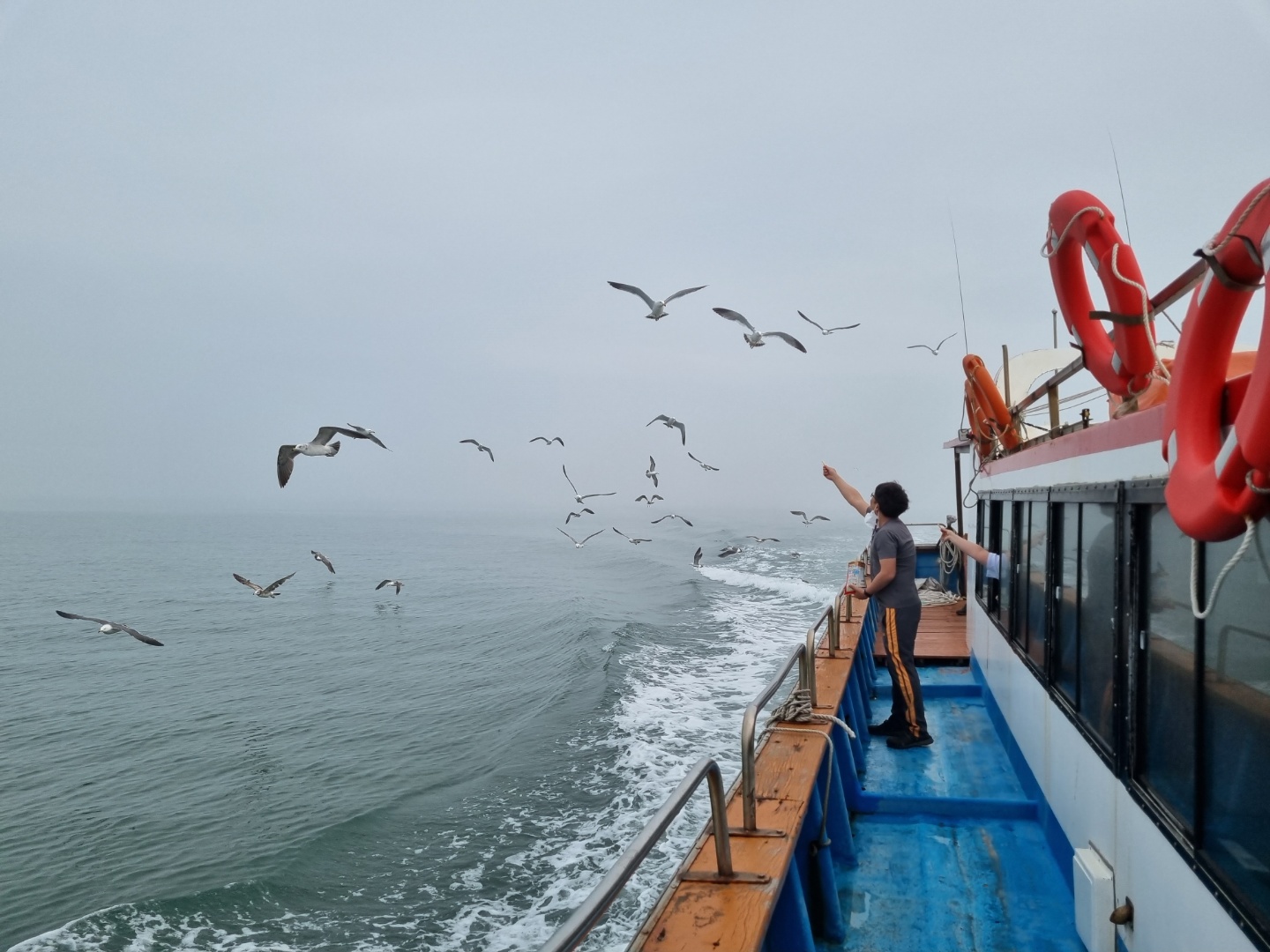 배 밖에서는 갈매기에게 새우깡을 줘요. 아이들도 신나고 어른도 신나요.