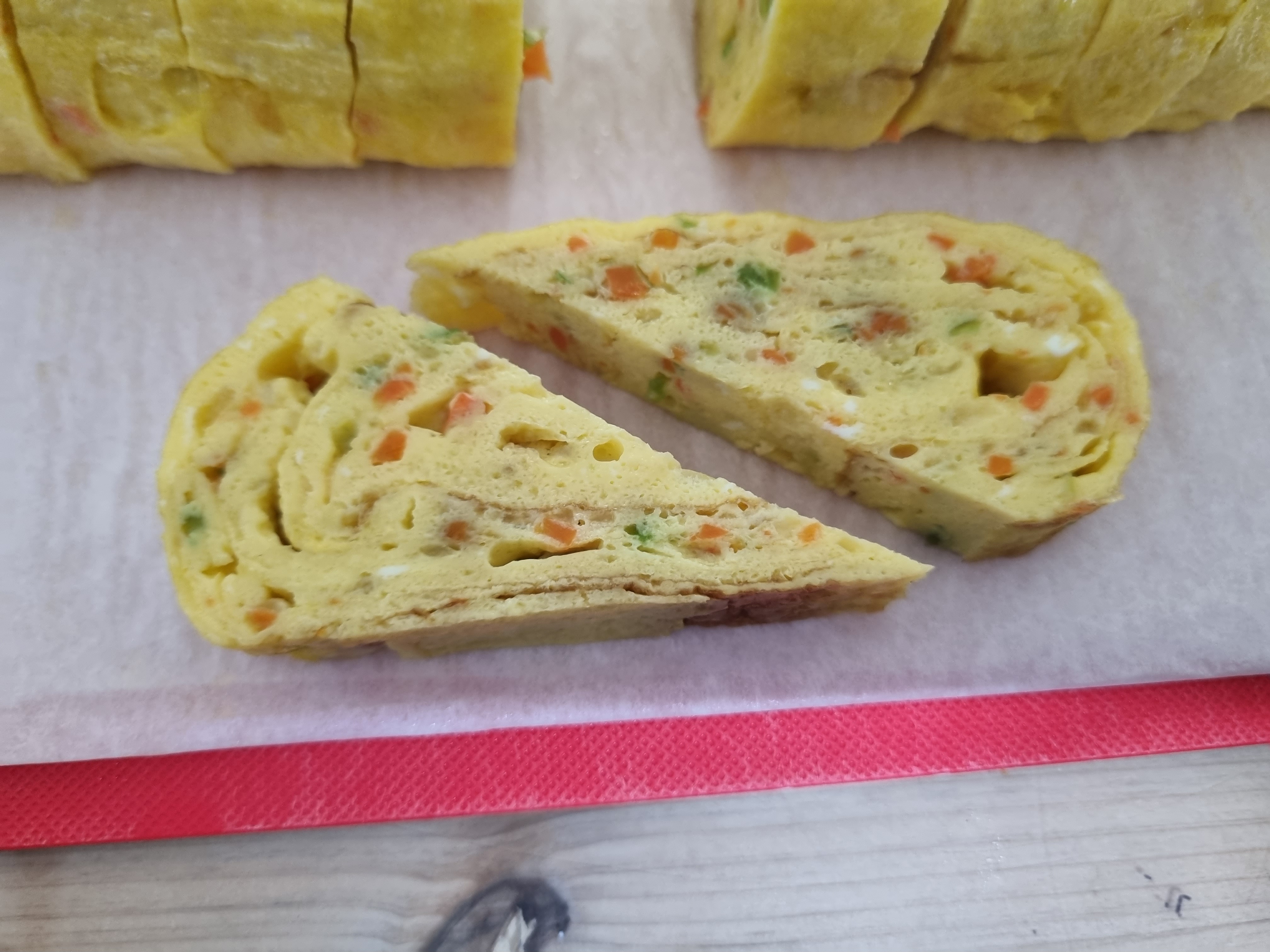 칼로 잘랐더니 너무 예쁜 계란말이가 완성됐어요. 하지만 더 예쁜 하트 계란말이를 만들어야 해요.
