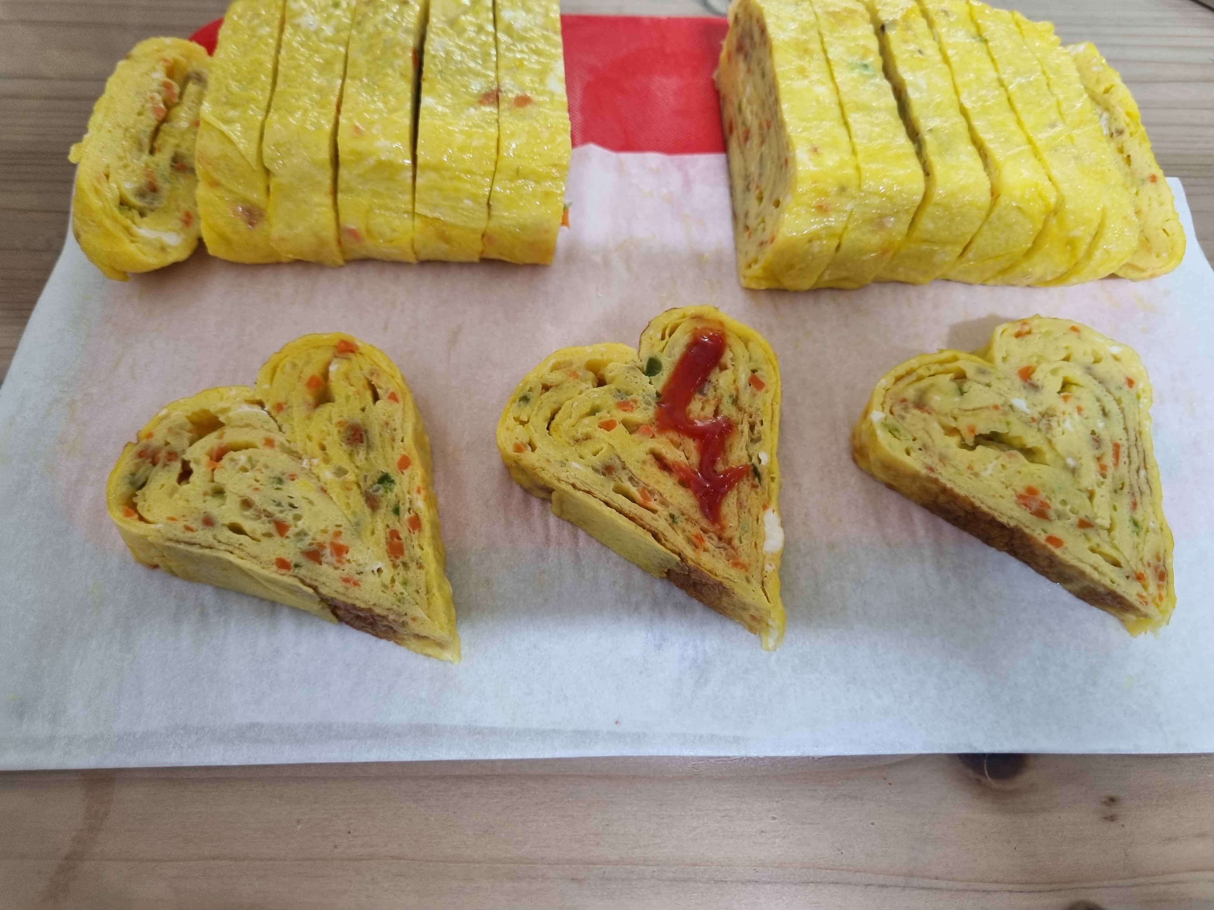 누구나 좋아하는 계란말이를 만들었어요. 그냥 계란말이도 예쁘고 맛있지만 더욱 예쁘게 하트 계란말이를 만들고 사랑 고백도 했어요. 오랜만에 사랑 고백하고 심쿵했어요.