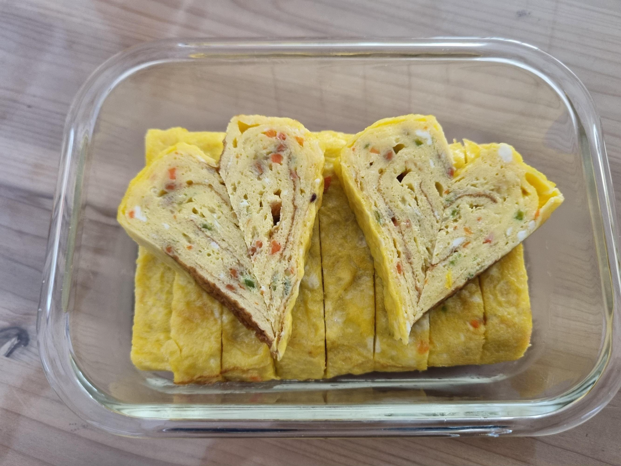담은 계란말이는 통에 담아 냉장고에 보관해요.