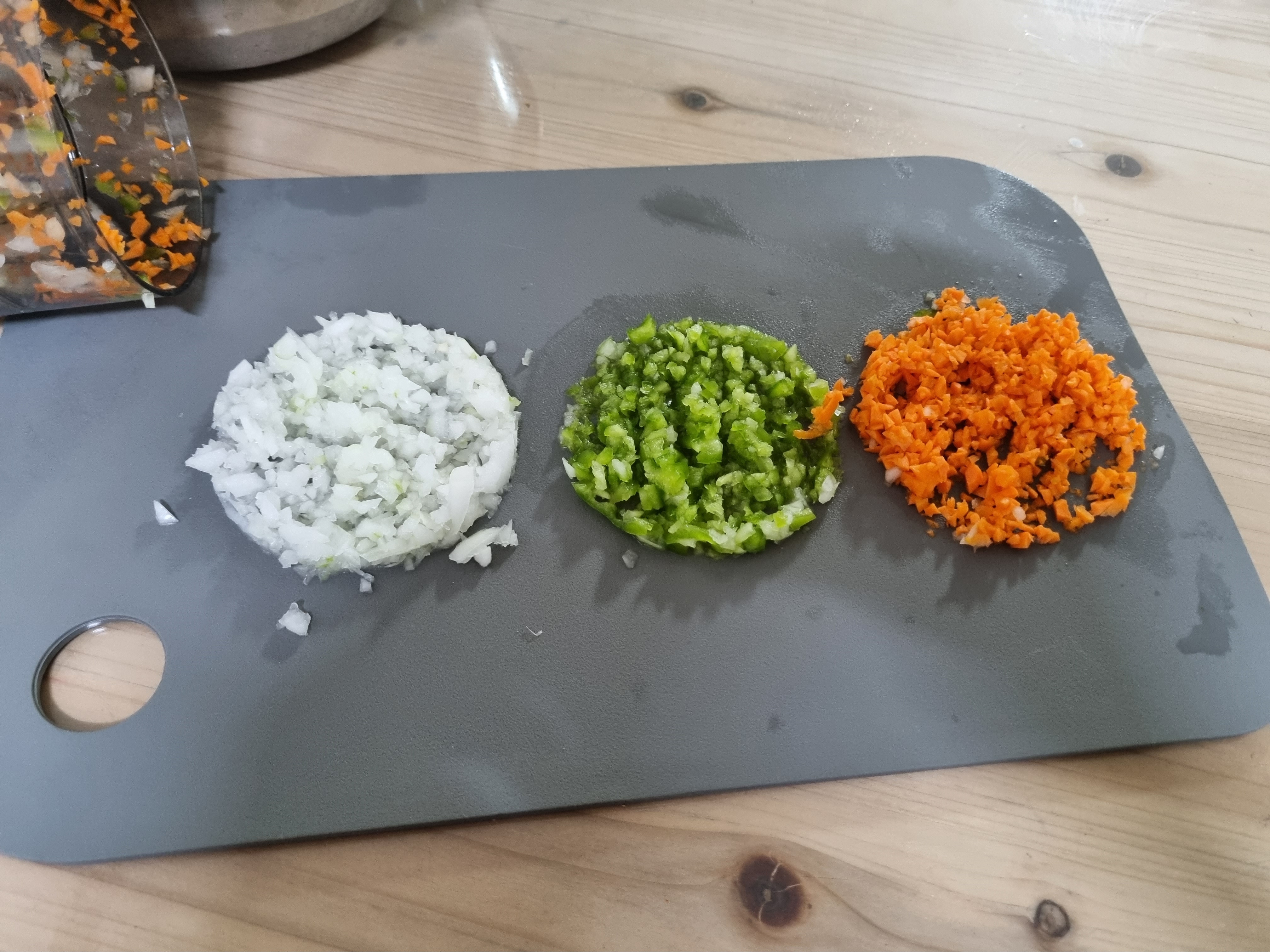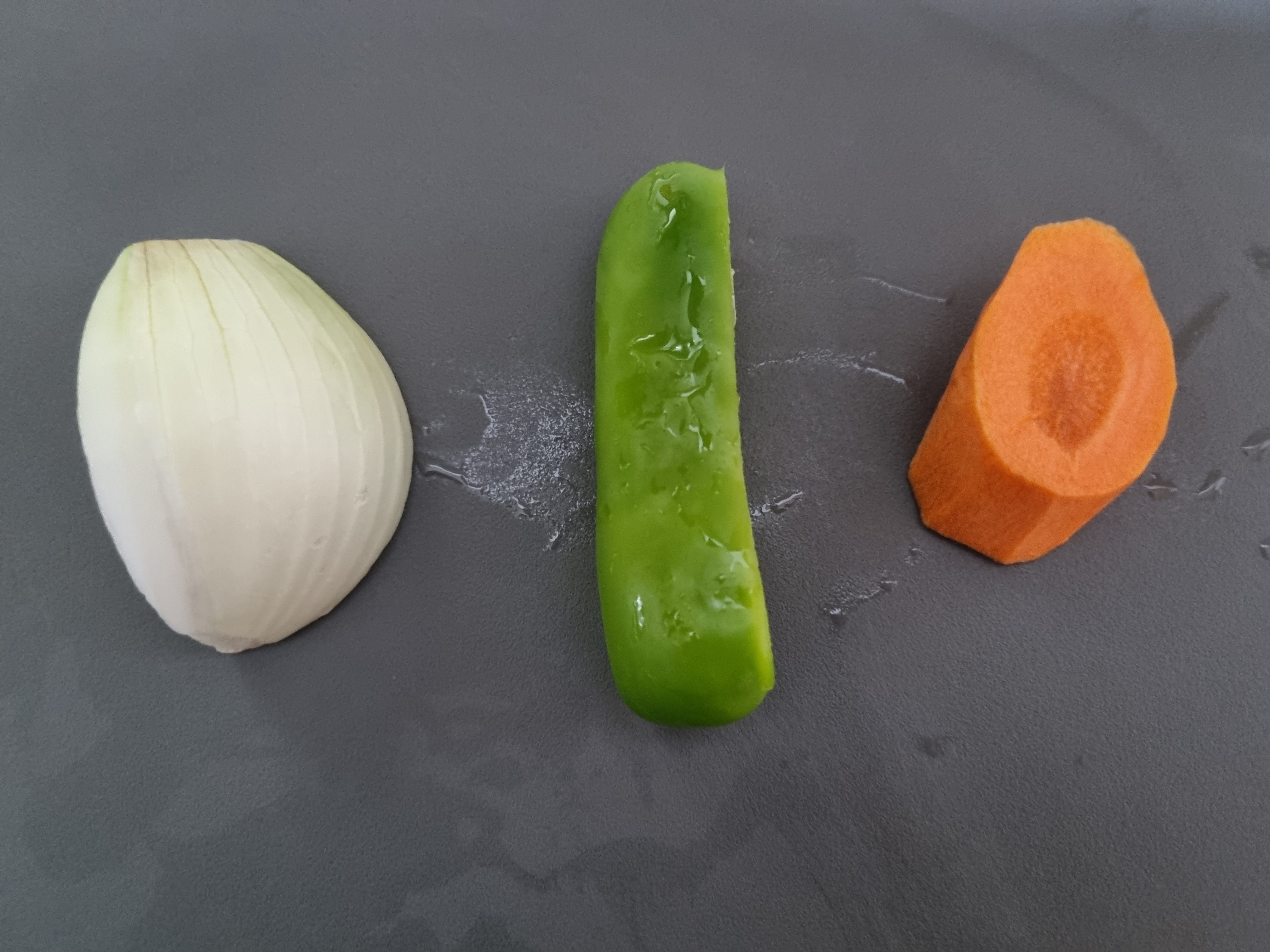 양파, 파프리카, 당근도 준비해요. 계란 10개에 비해 터무니없이 적은 양이예요. 하지만 야채를 많이 넣으면 못 먹을 수도 있으니 최대한 적게 넣어요.