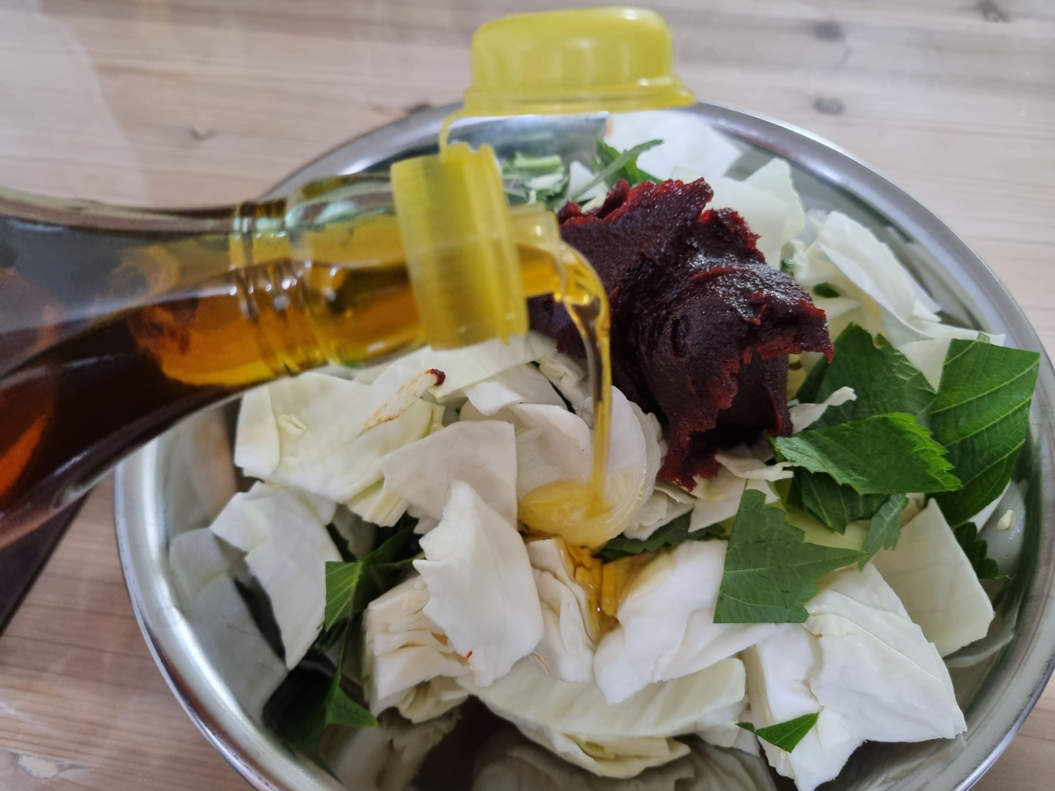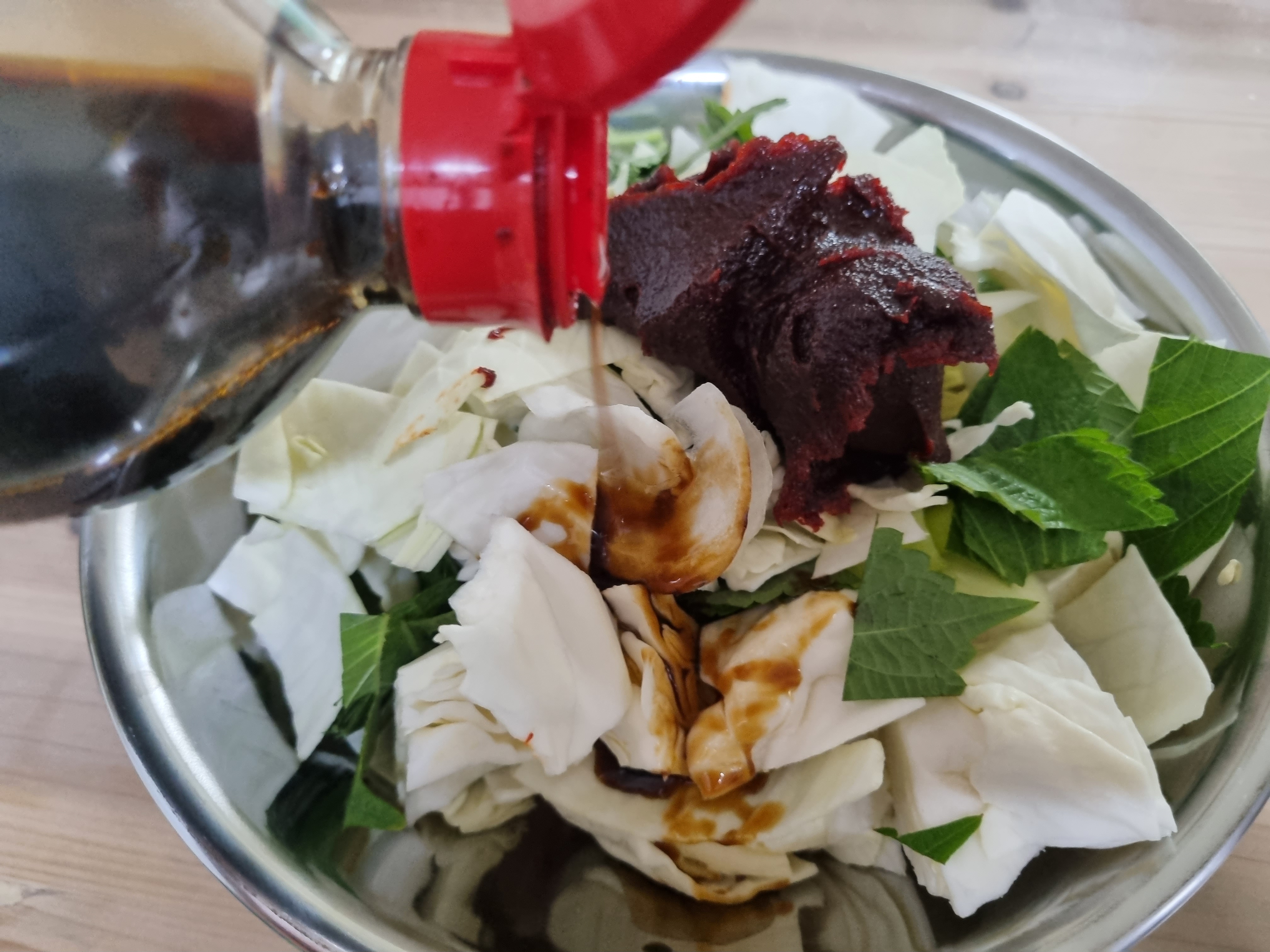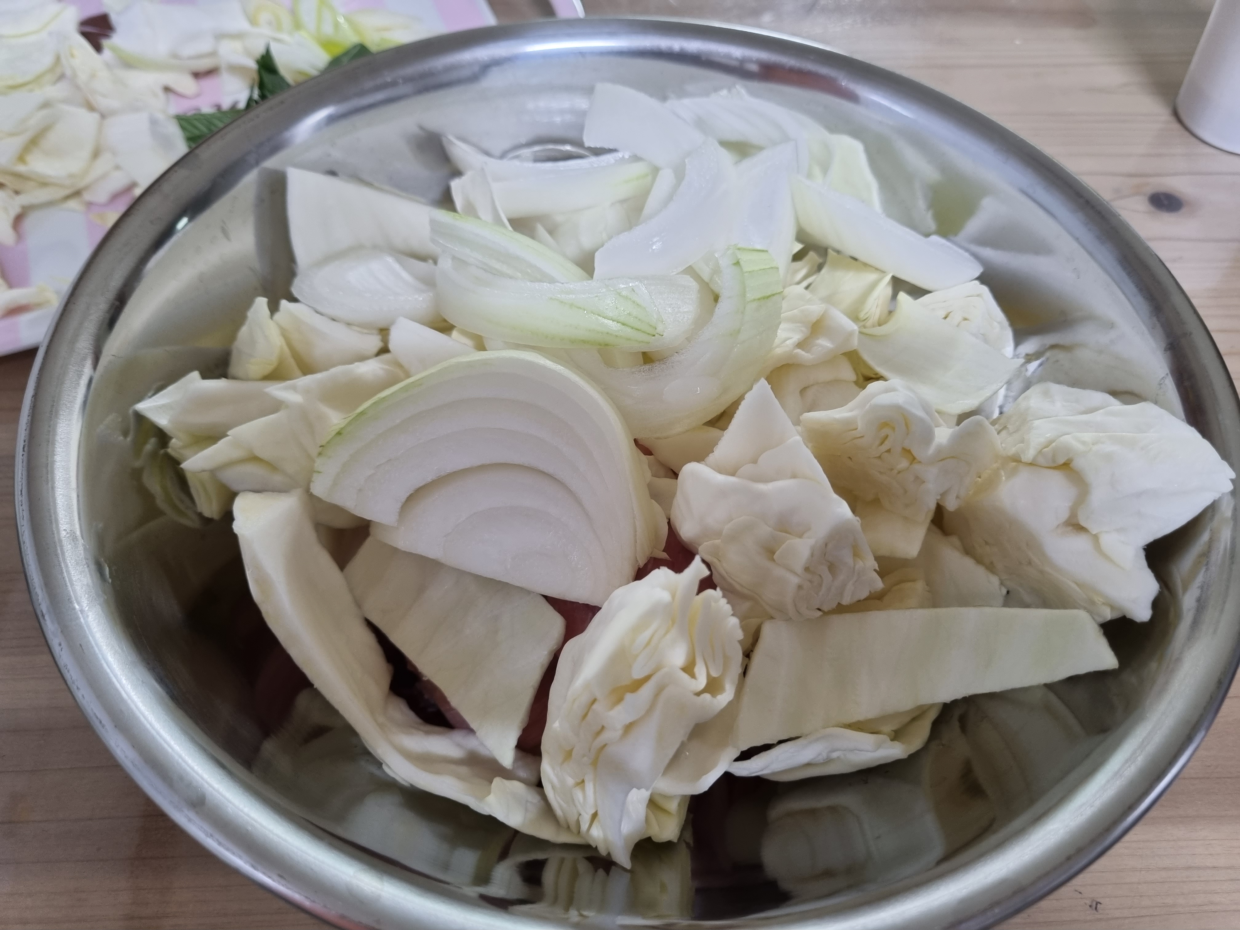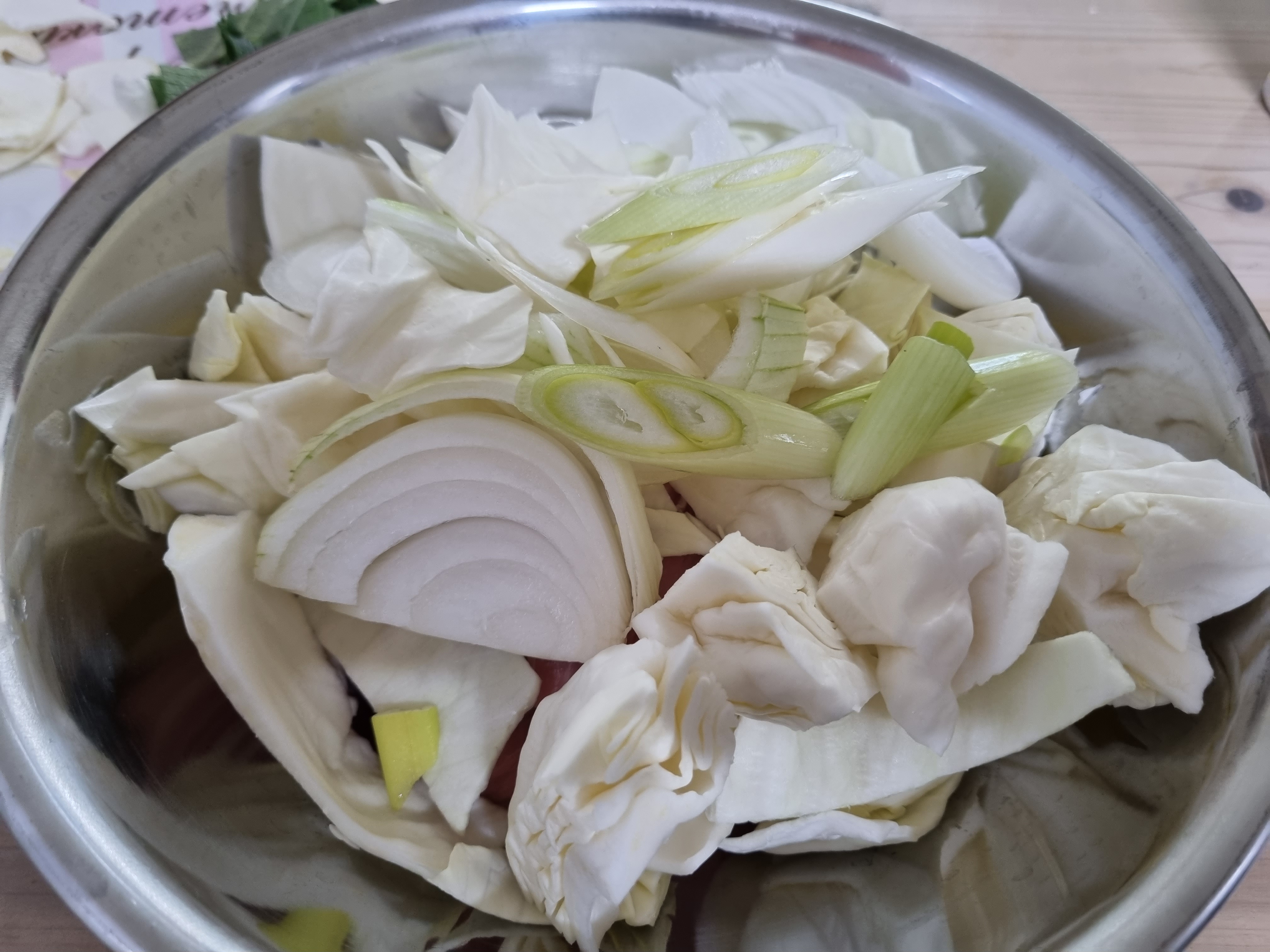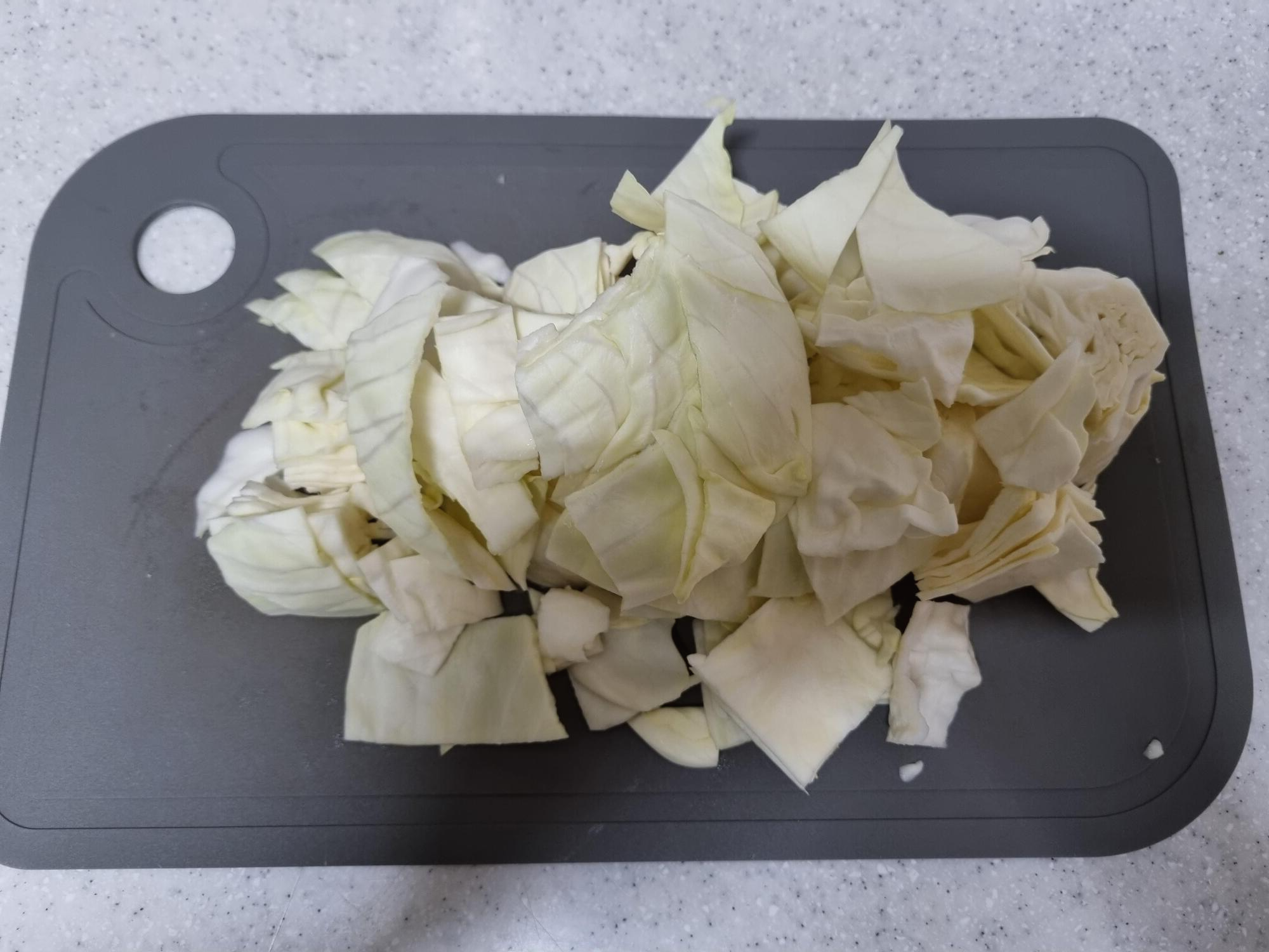 양배추를 잘라요. 1/4통이나 잘랐어요. 이제 어른이 되어서 그런지 양배추가 너무 좋아요.