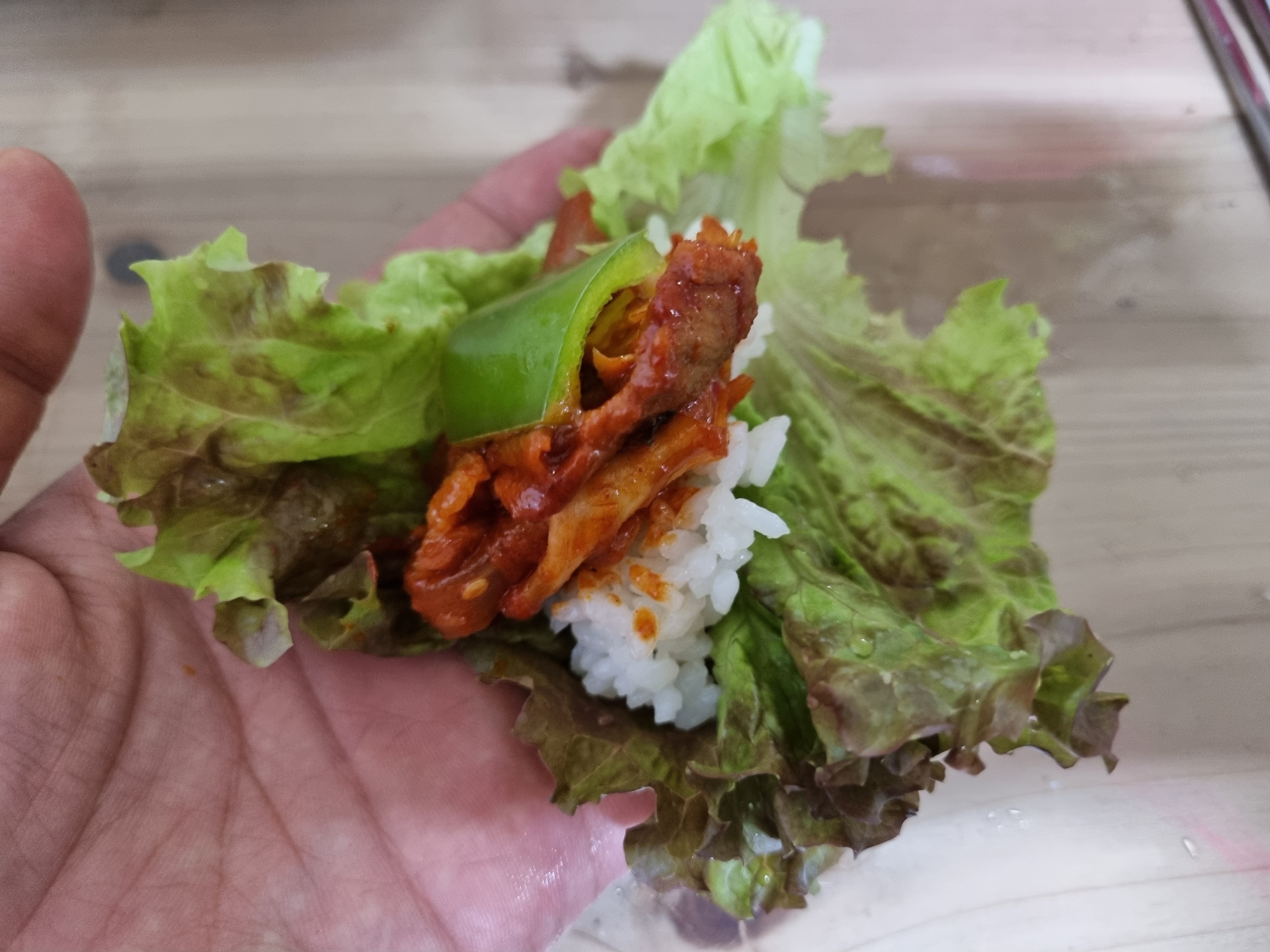역시 고기는 쌈을 싸야 맛있어요^^ 집에서도 화유를 이용해 충분히 불맛나는 제육볶음을 만들을 수 있어요. 하지만 캠핑 가서 숯불을 이용하는 것만큼 맛있진 않지만 그래도 만족해요.