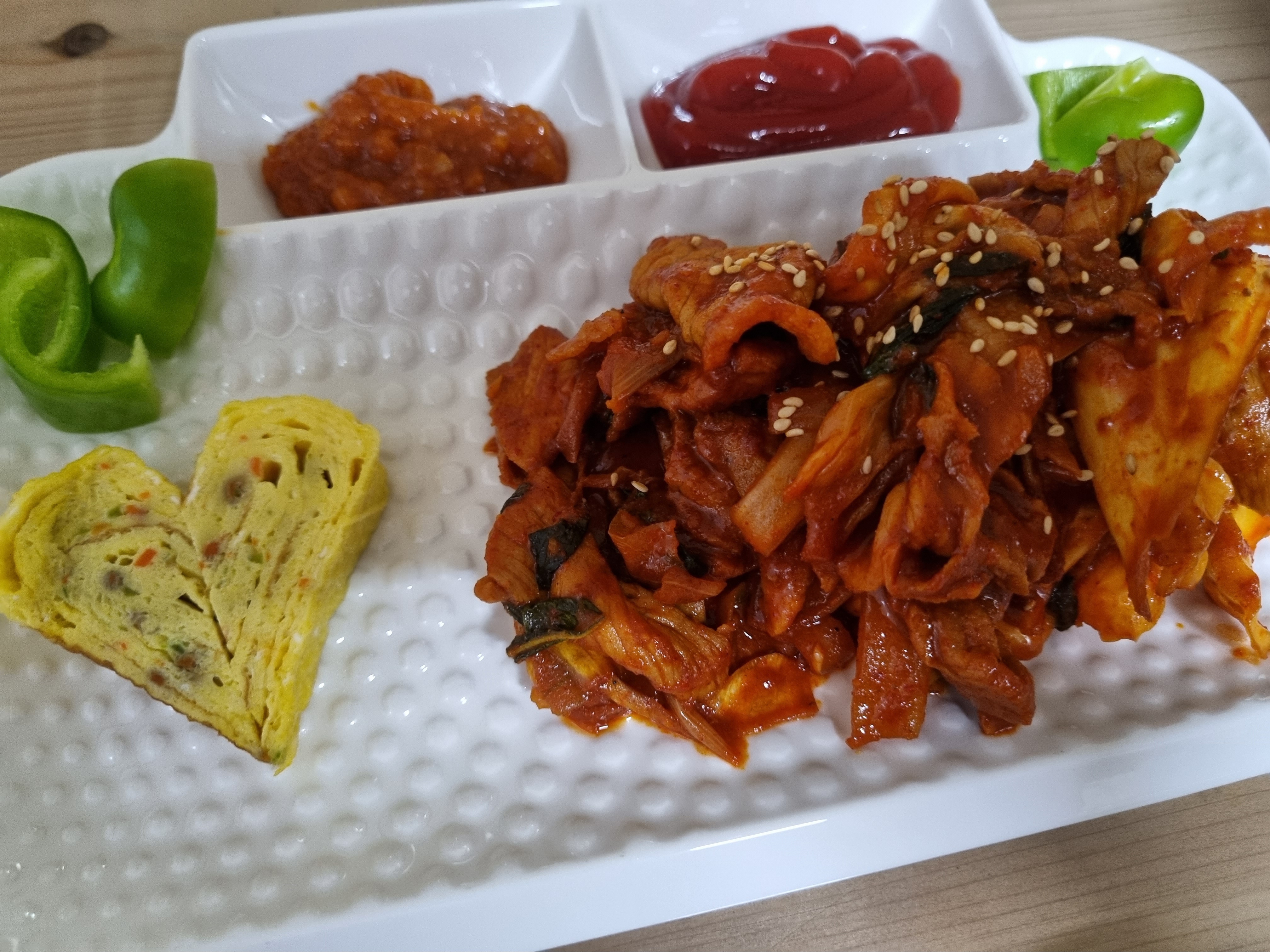 불맛나는 제육볶음 완성. 접시에 예쁘게 담았어요. 하트 계란말이는 아이들. 매콤하고 불맛나는 제육볶음은 어른. 사이좋게 먹었어요. 하트 계란말이를 서로 먹겠다고 절대 싸우지 않았어요.