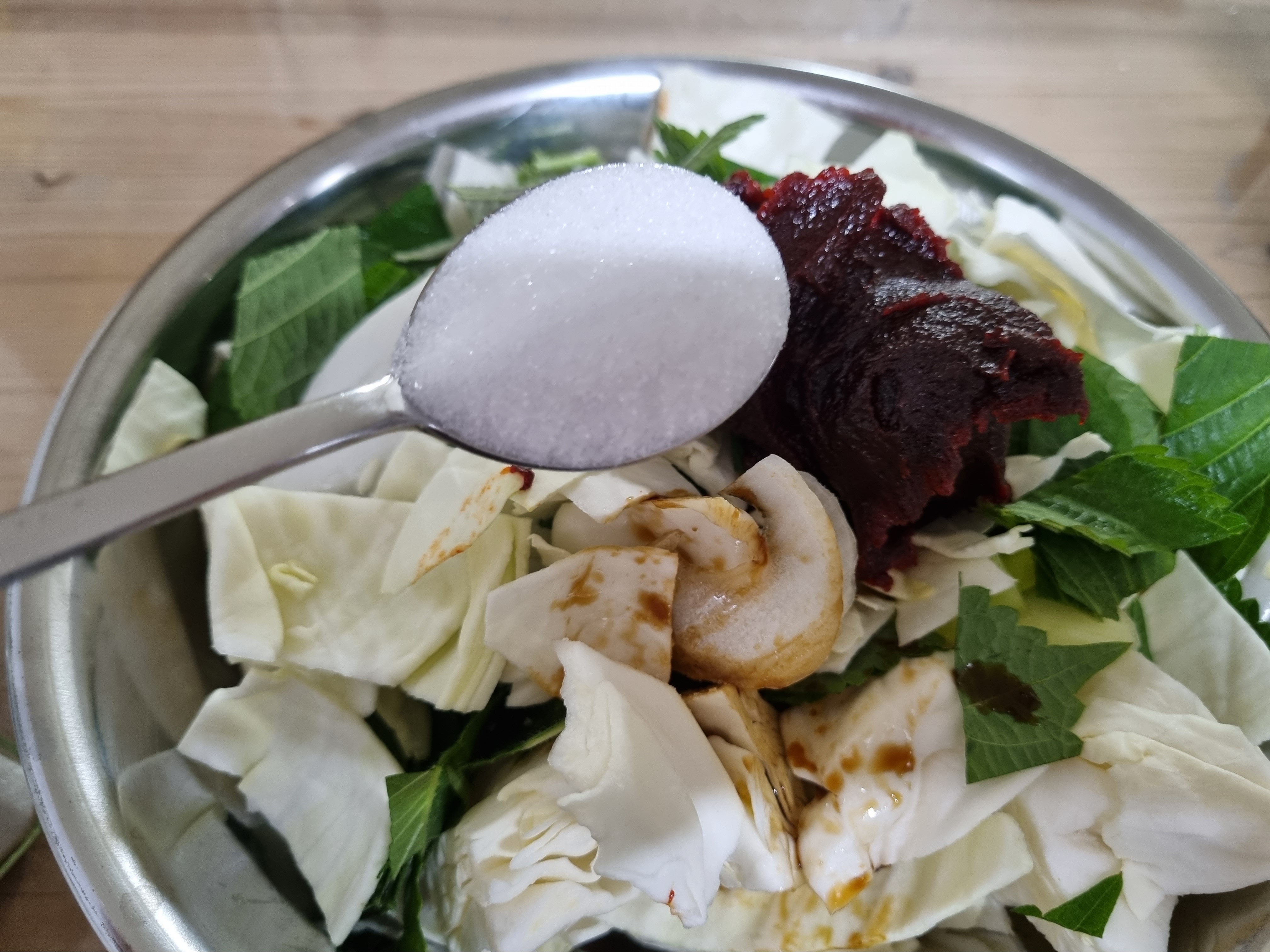 들기름도 넣어요. 두 숟가락 정도. 돼지 냄새를 잡아주거든요.