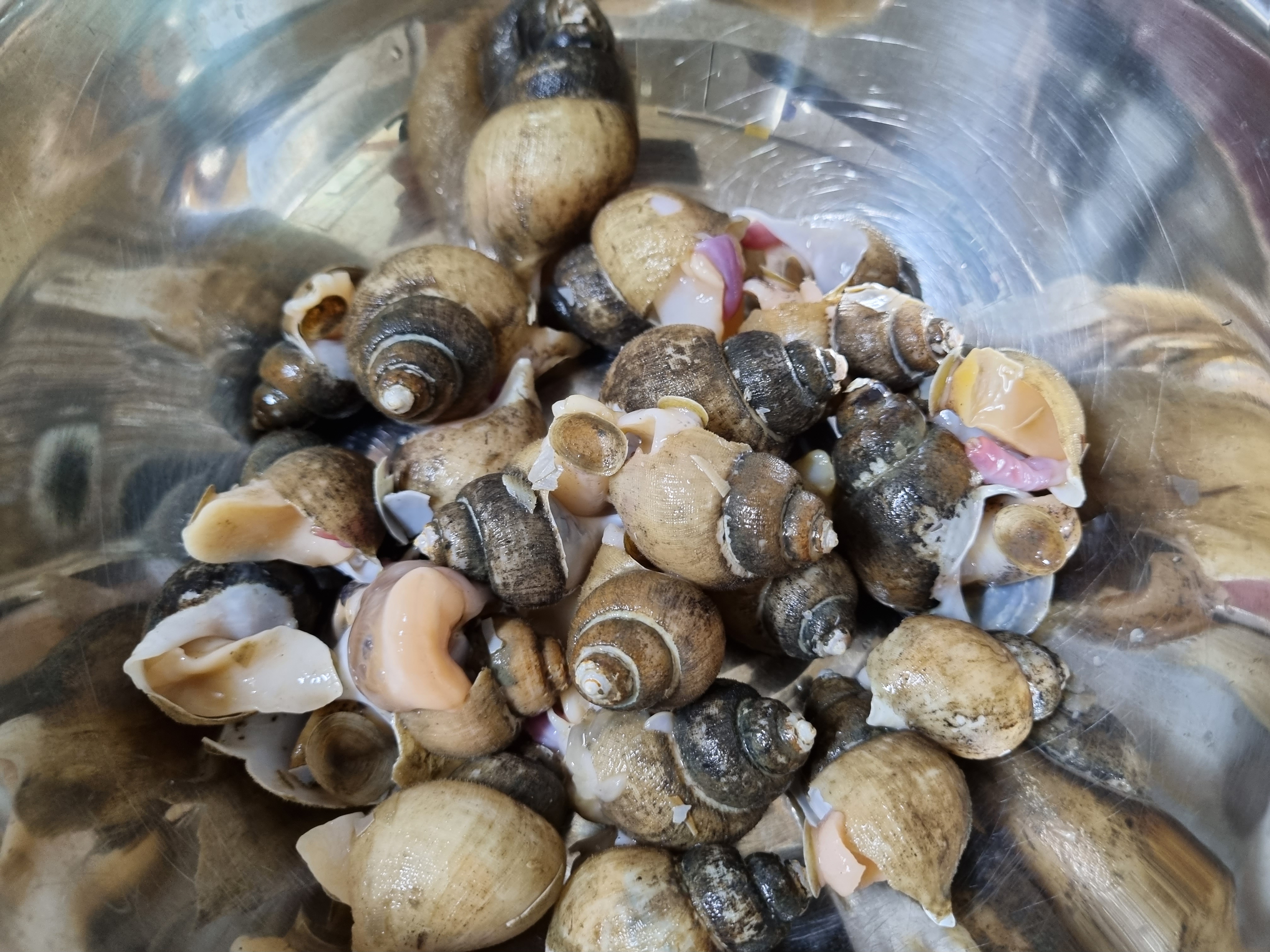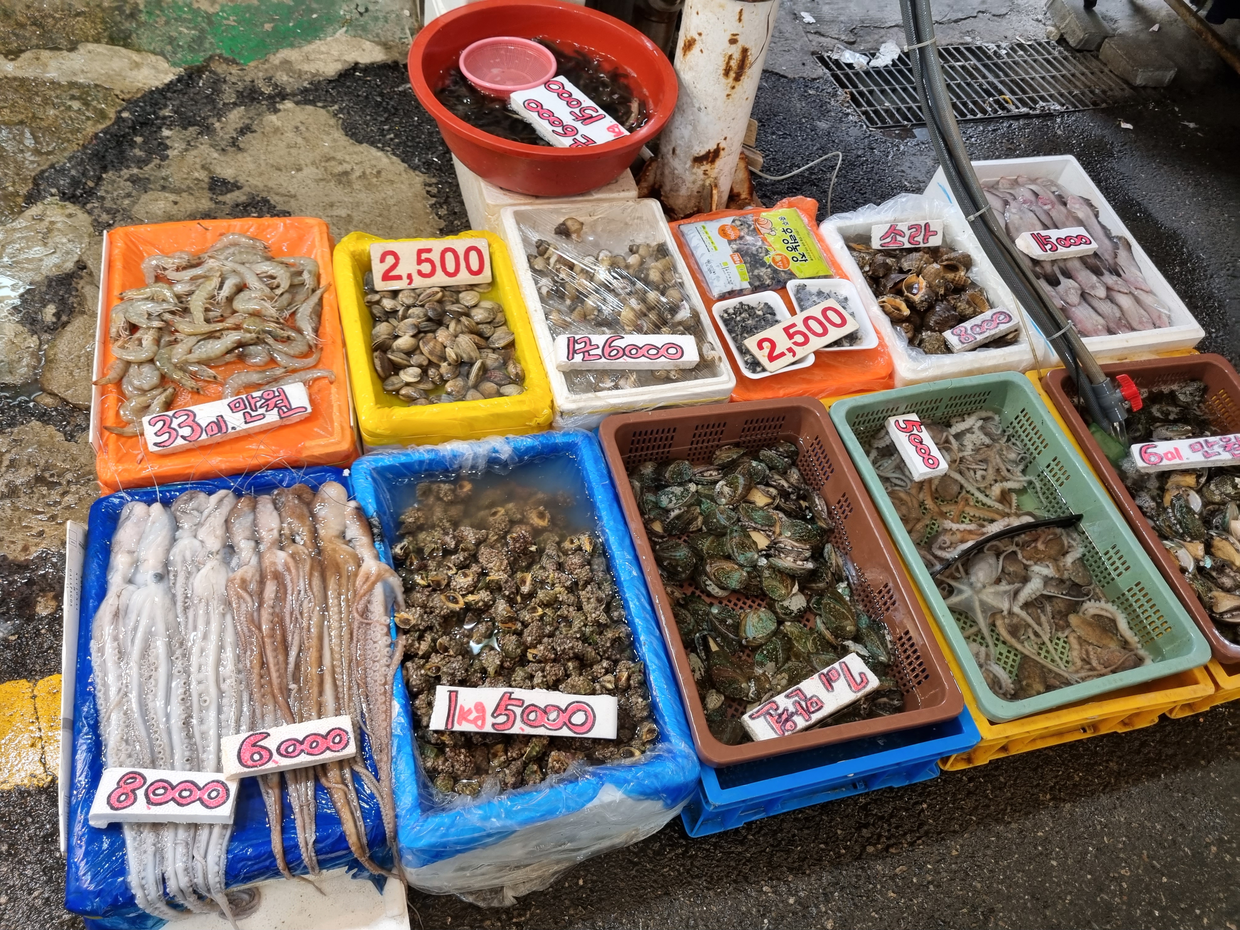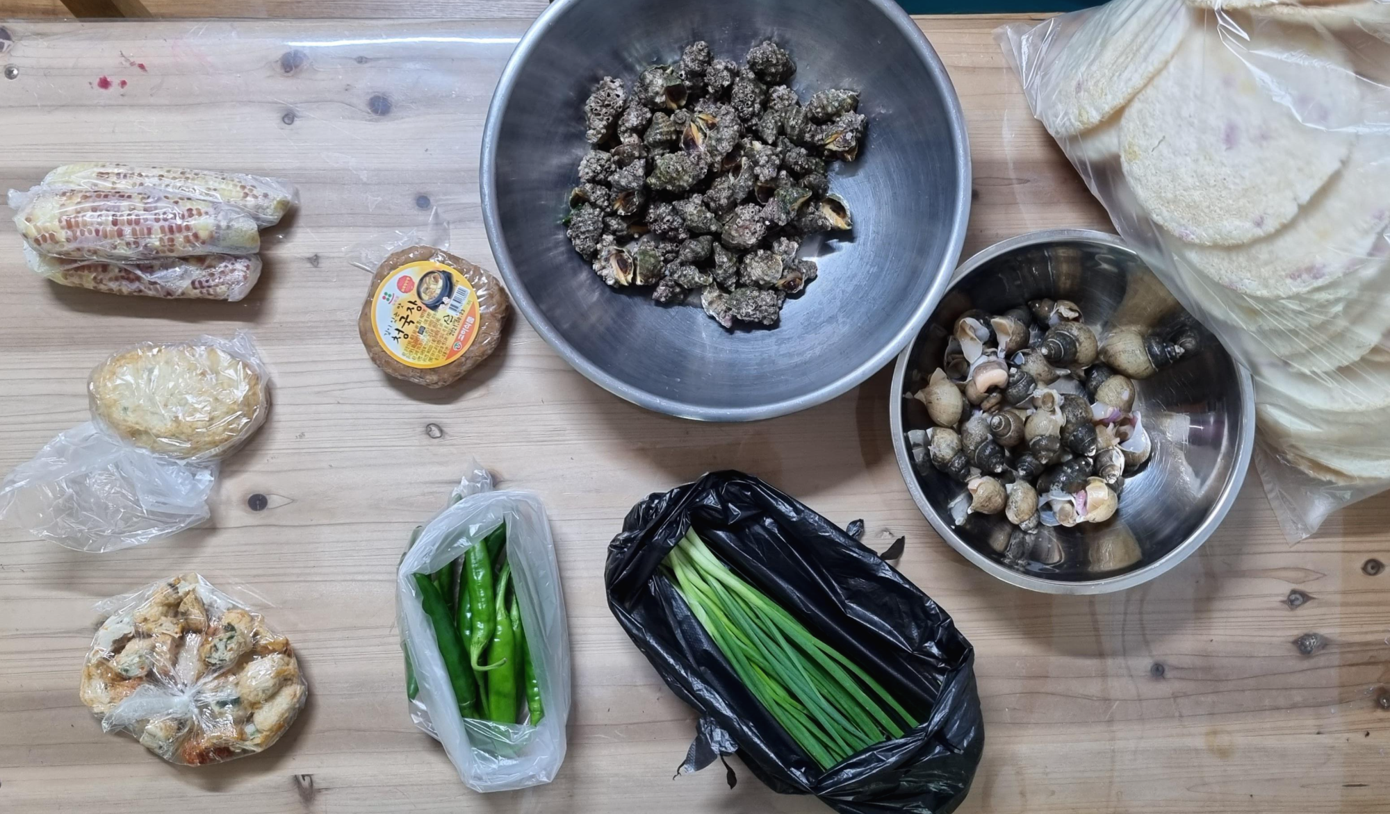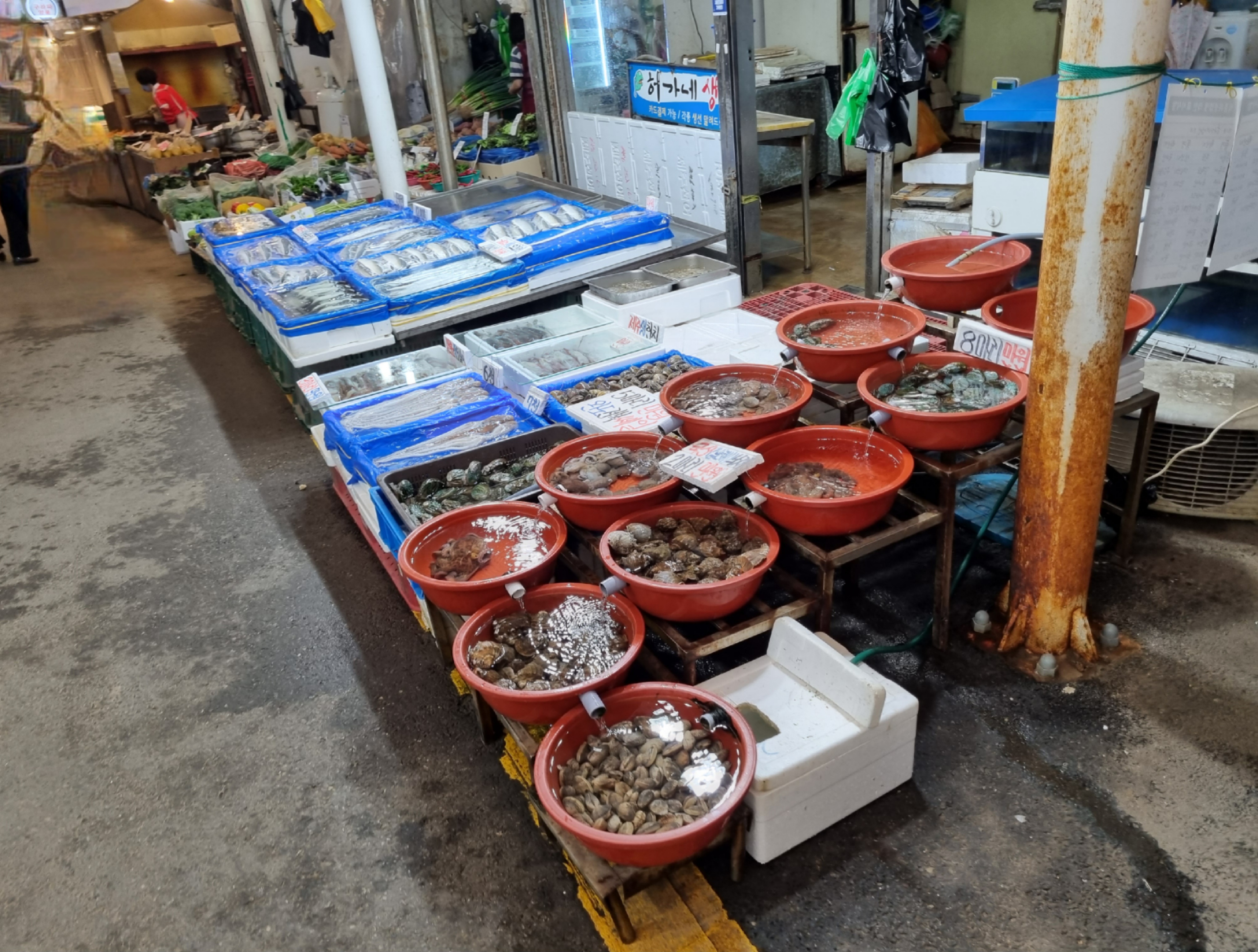 바닷 고동과 골뱅이가 있어요. 샀어요. 가격도 저렴해요. 바지락은 수산시장보다 1천 원 더 저렴했어요.
