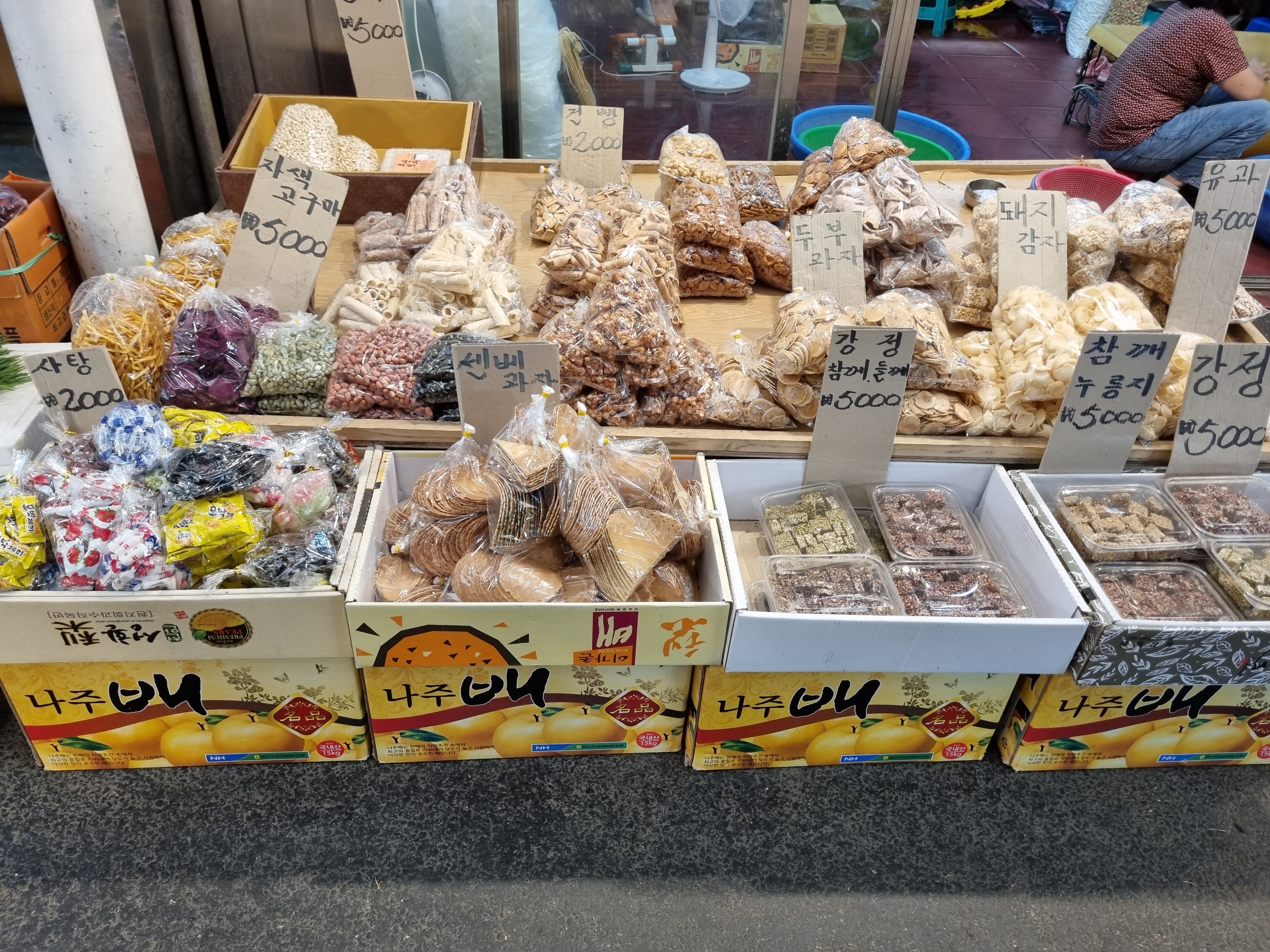 삼베 과자 파는 곳도 있어요. 뻥튀기도 팔아요.