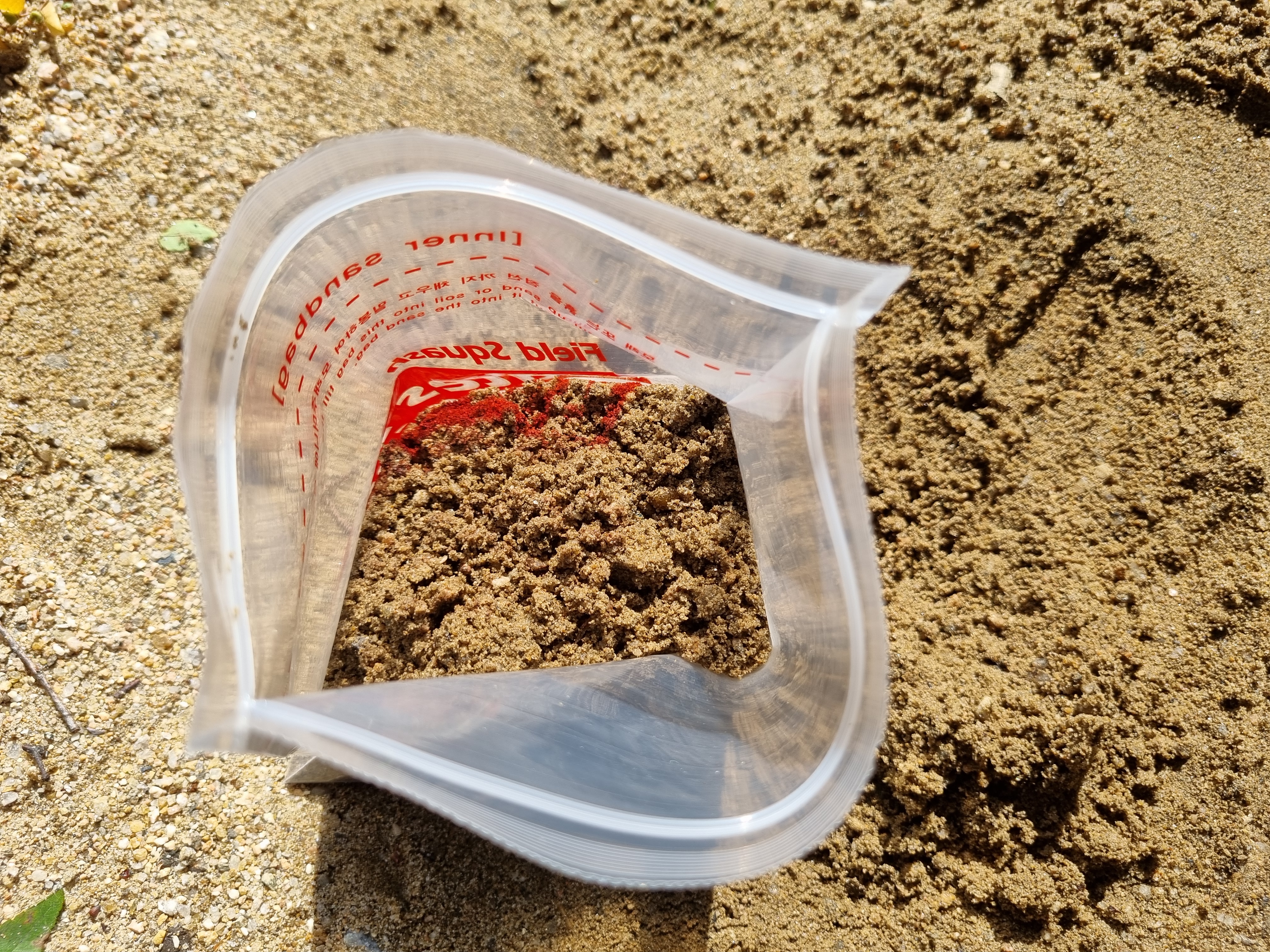 모래가 채워진 지퍼백을 빨간 모래주머니에 넣으면 세팅 완료!