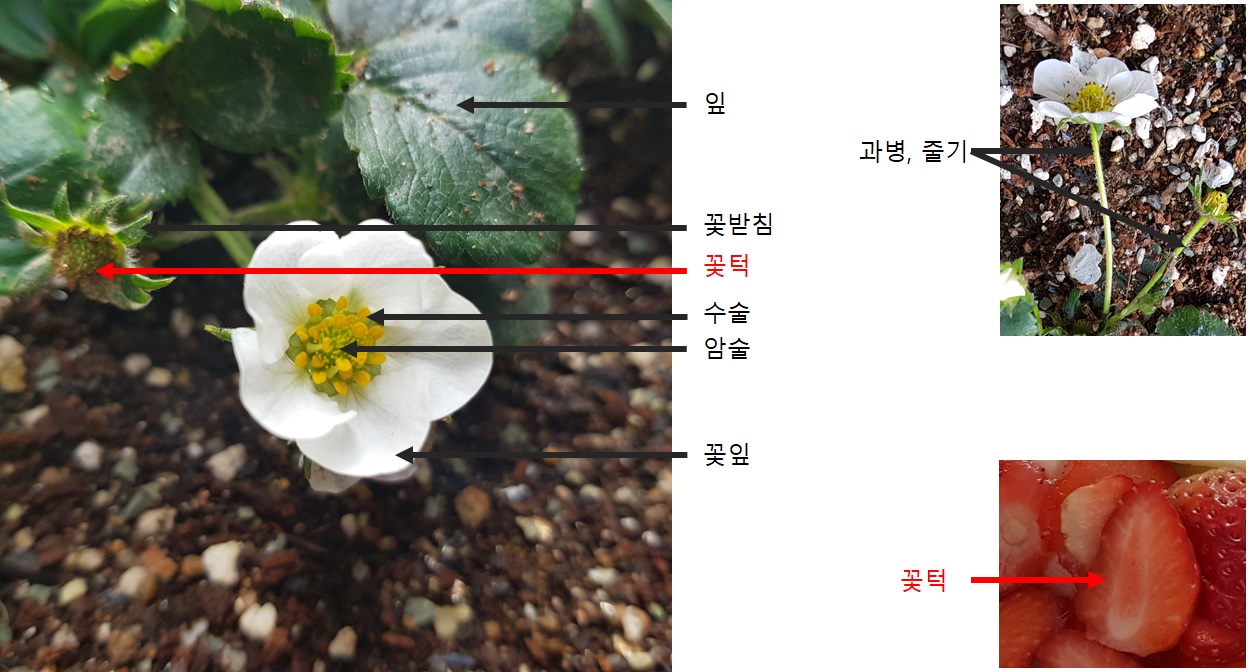 딸기는 꽃턱이 비대하게 자라서 과육이 되는데 이것이 우리가 먹는 부드러운 딸기라고 한다.