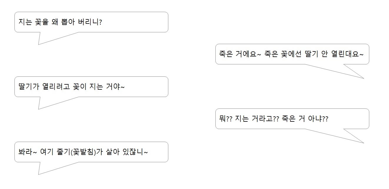 지난 포스팅 자료에 보면 시든 꽃(까맣게 변한 꽃)은 과육을 맺을 수 없다는 정보를 입수하여 꽃잎에 까맣게 변한 꽃을 뽑아 버렸다. 부모님이 사진을 보시곤 나에게 물으신다.