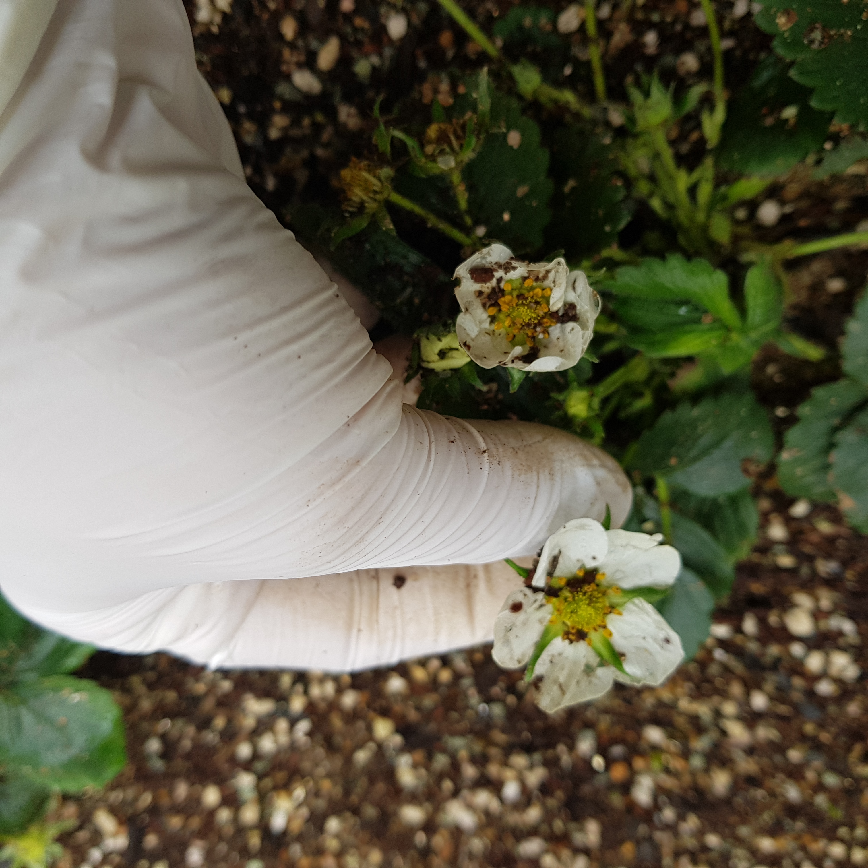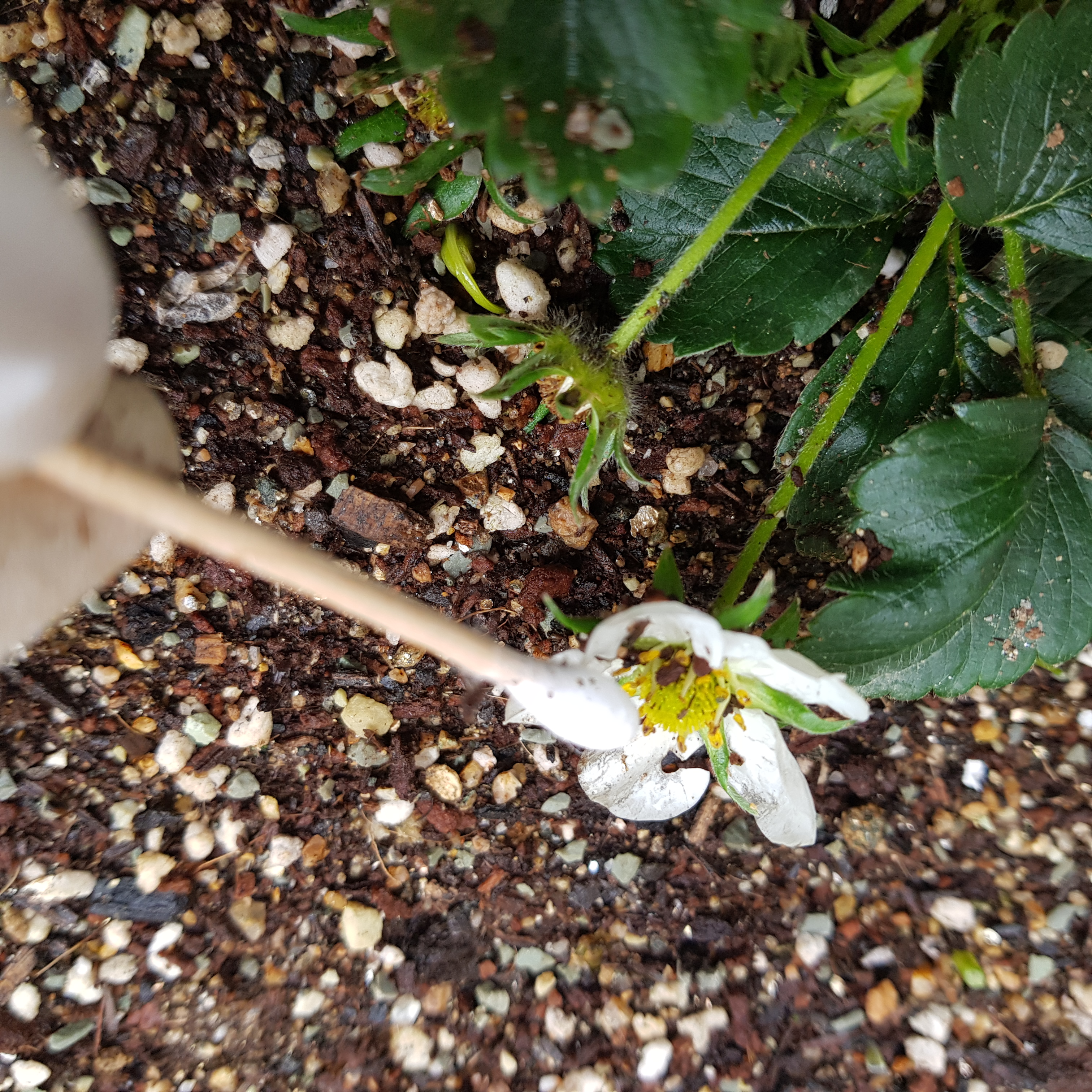 거의 모든 꽃에서 꽃잎이 떨어지고 있었다. 딸기는 한 꽃에 암술과 수술이 같이 있기 때문에 바람만 불면 수정이 잘 된다고 한다. 그러나 추운 날씨 탓에 비닐로 꽁꽁 덮어뒀으니 수정이 됐을 리가 만무하다. 남은 꽃이라도 인공 수정시켰다. 인공 수정 방법은 의외로 간단하다. 꽃대를 흔들거나 면봉으로 수술을 쓰다듬고 암술을 쓰다듬으면 된다. 면봉이 아니더라도 미술용 붓을 이용해도 된다고 한다. 아래 딸기 인공 수정하는 사진을 첨부하였다.