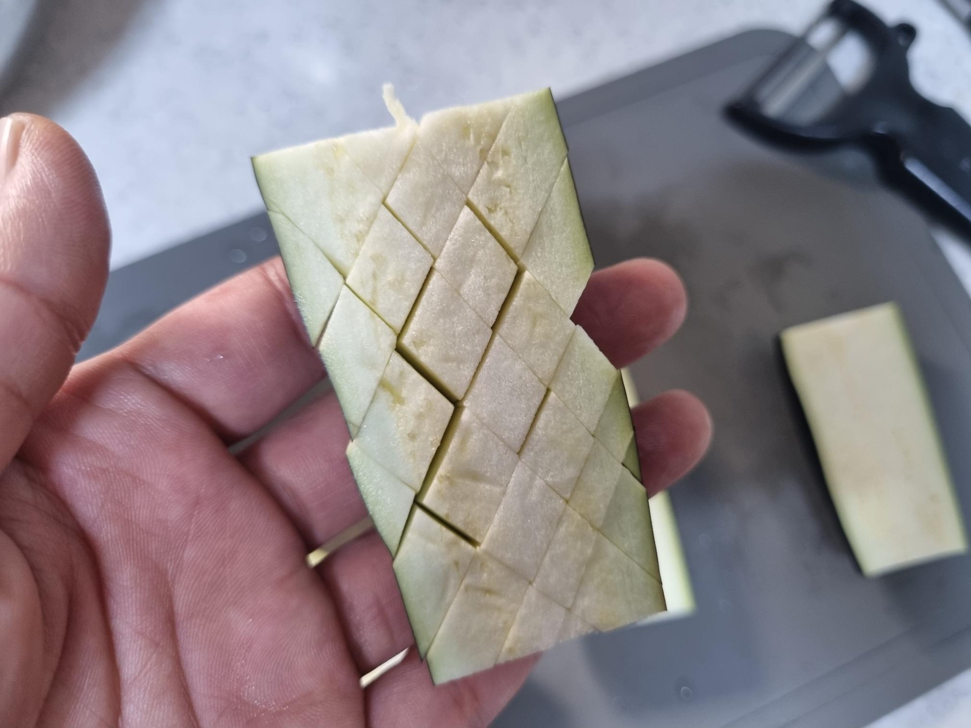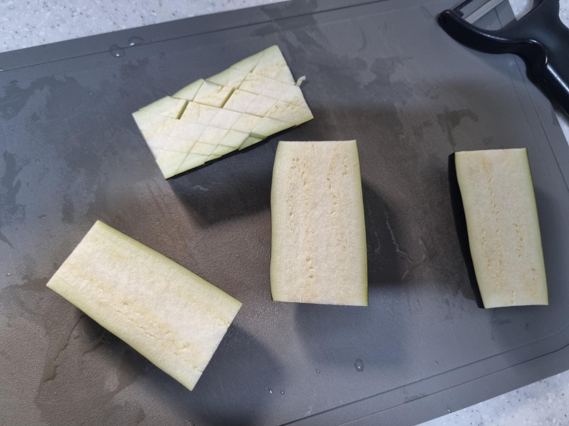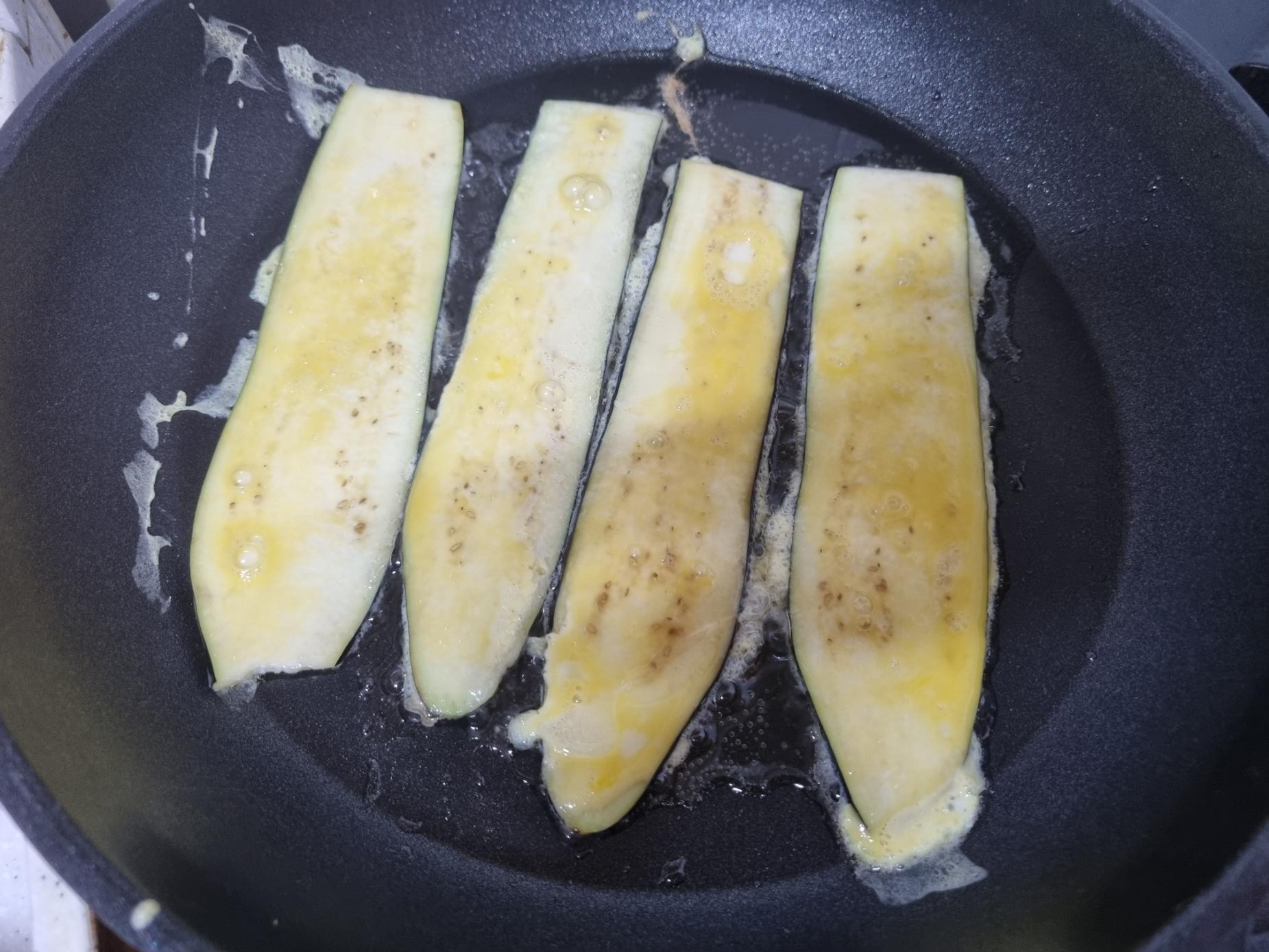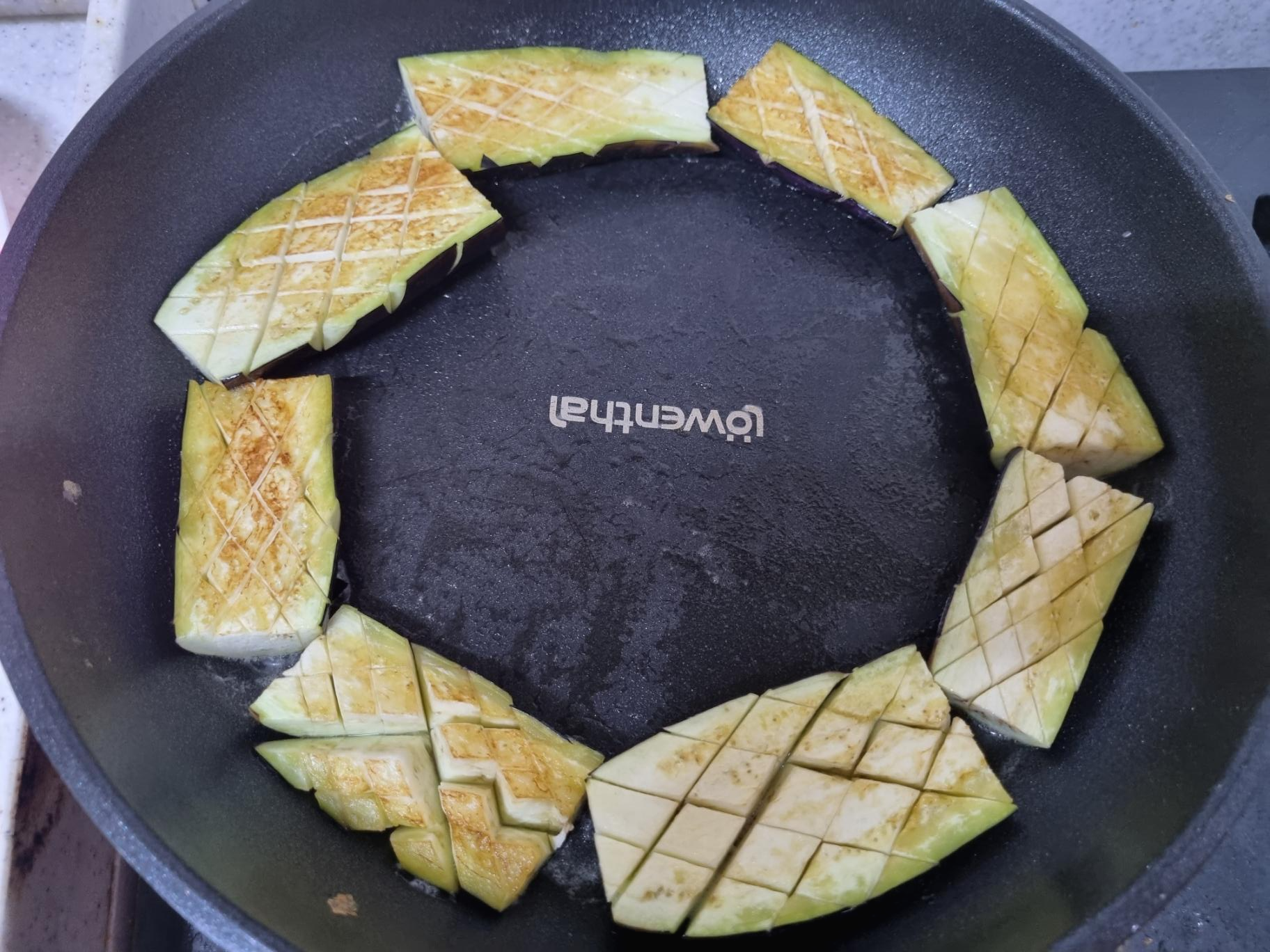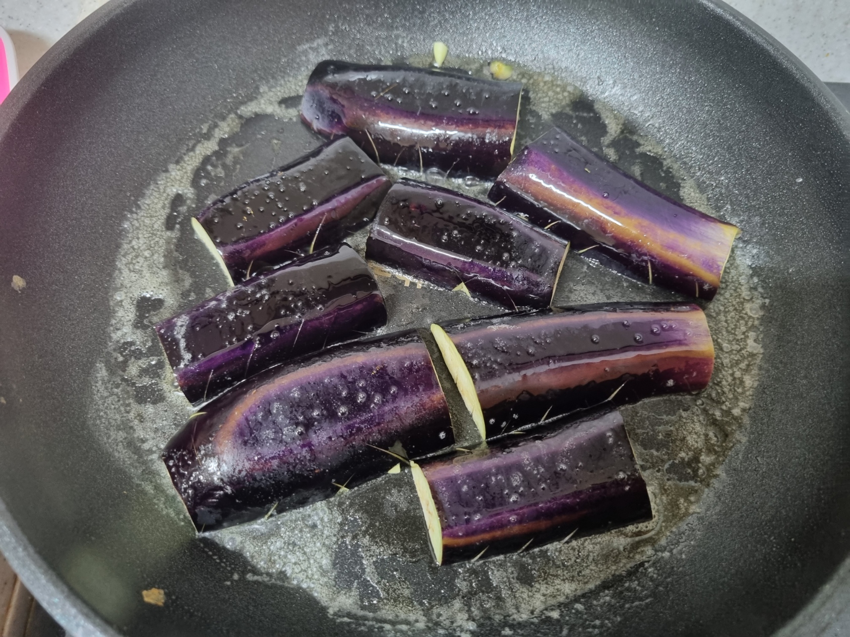 달궈진 팬에 버터를 넣고 칼집 넣은 가지를 구워요.