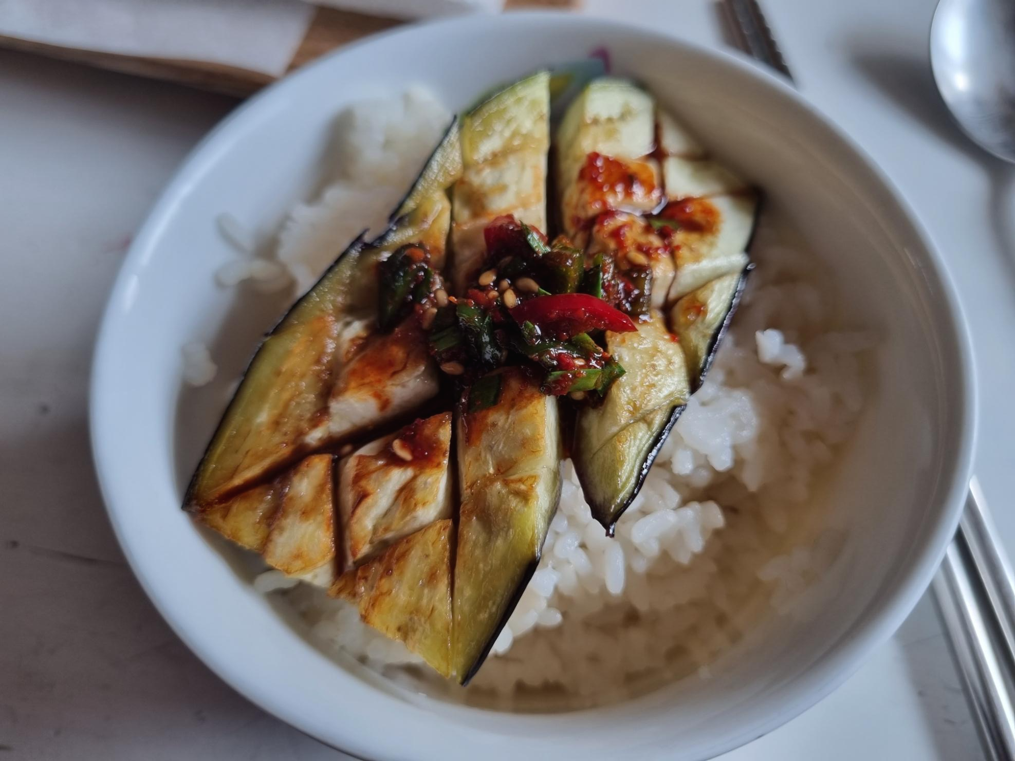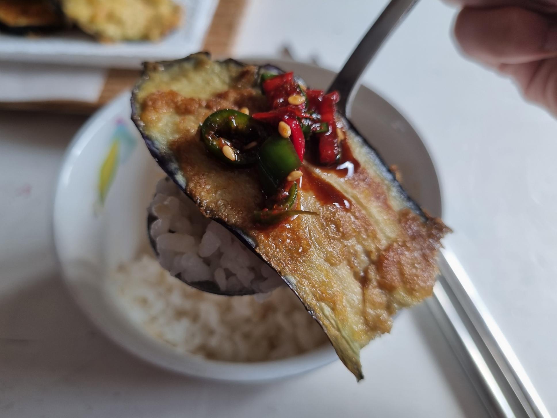 밥 위에 가지 부침 하나 올리고 양념간장 올려서~