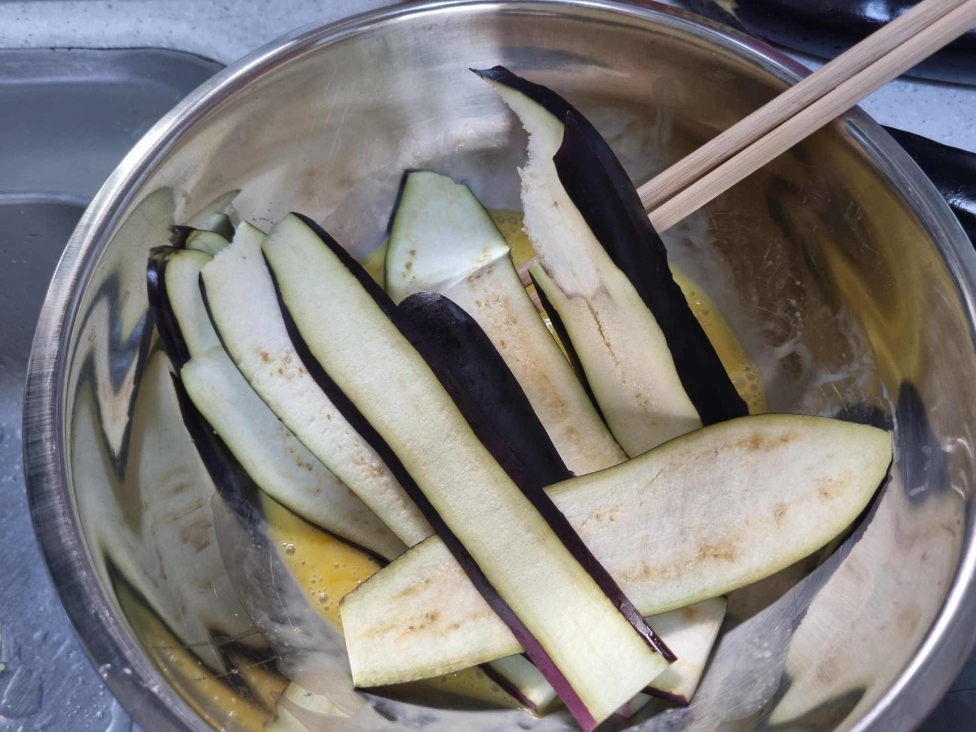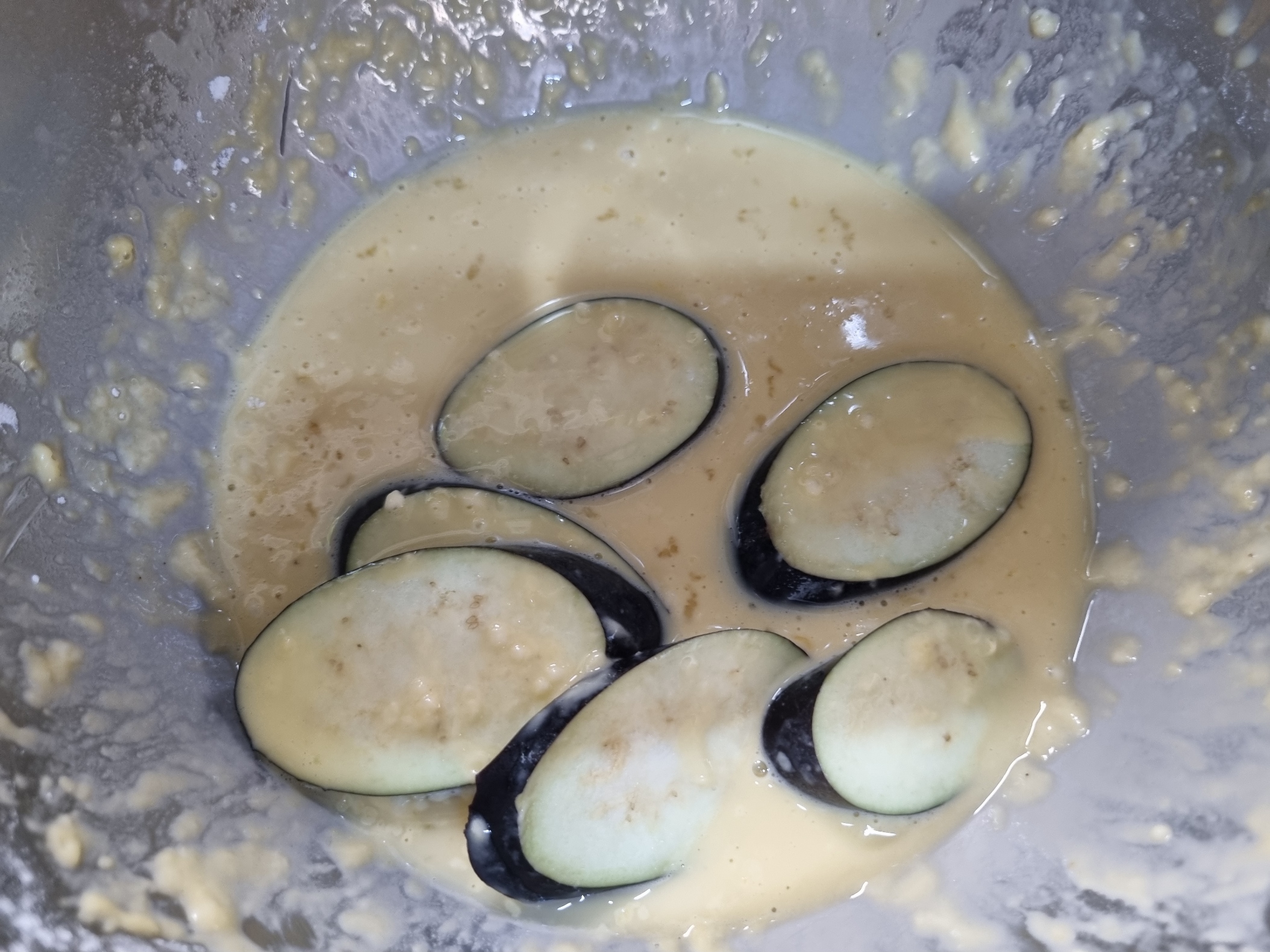가지를 모두 계란물에 퐁당 넣어요.