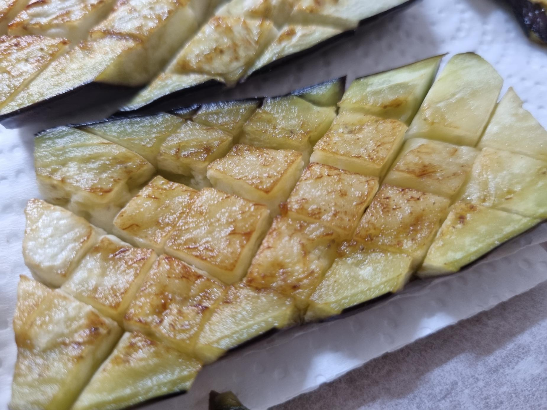 달궈진 팬에 버터를 넣고 칼집 넣은 가지를 구워요.