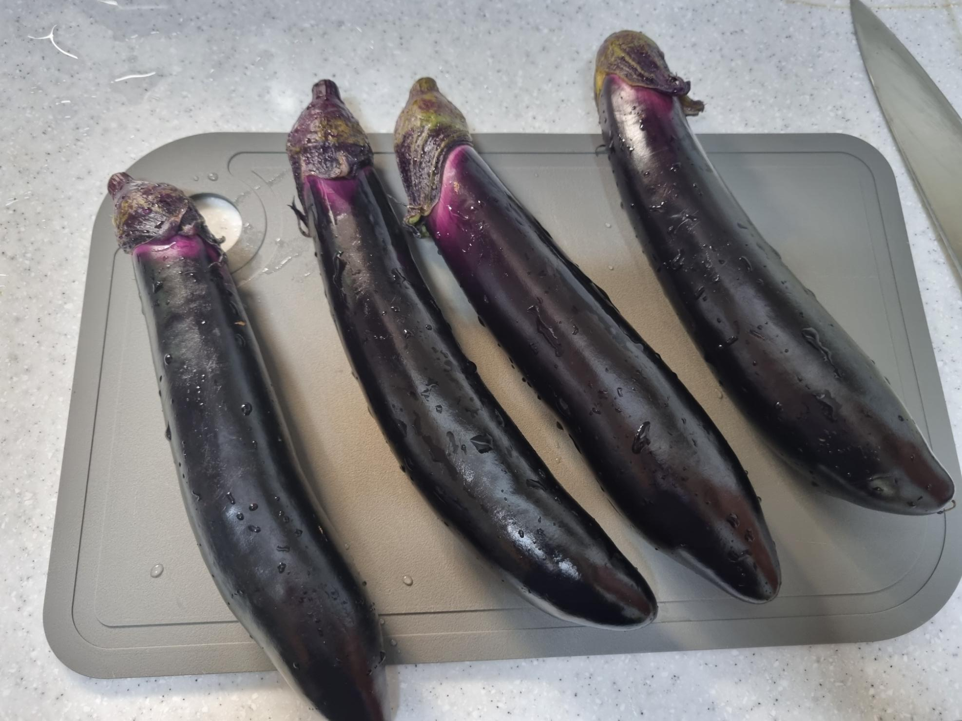 가지를 씻어요.