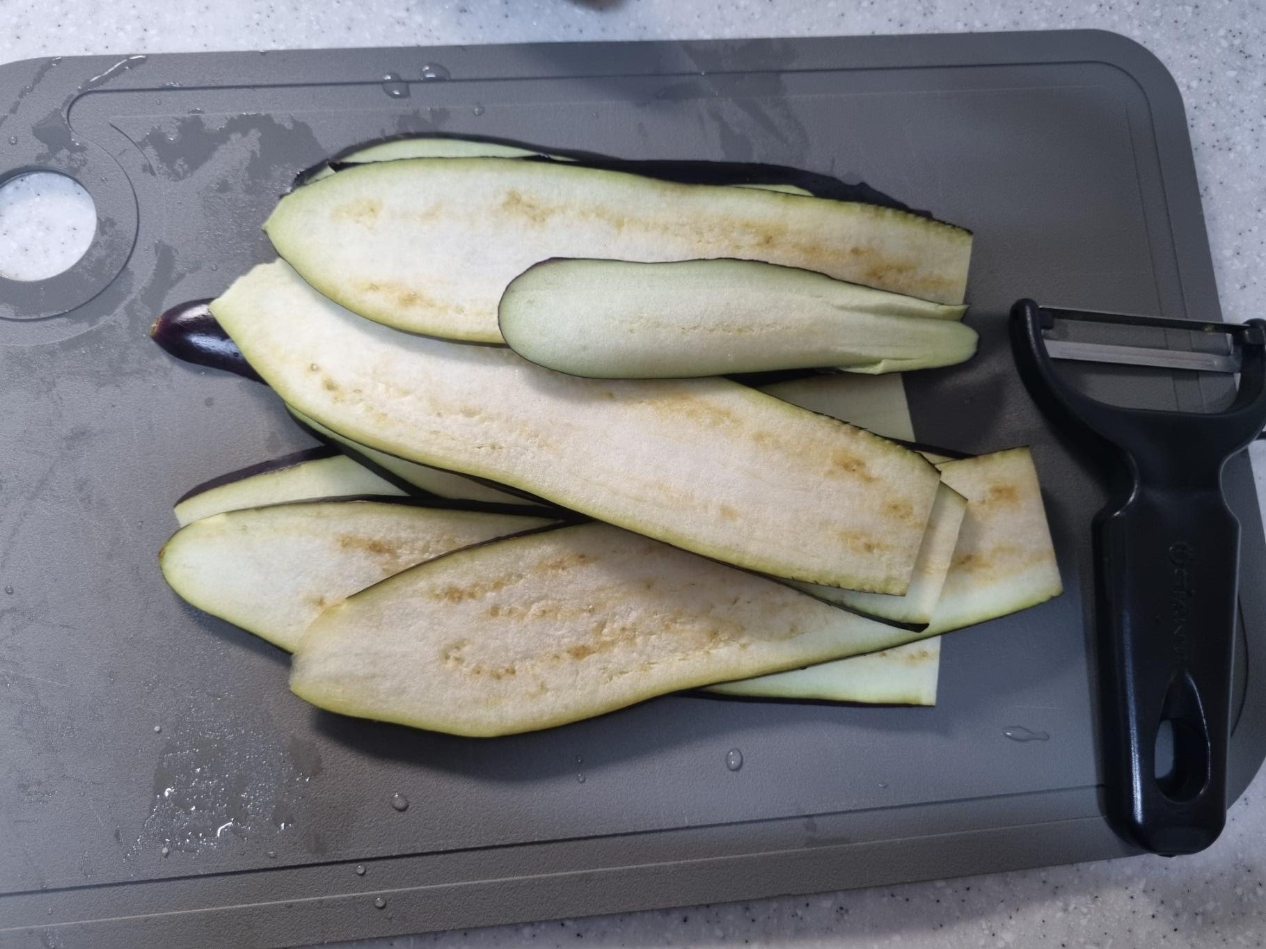 감자칼로 가지를 잘라요.