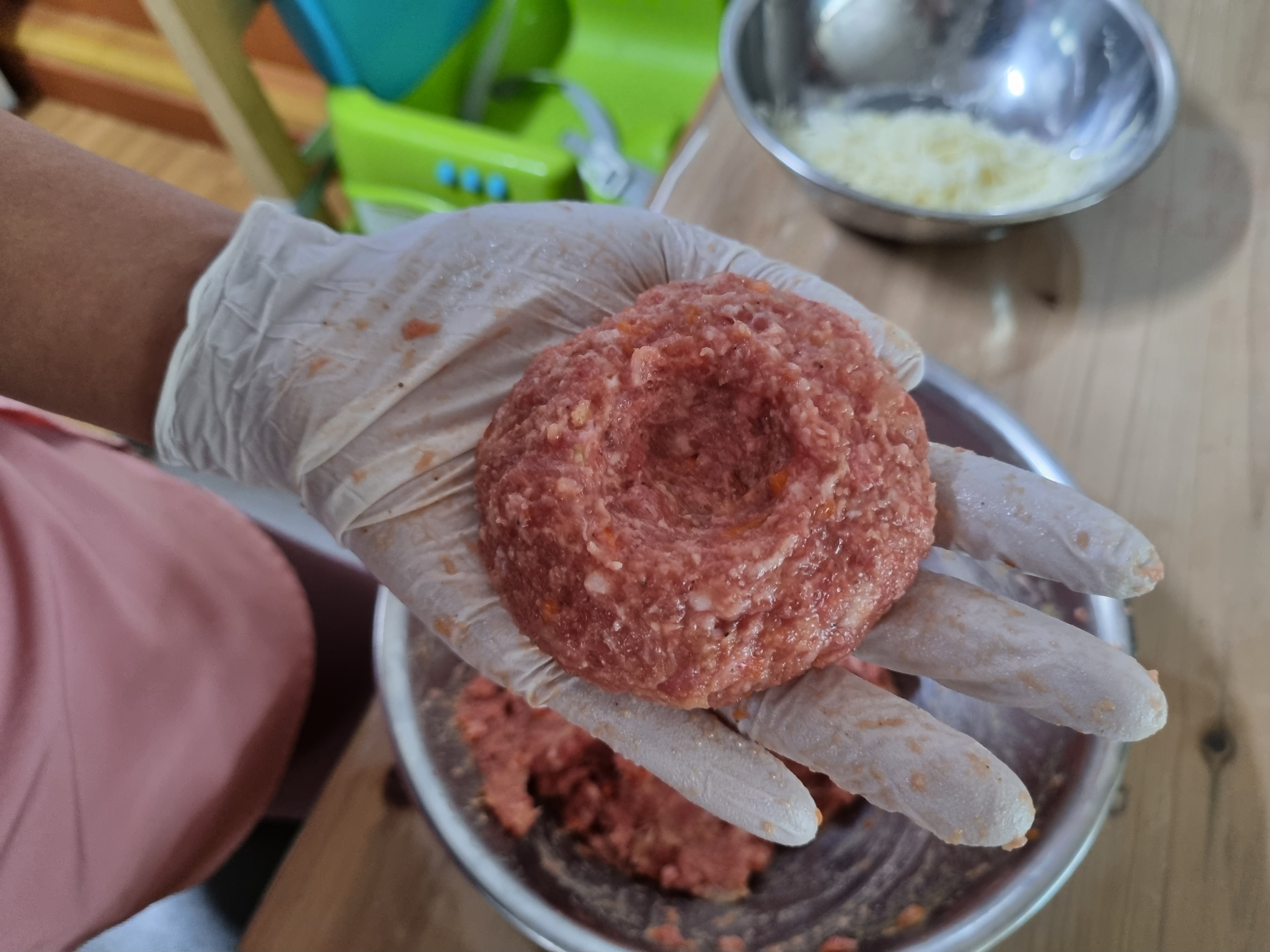 이제 함박스테이크 모양을 만들어요. 슬기로운 산촌생활에서도 가운데 구멍을 만들더군요. 그래서 저도 그냥 따라 했어요. 이렇게 만들면 익힐 때 부풀어 오르지도 않고 더 잘 익힐 수 있다고 들었던 거 같아요. 정확히는 잘 몰라요. 그냥 남들도 이렇게 만드니깐 따라 해 보는 거예요.