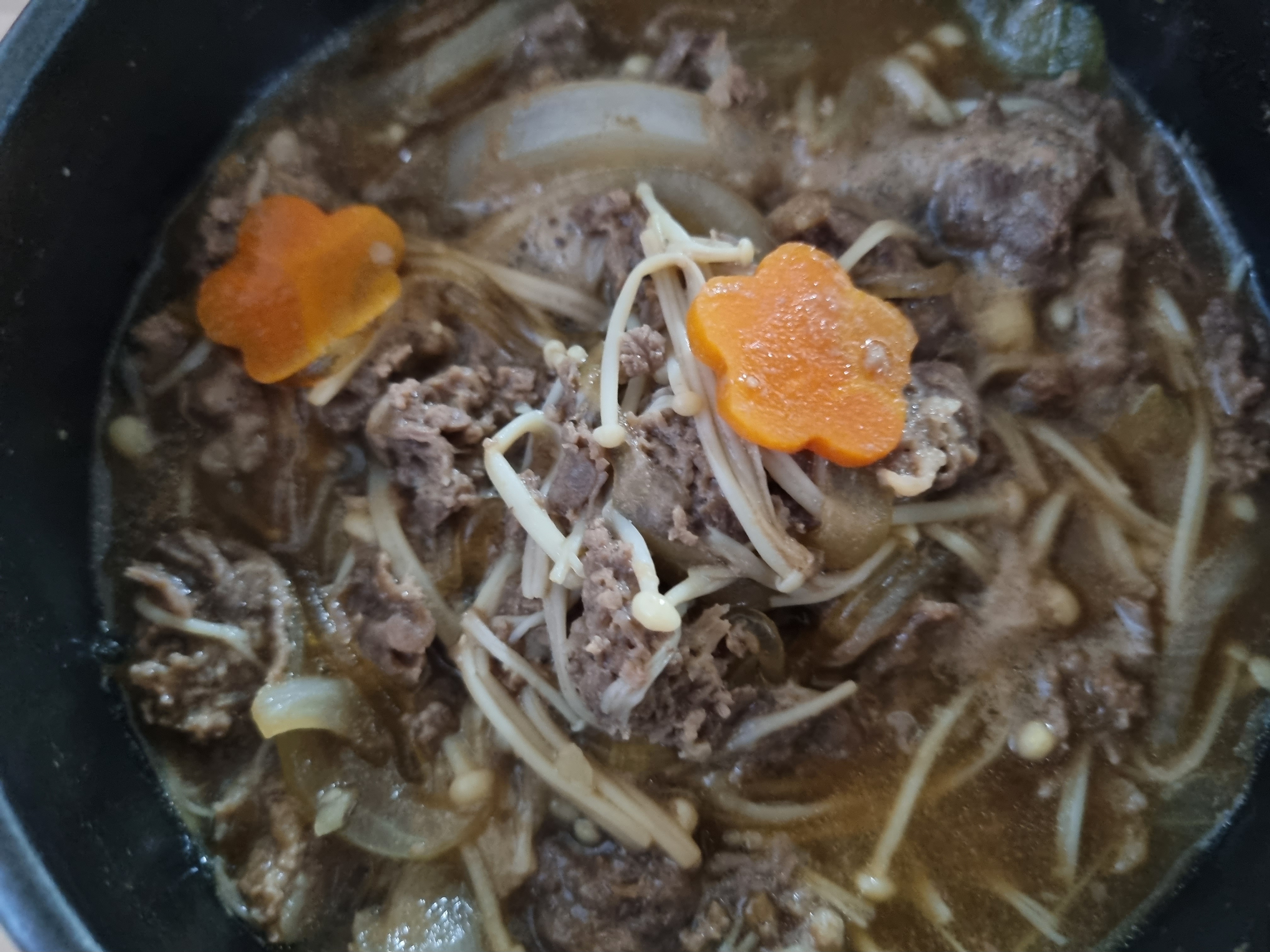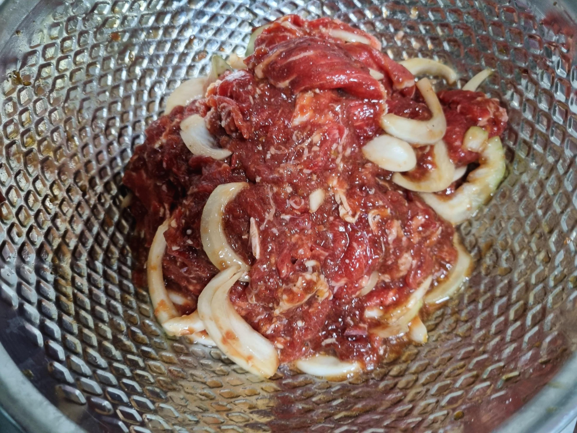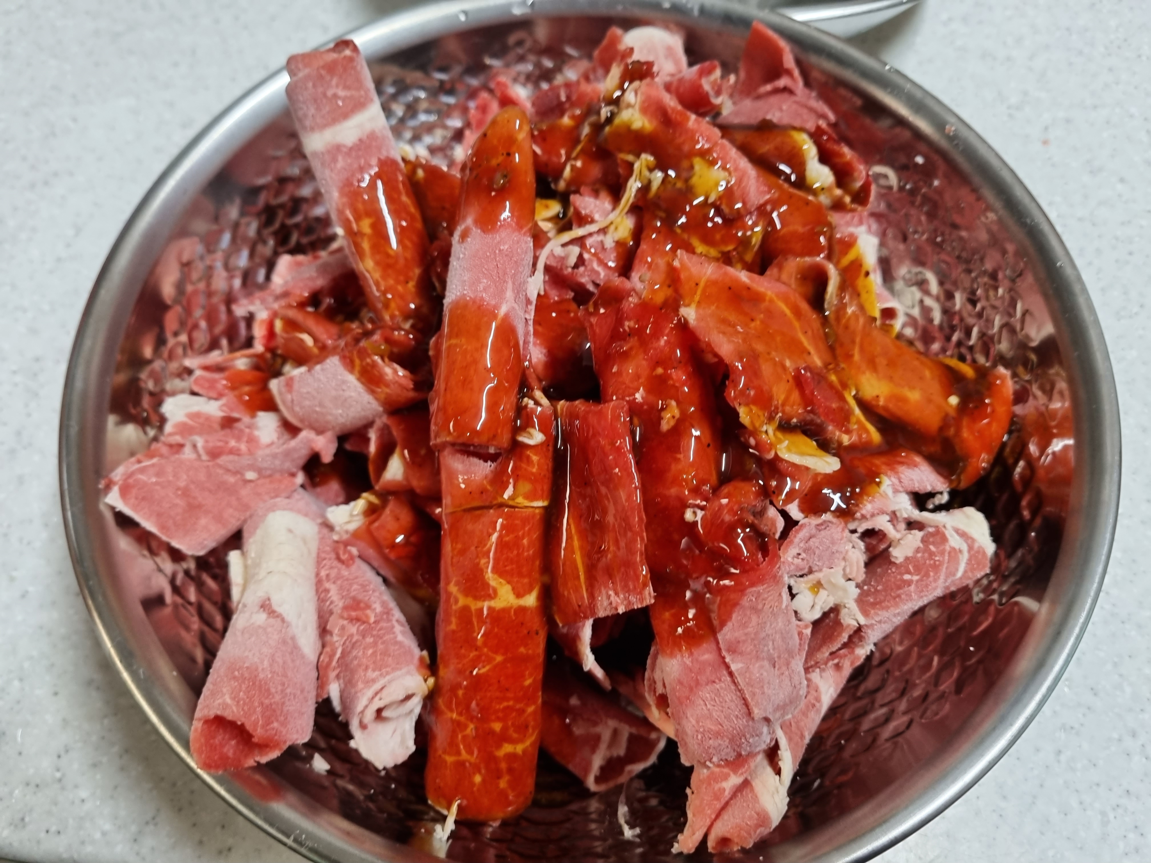 샤브용 고기에 노브랜드 홈스타일 소불고기 양념 한 봉지를 다 넣었어요. 고기도 약 500g 정도 됐던것 같아요.