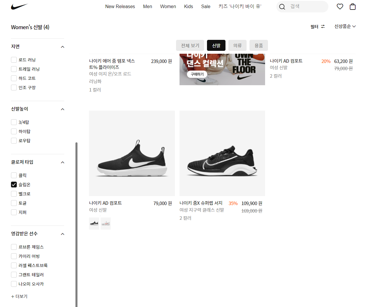 나이키 공식몰에 들어가 봤더니. AD 컴포트 올블랙은 없네요. 공식몰에서 살까 말까 고민을 하지만 신발은 꼭 신어보고 사야해요. 그래서 내일부터 집 주면 나이키 매장을 모두 돌아야 돼요. 바빠요ㅡㅡ;;