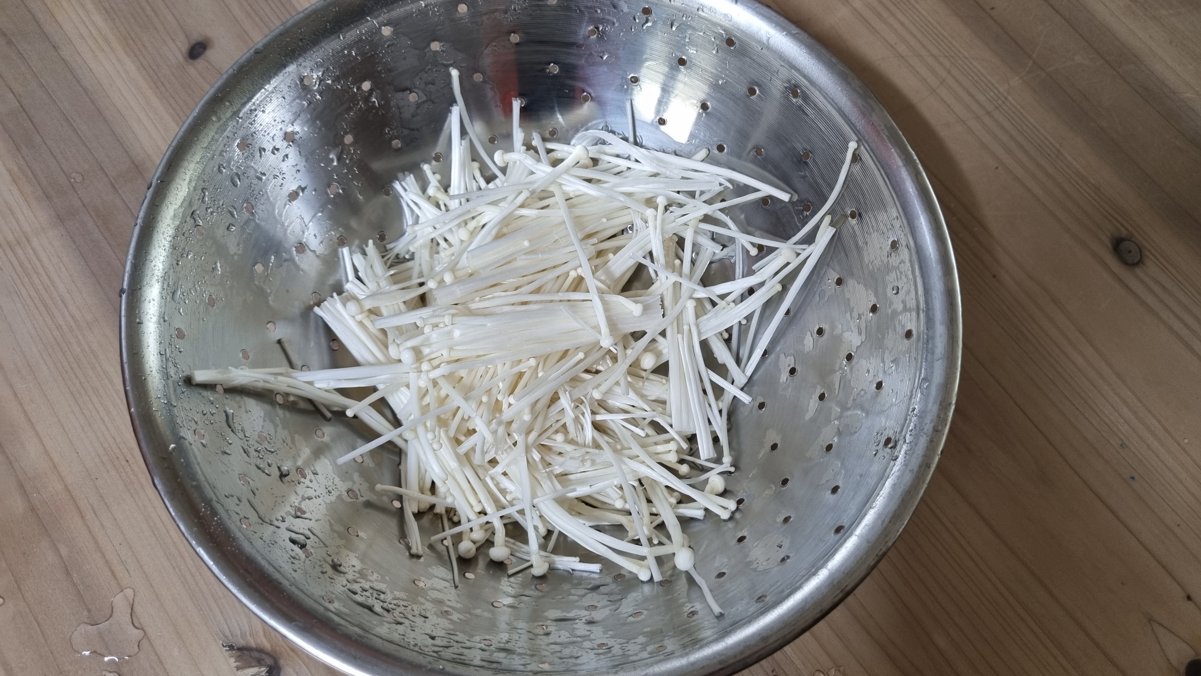 팽이버섯도 준비해요. 팽이버섯은 1 봉지 500원, 3 봉지 1,000원이라 꼭 3 봉지를 사게 돼요. 언제나 늘 남아서 냉장고 한켠에 굴러다녀요. 썩어 문들어지기 전에 버섯전에 넣을 생각이에요.
