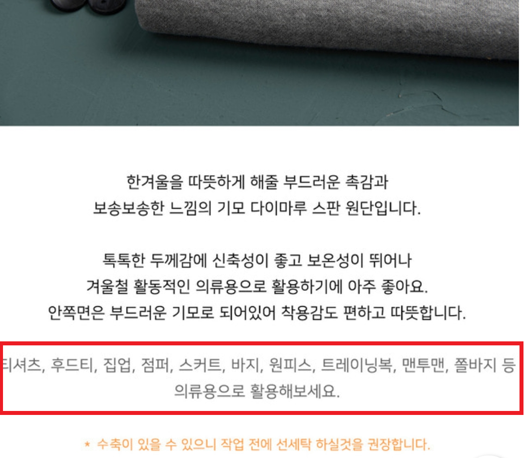 원단을 잘 모르는 초보 미싱사에게 원단 고르는 일은 쉽지 않아요. 모니터 화면으로 아무리 봐도 어떤 원단 인지도 모르고 두께감도 감이 오질 않아요. 그래서 원단 설명을 비교적 잘 설명해둔 쇼핑몰에서 구매를 해요. 위의 사진은 유명한원단 쇼핑몰을 캡처한 사진이에요. 사진에서도 알 수 있듯이 매우 친절한 설명이 있어요. 어떤 용도에 맞는지, 어떤 계절에 적합한지, 혼합 율도 잘 표시돼 있어요. 이런 쇼핑몰을 활용하는 것이 초보 미싱사에게 굉장히 큰 도움이 돼요.