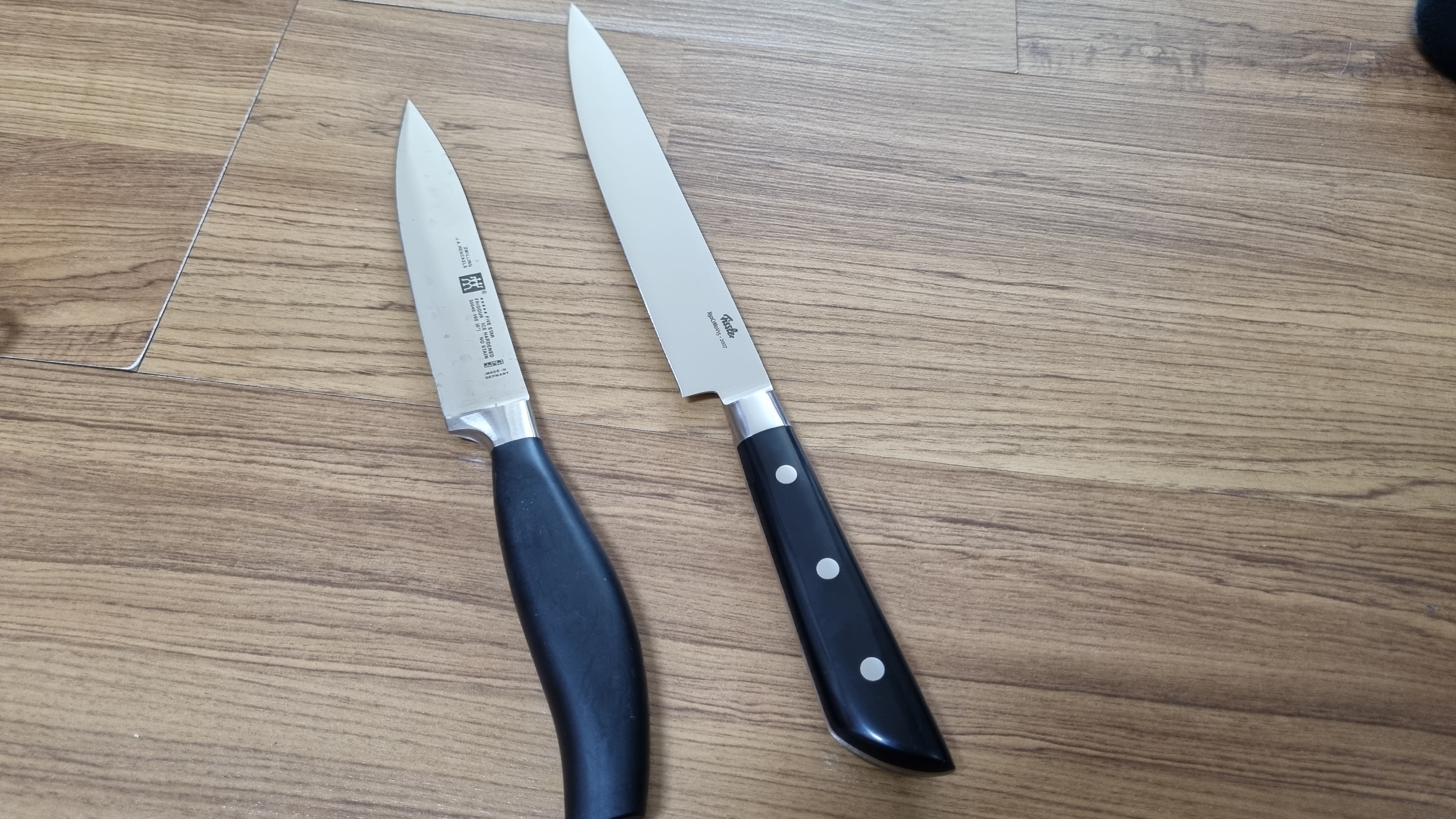위쪽 휘슬러 식도, 아래쪽 헹켈 식도예요. 헹켈은 메탈 볼스터가 있어요. 메탈 볼스터가 있으면 때도 끼지 않고 무게 중심을 잡아 손목의 피로를 덜어준다고 해요. 손목이 아플 정도로 칼을 오래 사용하지 않아서 손목이 아팠던 적은 단 한 번도 없었어요. 제가 갖고 있는 휘슬러 식도에는 메탈 볼스터가 없어요. 그래서 그런지 휘슬러 식도를 잡으면 엄청 날렵한 느낌이 들지만 헹켈은 엄청 안정감이 들어요. 메탈 볼스터가 있는 게 더 안전하다곤 하는데 감자채 썰때 걸리적거리기도 해요.