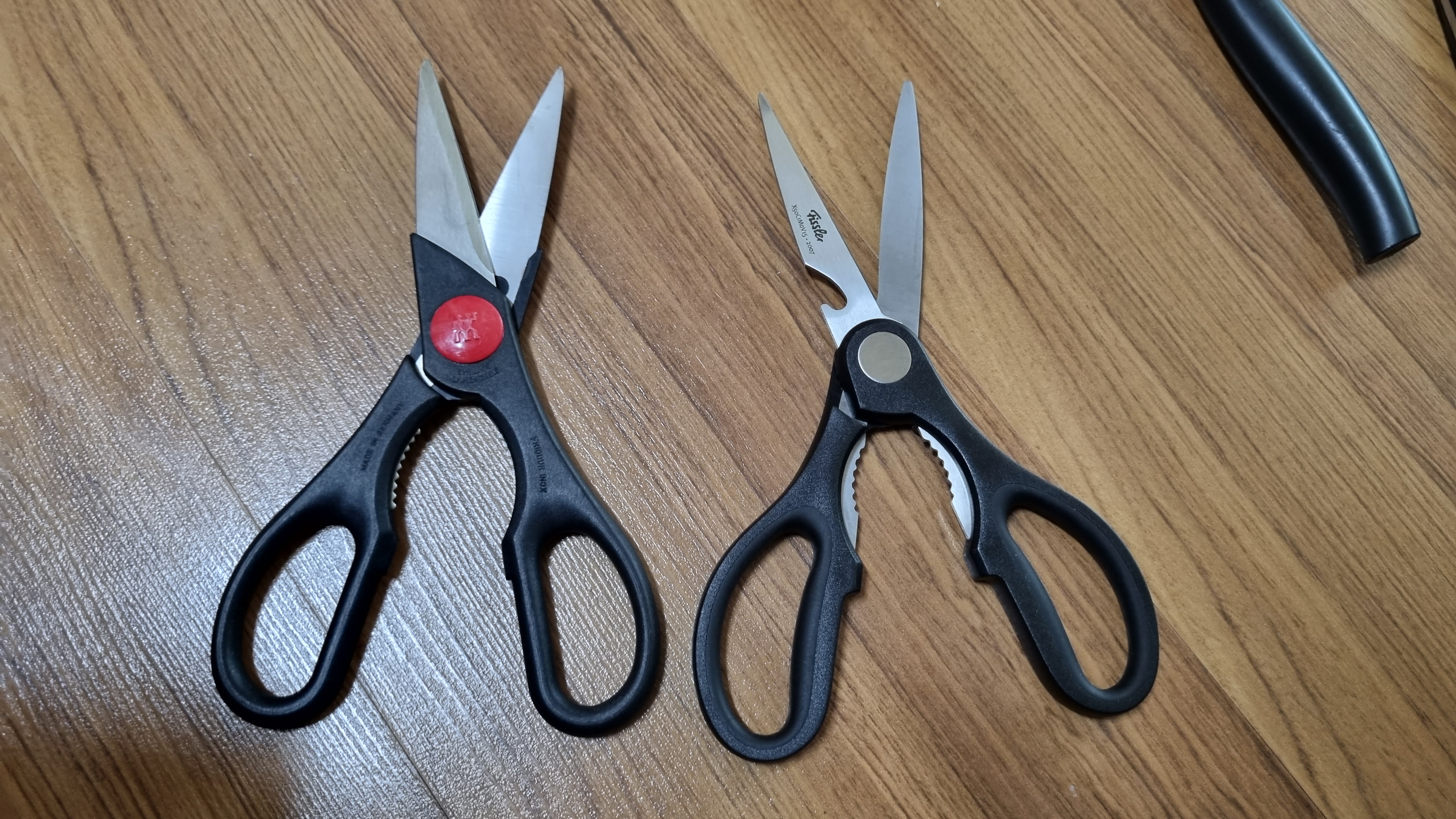 왼쪽 헹켈 가위, 오른쪽 휘슬러 가위예요. 느낌은 휘슬러가 좋아요. 휘슬러가 더 가벼워서 사용하기도 편하고요. 절삭력은 둘 다 비슷해요. 헹켈은 5년이나 사용했음에도 불구하고 여전히 사용상 문제가 전혀 없다는 게 장점이에요.