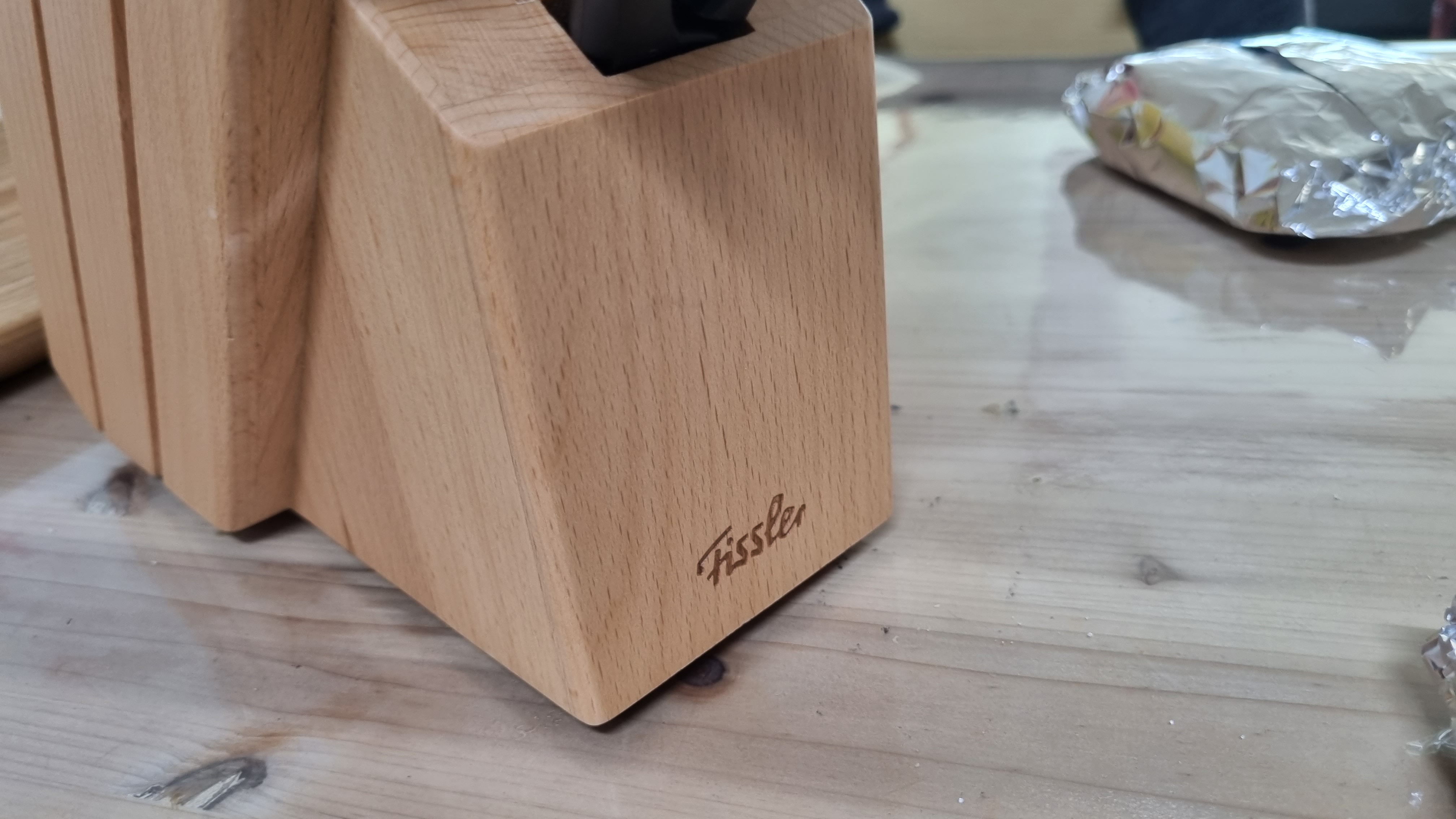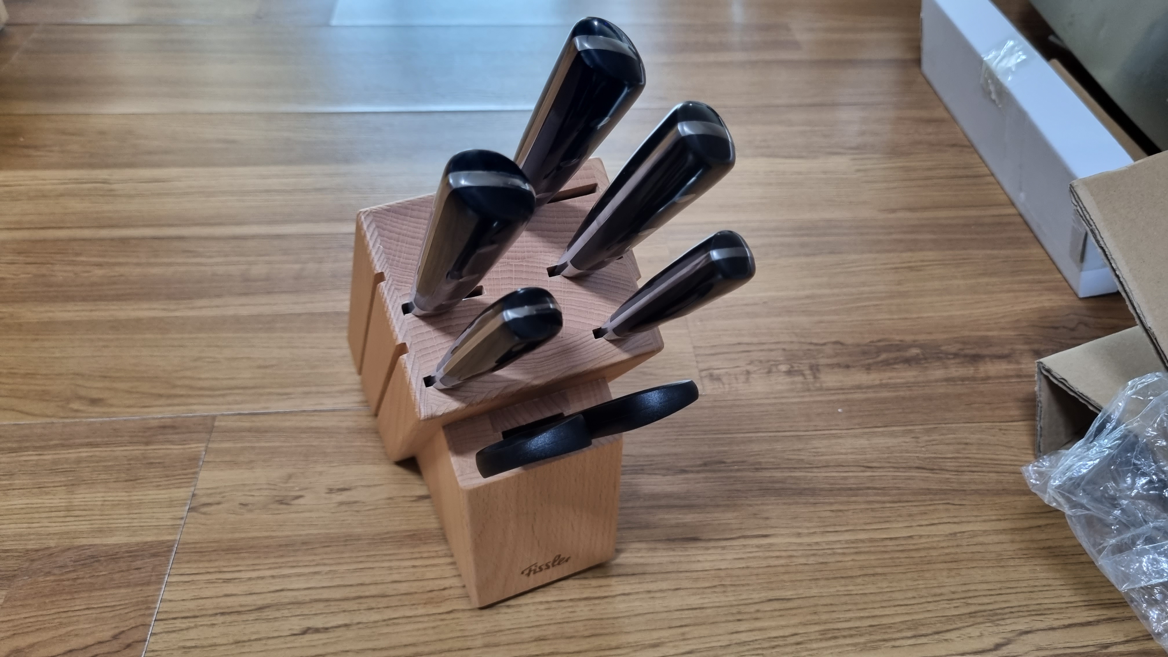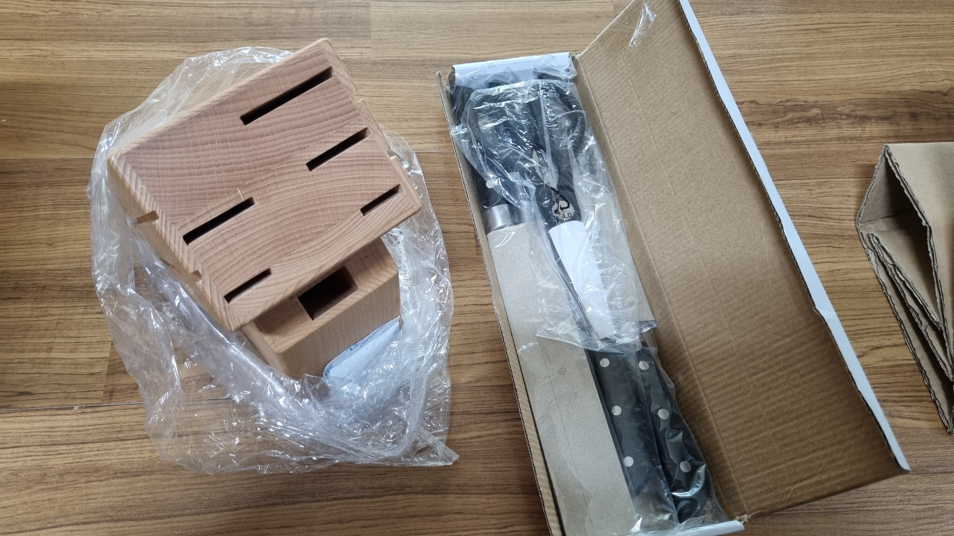 언박싱 시작해요. 일단 칼 블록이 들어 있어요. 굉장히 묵직하고 나무 블록으로 되어 있어요. 나무는 물과 상극인데. 칼 보관 블록이 스테인리스면 더 좋을 것 같아요.