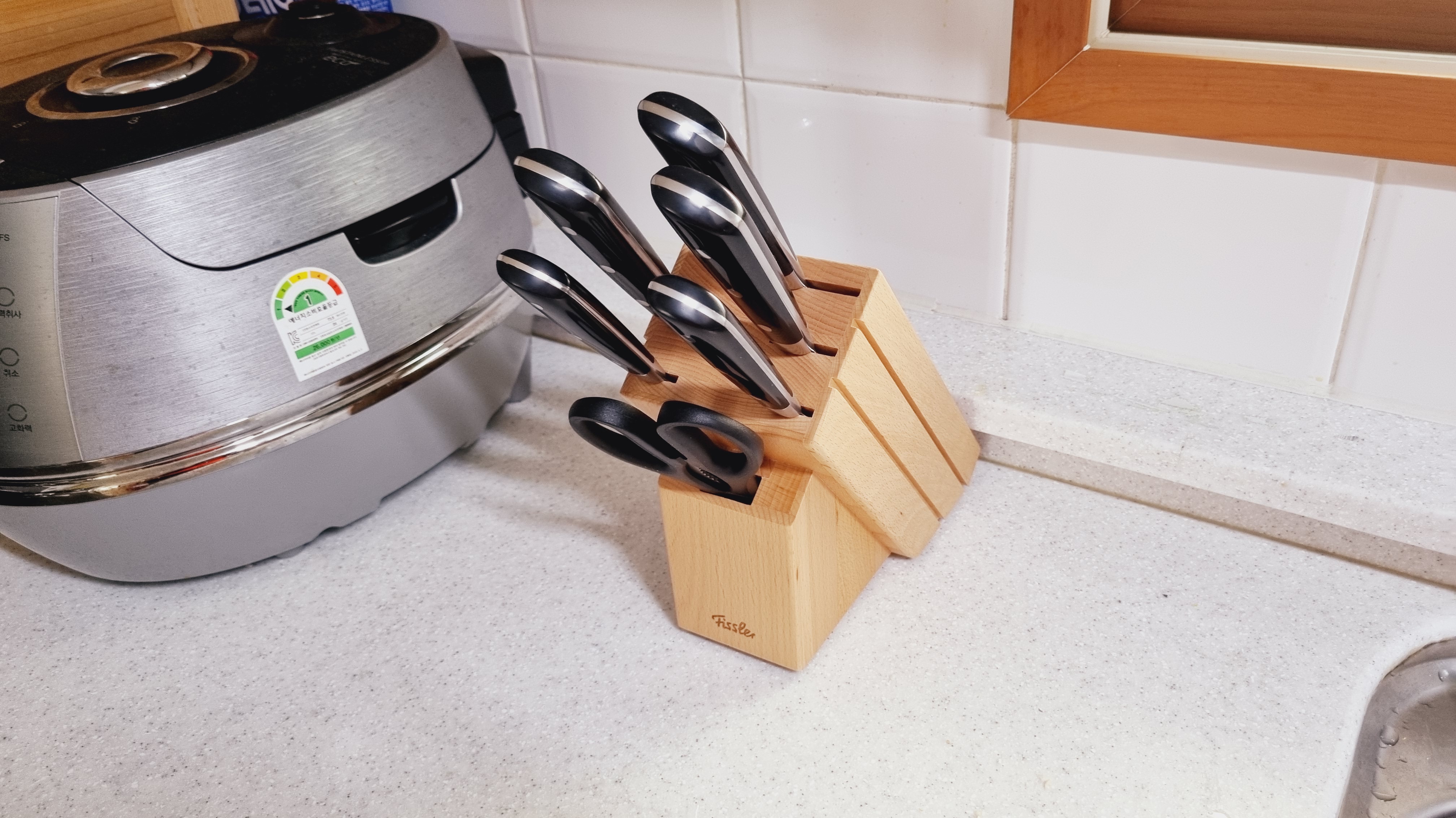 어디에 둘지 고민이네요. 나무로 만들어진 칼 블럭은 물에 닿으면 안 되거든요. 만약 물에 계속 노출 시키면 블록 망가져요. 설거지하면서 싱크대도 닦으려고 물 뿌리면 칼 블록에 당연히 물이 묻어요. 그렇게 몇 달 지나면 블록들이 하나씩 분리가 되면서 떨어져요. 그래서 어디에 보관할지 가장 큰 고민이에요. 싱크대 안이 가장 좋긴 한데.