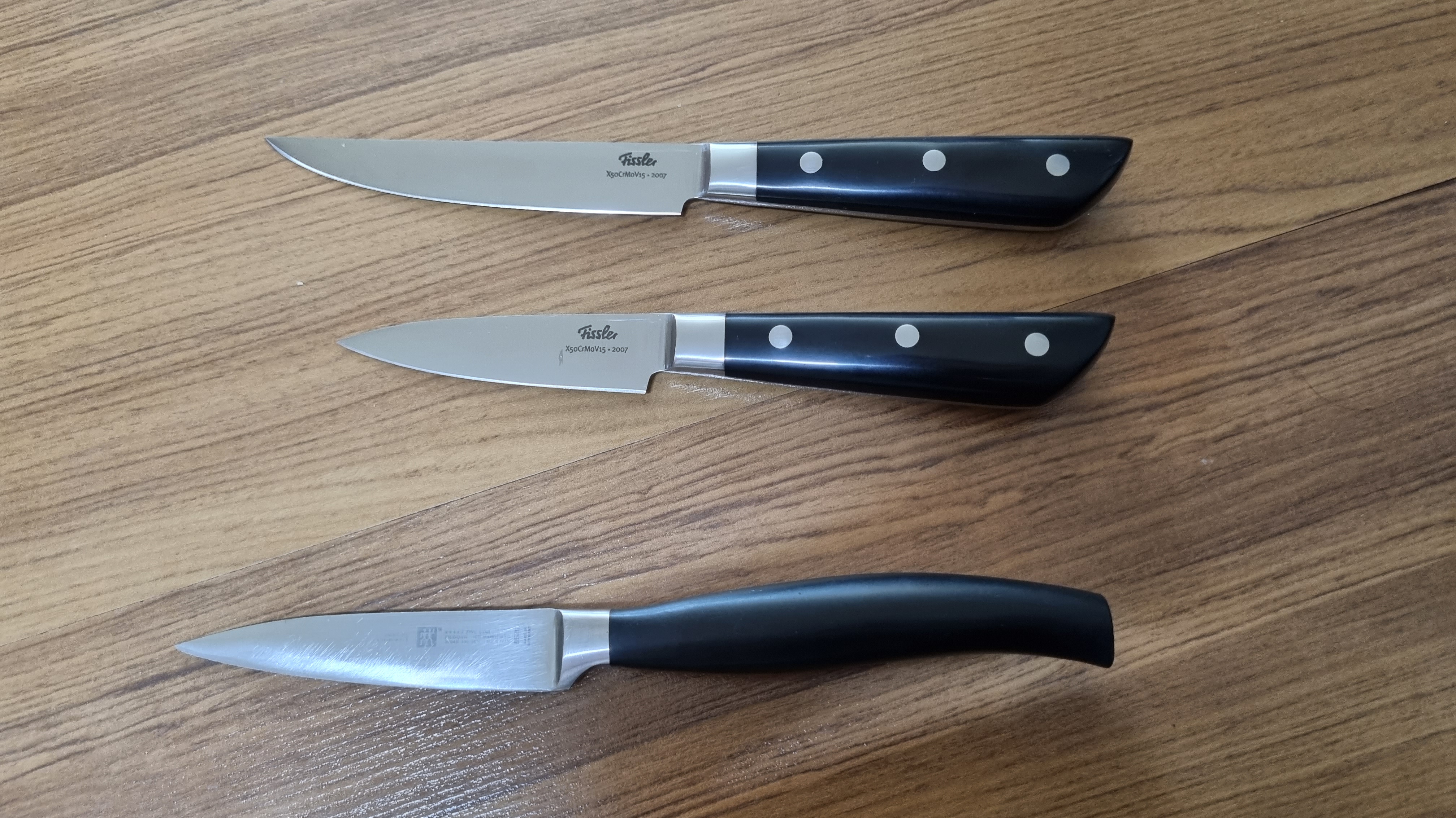 위쪽 2개는 휘슬러 과도, 아래는 헹켈 과도. 과도는 확실히 휘슬러가 편해요. 그립감도 좋고요. 하지만 이건 어디까지나 개인적인 느낌이라 사람마다 다를 수 있겠죠.